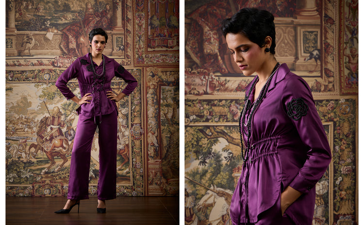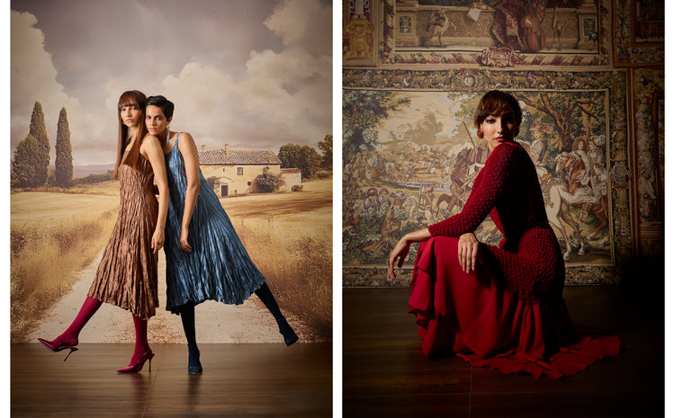 This collection is a celebration of rustic grandeur and timeless artistry. This season, our Autumn-Winter collection unfolds in a dreamscape of burnished silver, deep burgundies, moss greens, and the quiet dawn of browns- an ode to fall’s richest tones and textures. Photographed against the sun-drenched wheat fields of Tuscany and the opulent weave of Aubusson tapestry, echoing the artisanal past with a modern grace. This is autumn dressed in poetry.