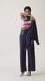 Demi Applique Set - PurpleA Contemporary evening wear set featuring a shirt crafted in luxe satin, hand beaded rosettes and cinched waist with adjustable drawstrings paired with straight leg pants - chic, structured, and effortlessly stylish ! The model is 5.9 ft. Need help with sizing and color...