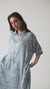Aaina Tunic Set - Slate BlueElegant V-neck Kaftan style Tunic with cinch detail at waist and paired with matching narrow leg pants. Crafted in a soft muslin blend printed all over with metallic silver foil speckles . The Kaftan tunic also doubles as a dress, easy resort wear and...