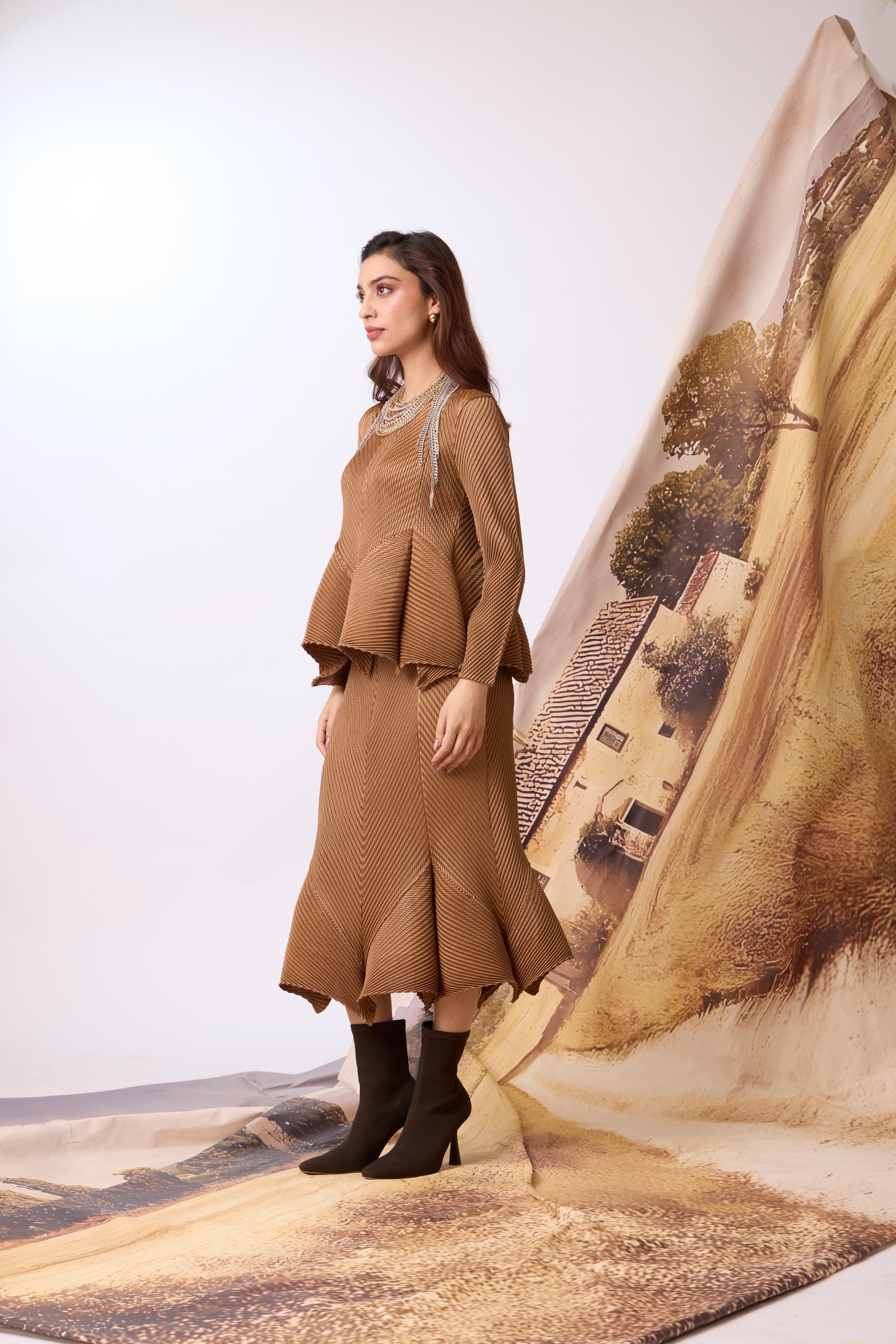 Soft pleated skirt and top set with peplum structure created by godet inserts.