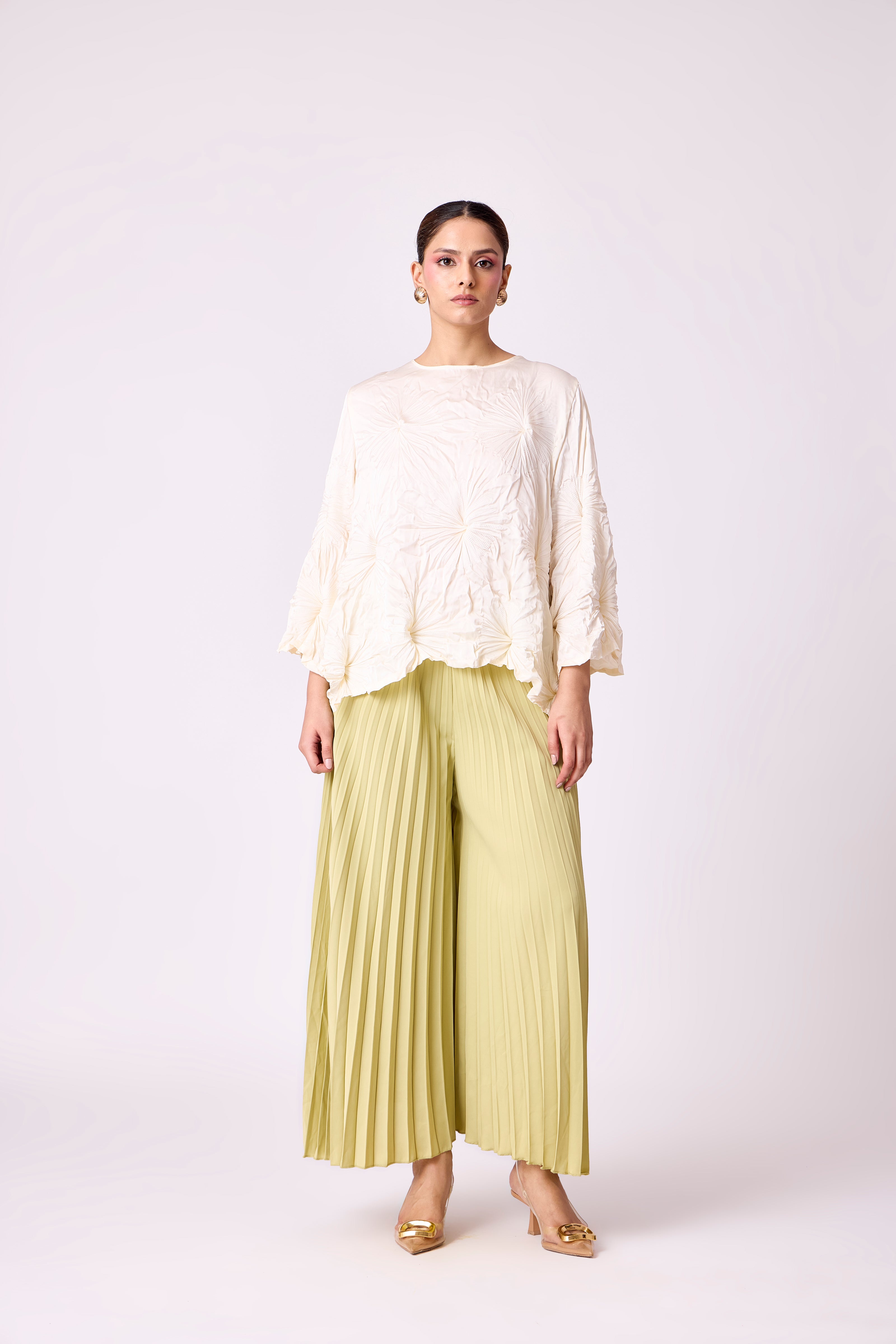 Pleated clothing expand to accommodate a variety of body sizes. Due to their texturing they do not cling or accentuate body parts.
