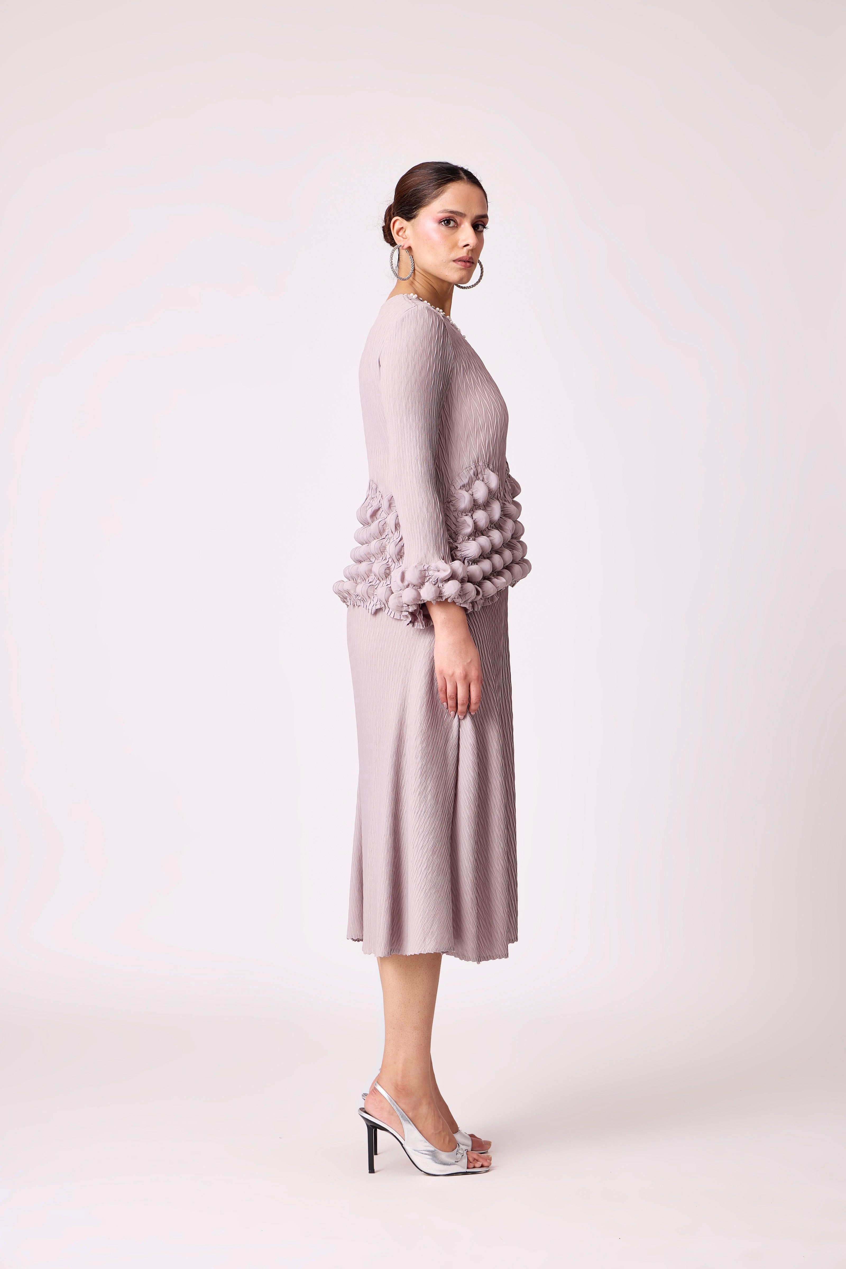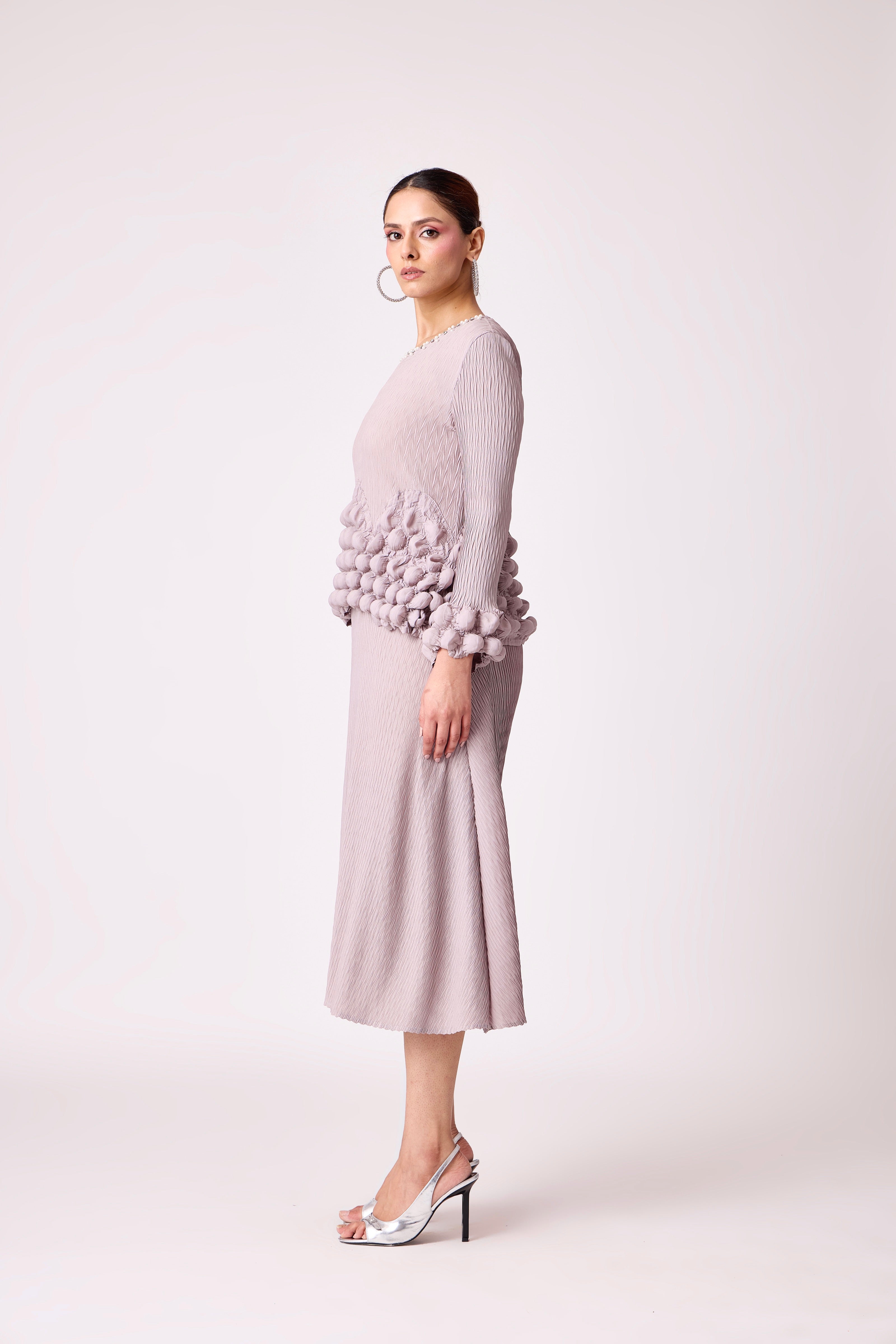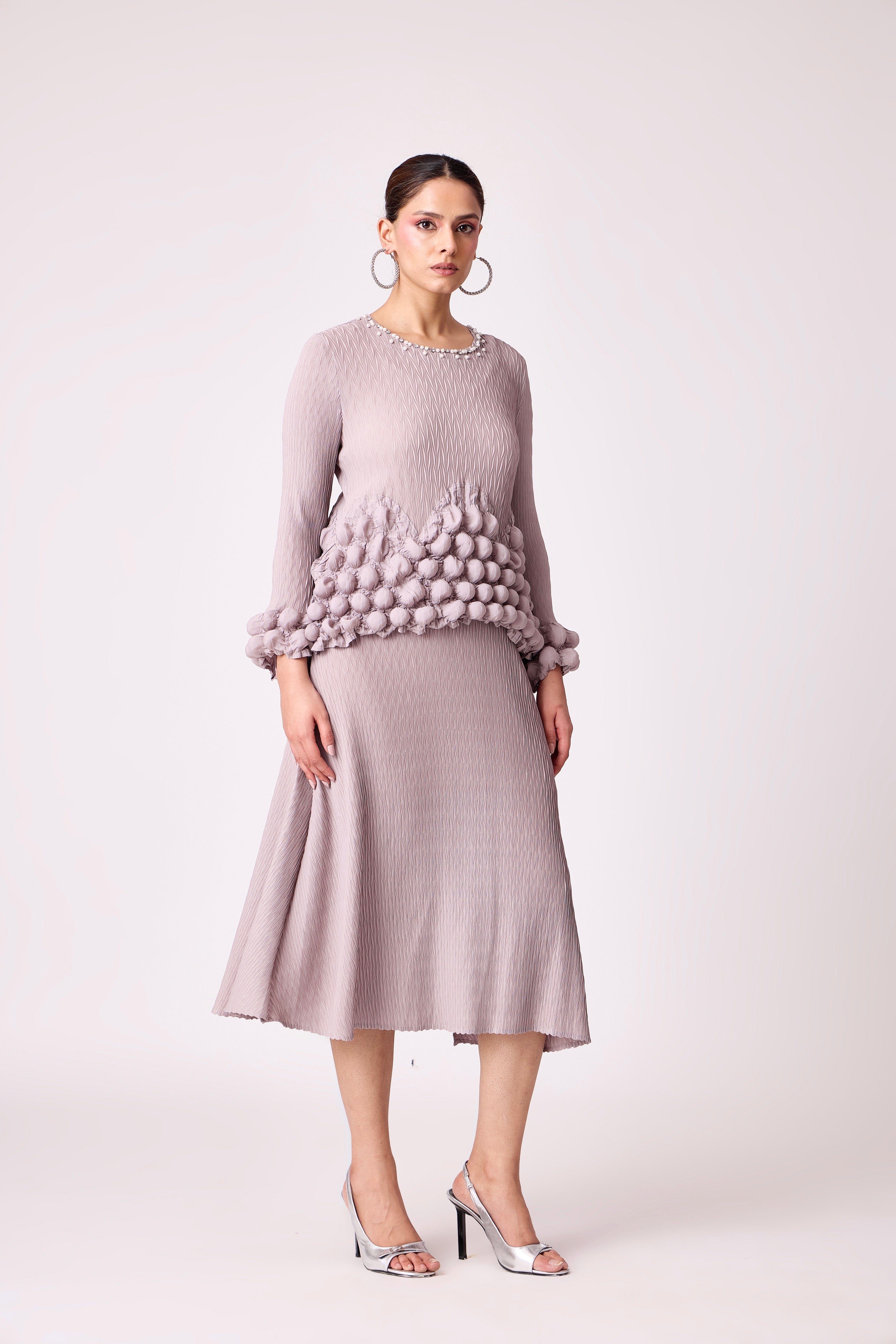 Splatter and tiny dots and print imprints on pleated garments are part of the pleating process, especially on light colors can not be avoided. These are not considered garment defects as due to nature of the pleating process, it is impossible to avoid mild anomalies.