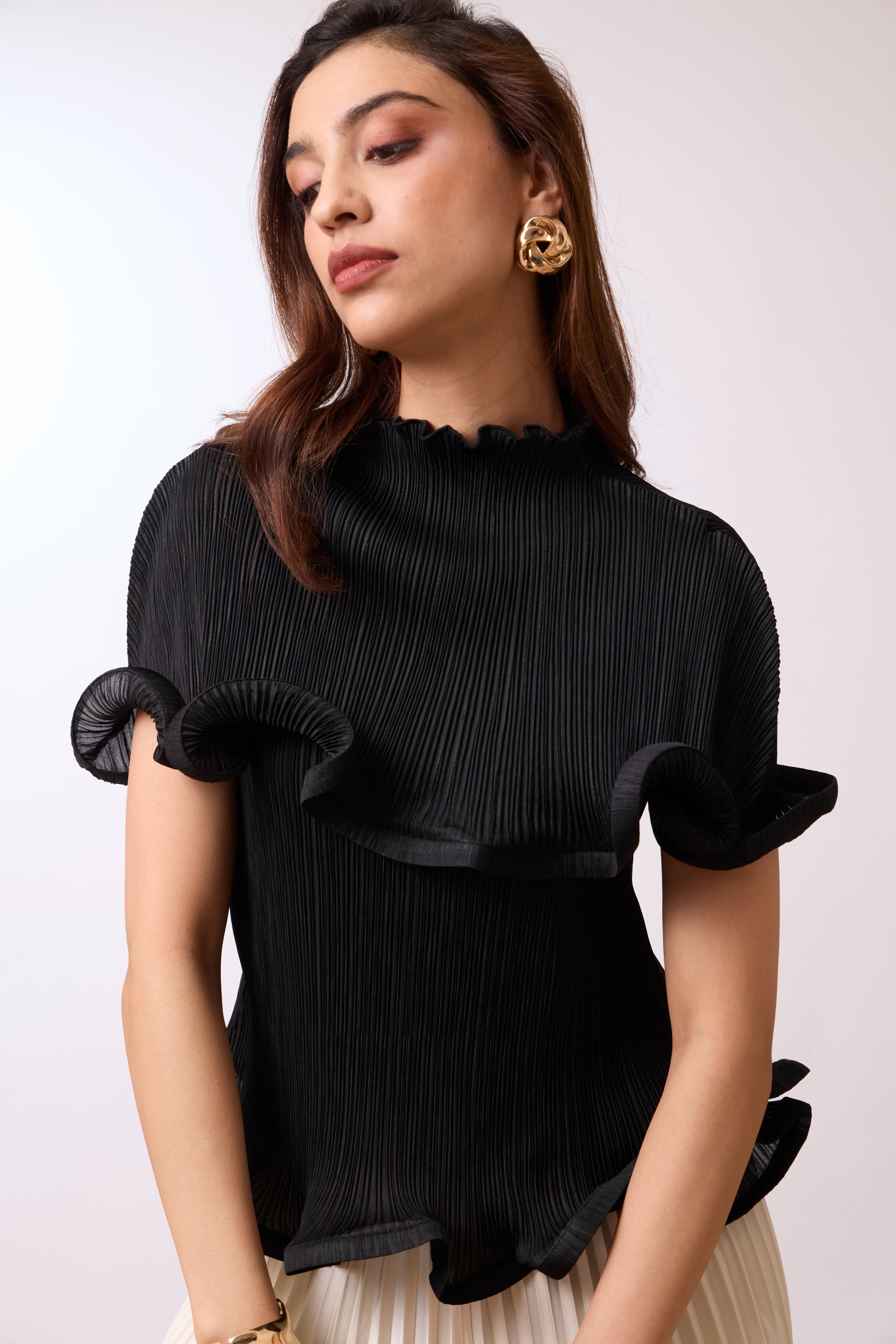 A statement ruffled hem pleated evening wear top. Pair with formal trousers, satin skirts or even Indian lehengas for a striking contemporary look.