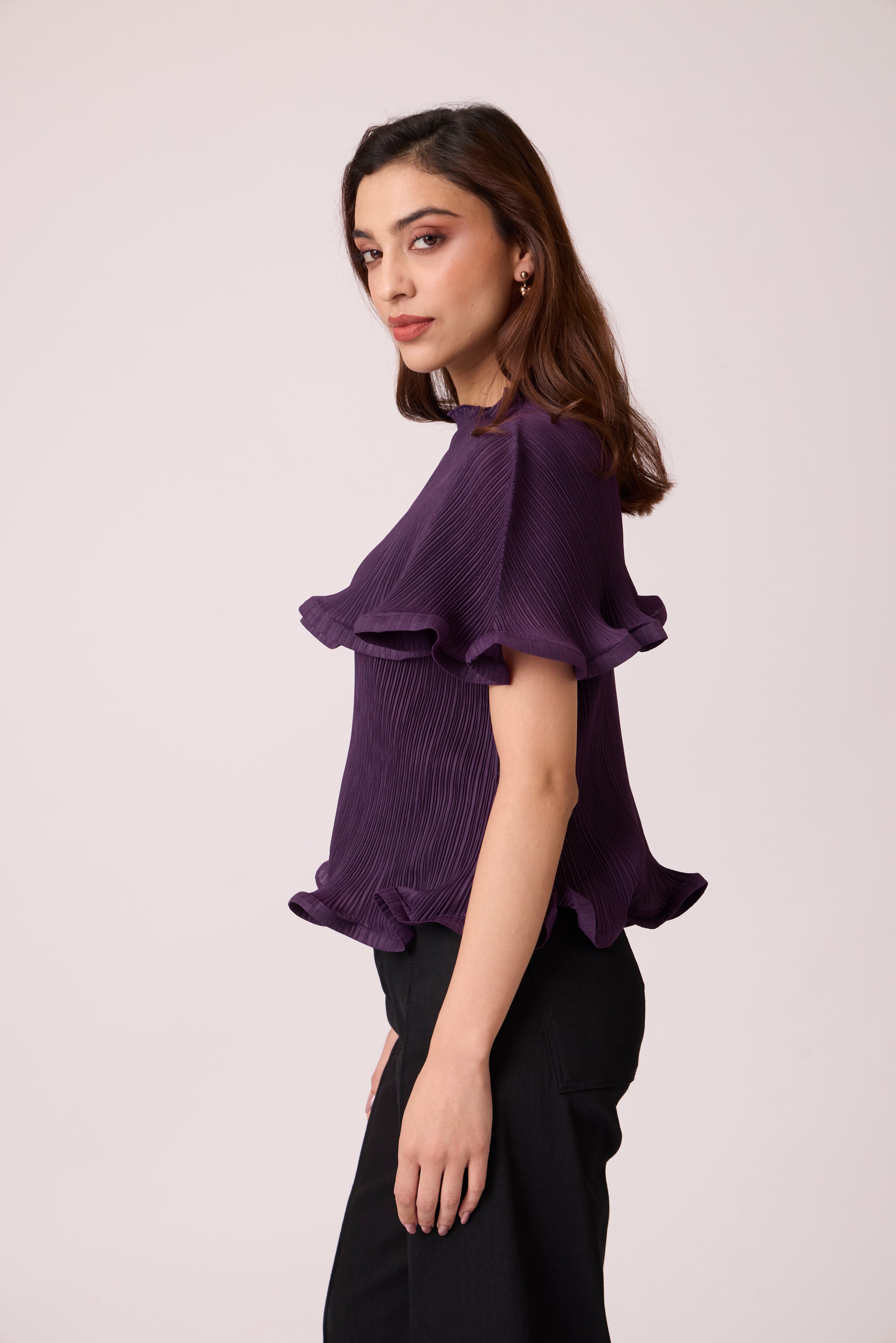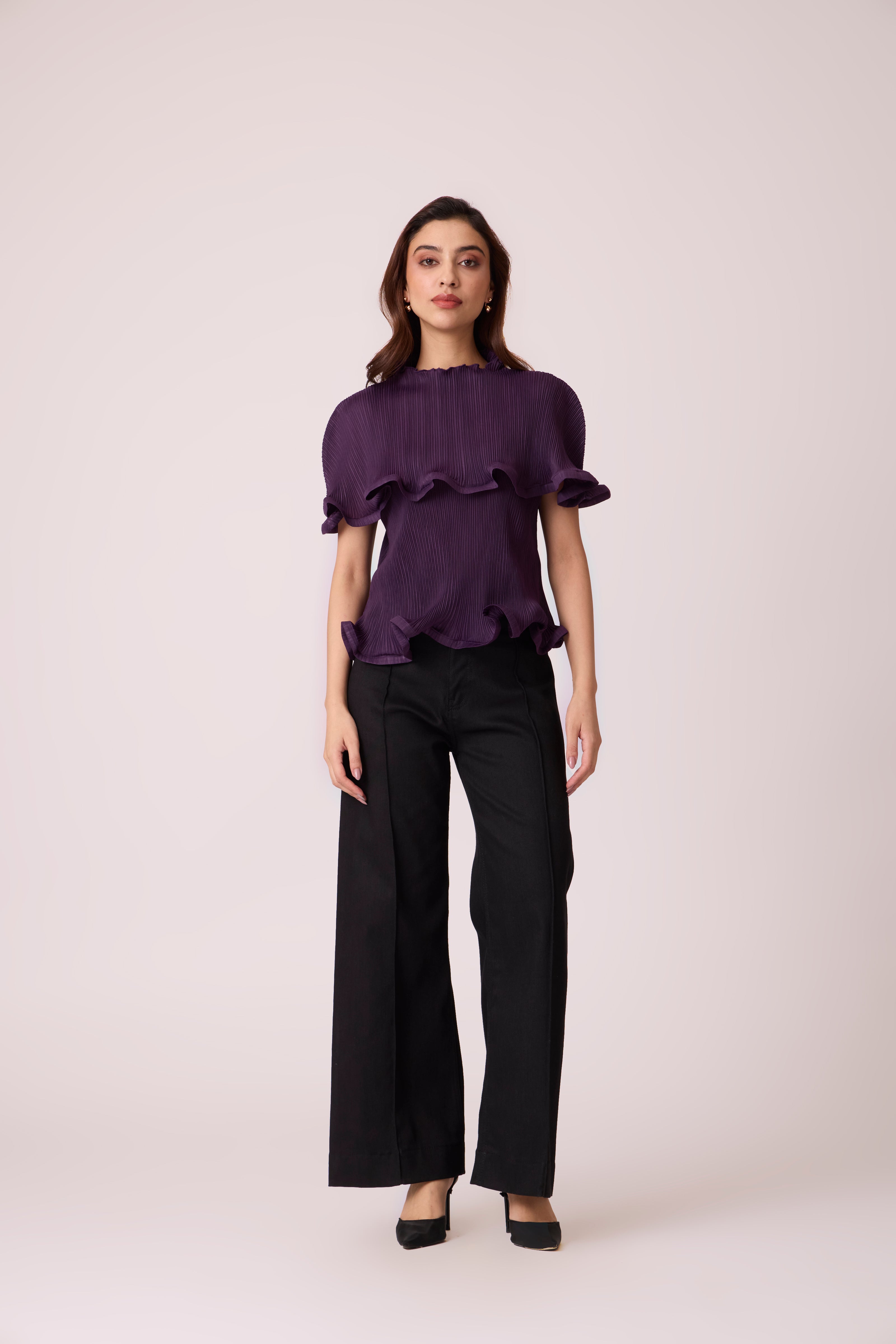 A statement ruffled hem pleated evening wear top. Pair with formal trousers, satin skirts or even Indian lehengas for a striking contemporary look.