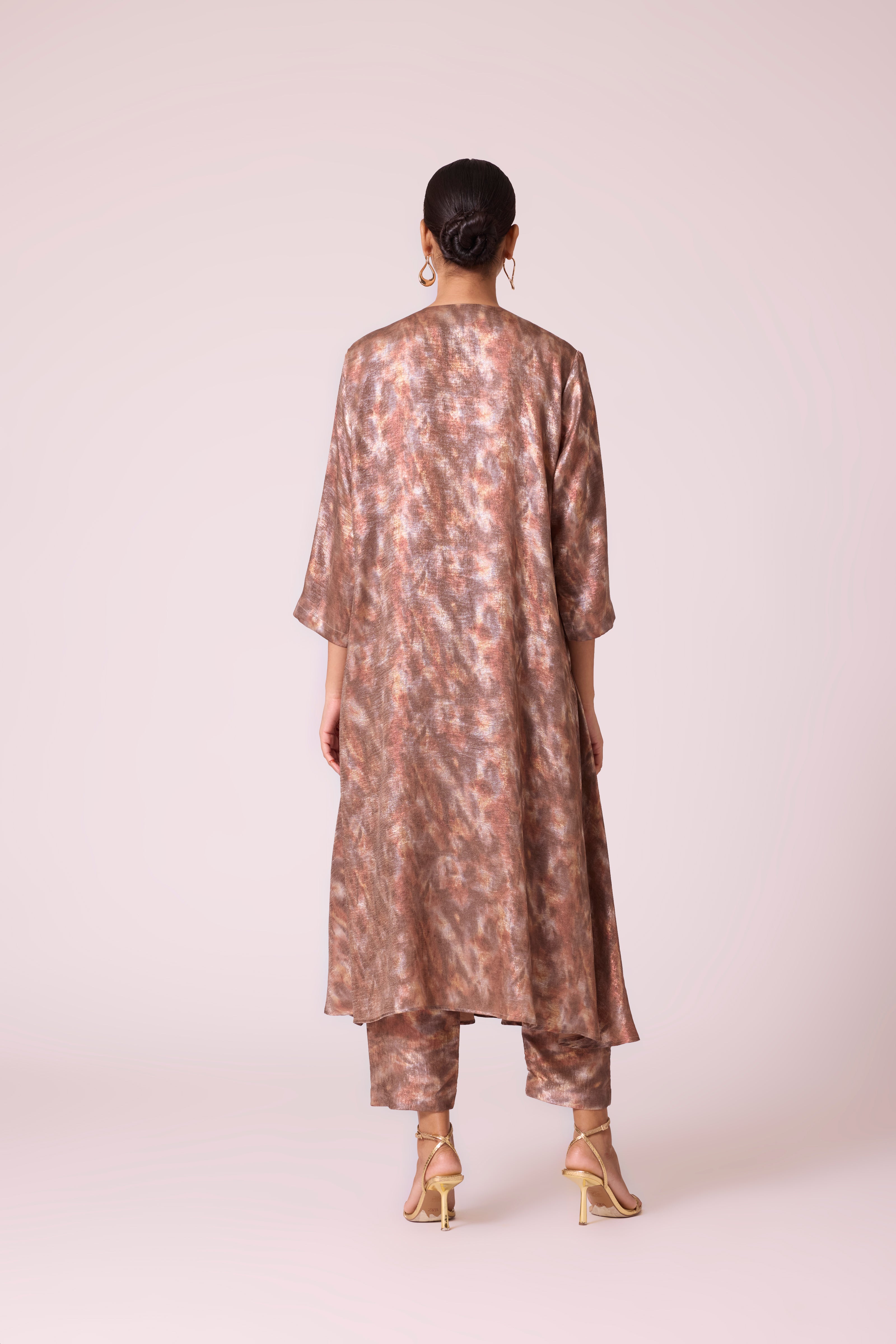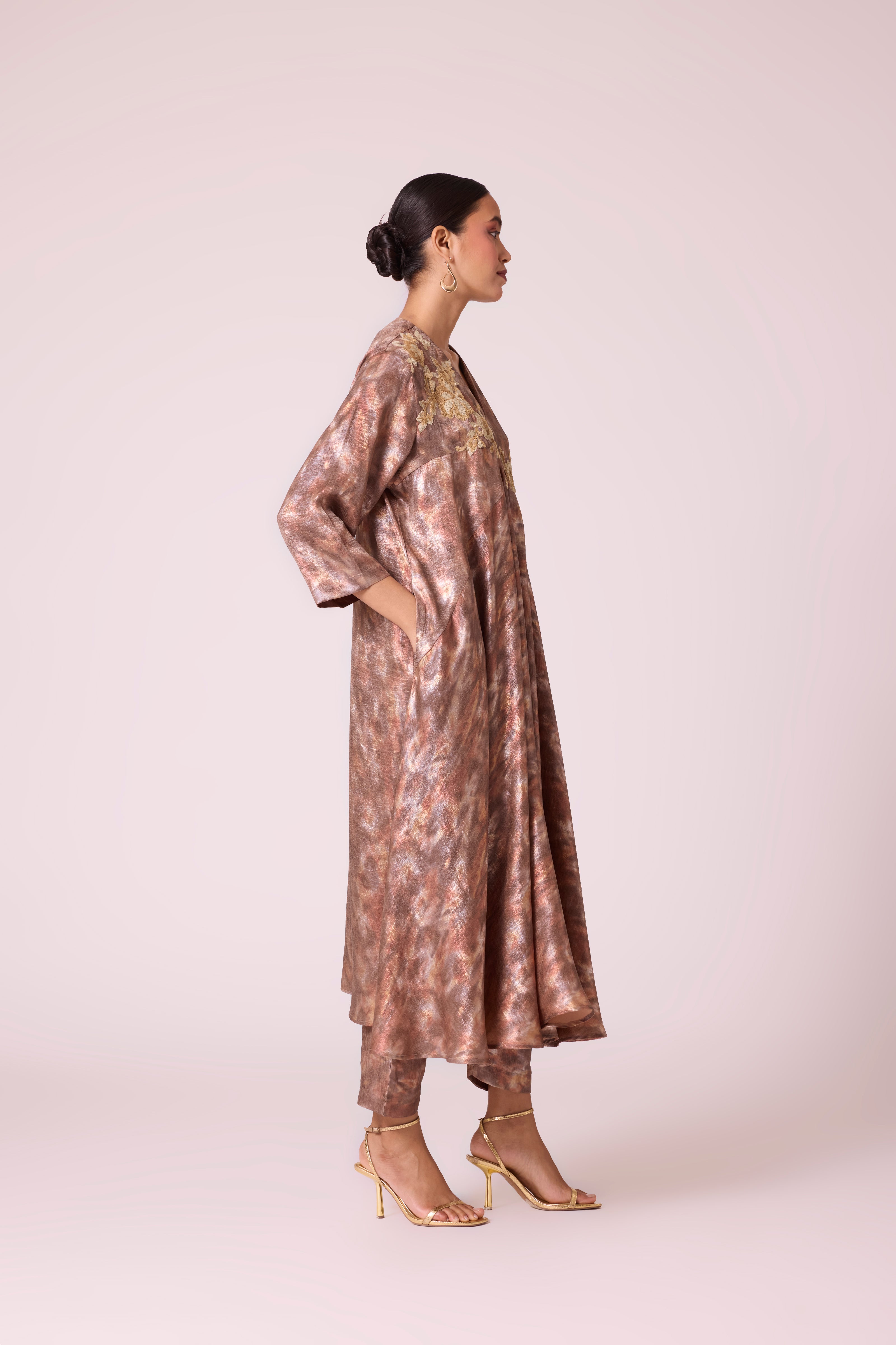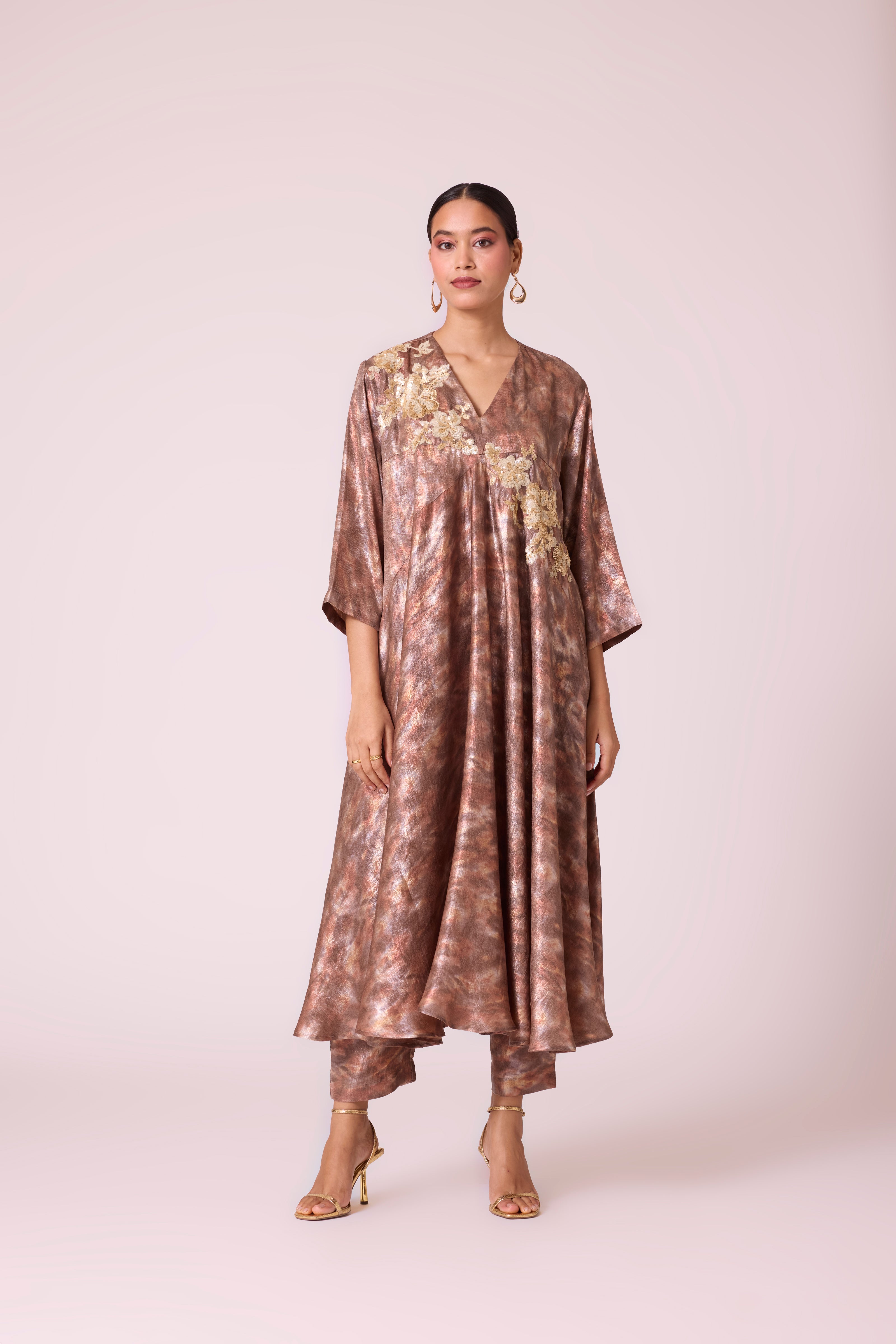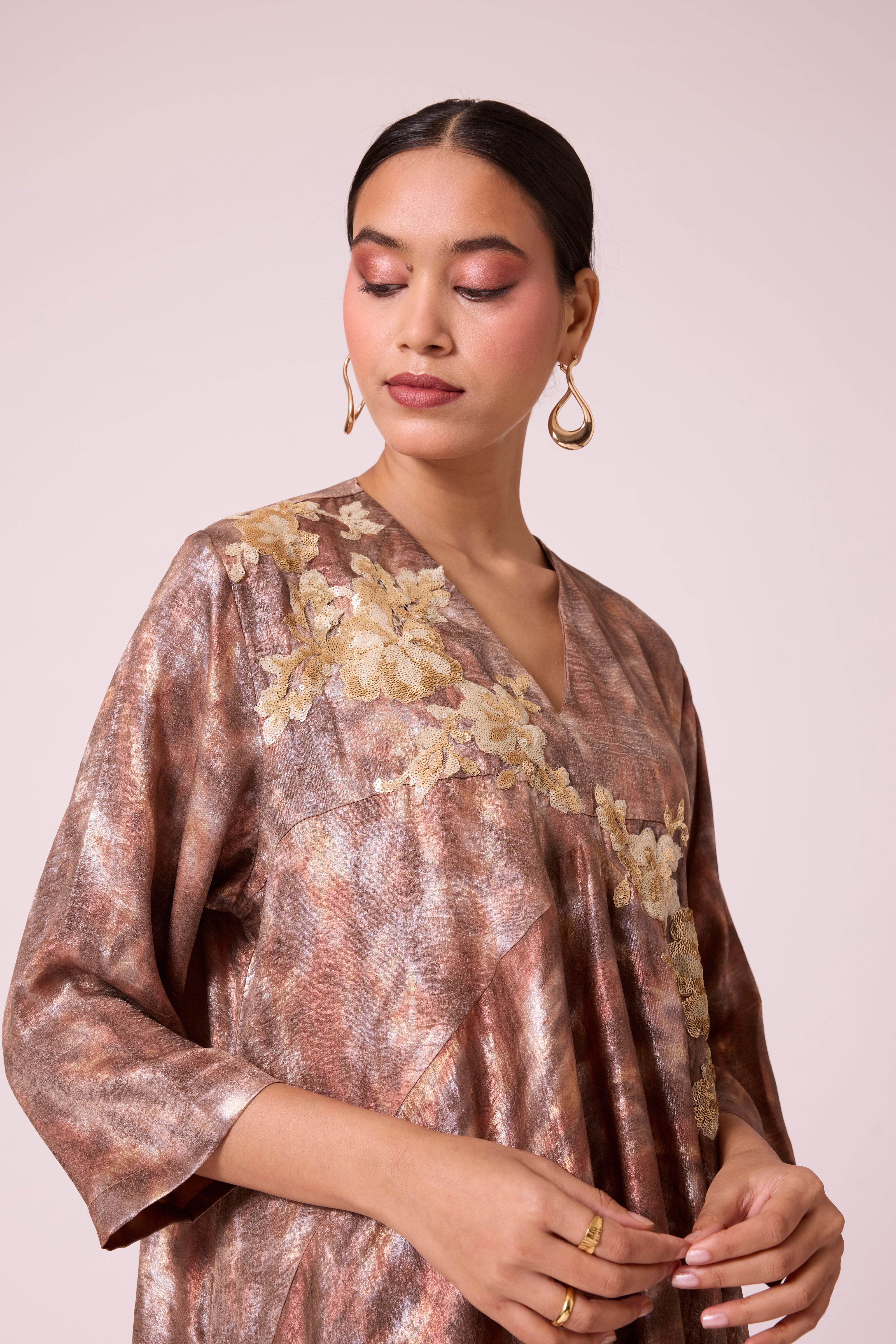 A flared tunic dress crafted with a classic V-neck and comfortable 3/4th sleeves - The bodice is finished off with delicate embroidered appliqué . Paired with matching pants.