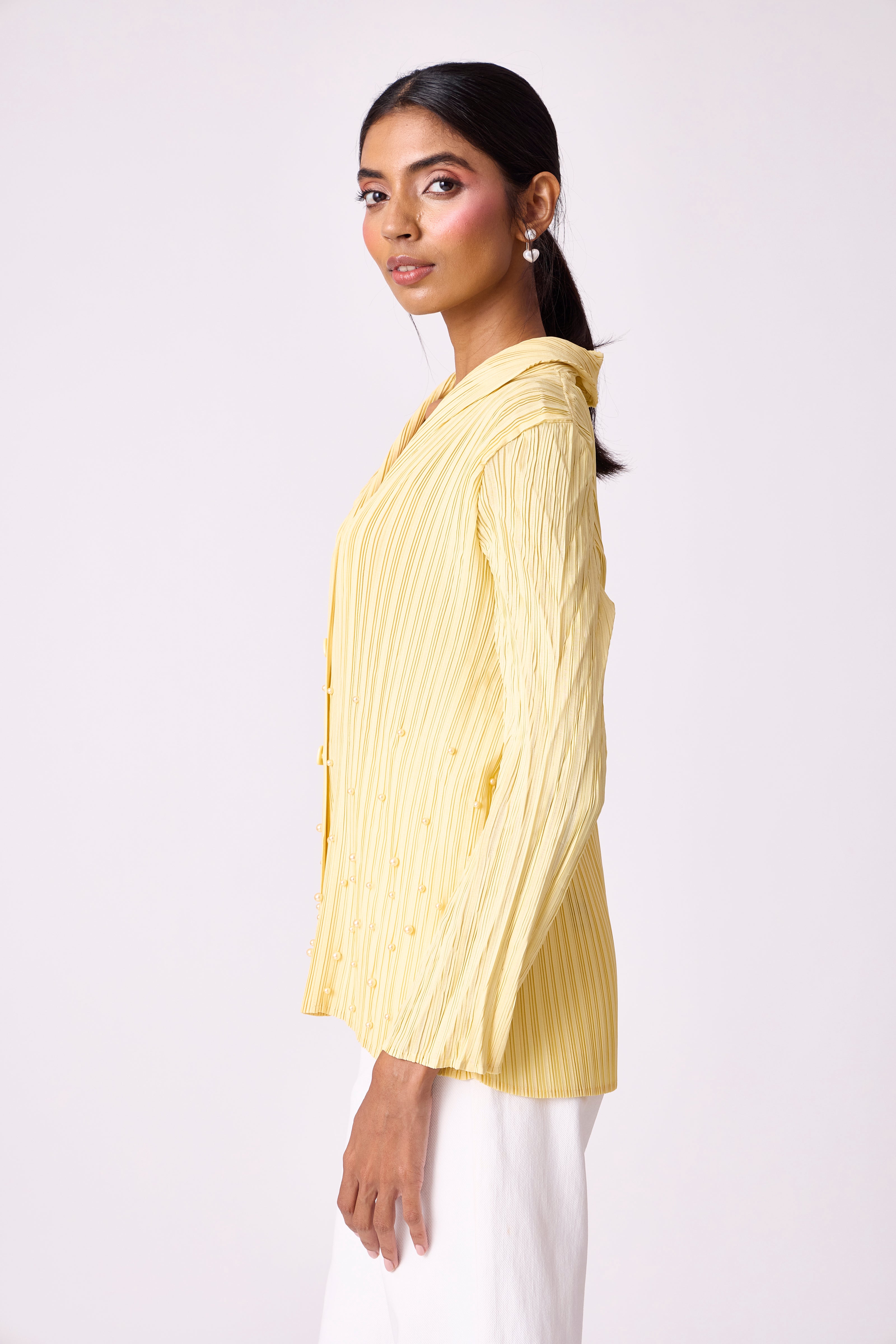 A structured yellow pleated shirt adorned with scattered tonal pearls and finished with a soft, sculpted collar.