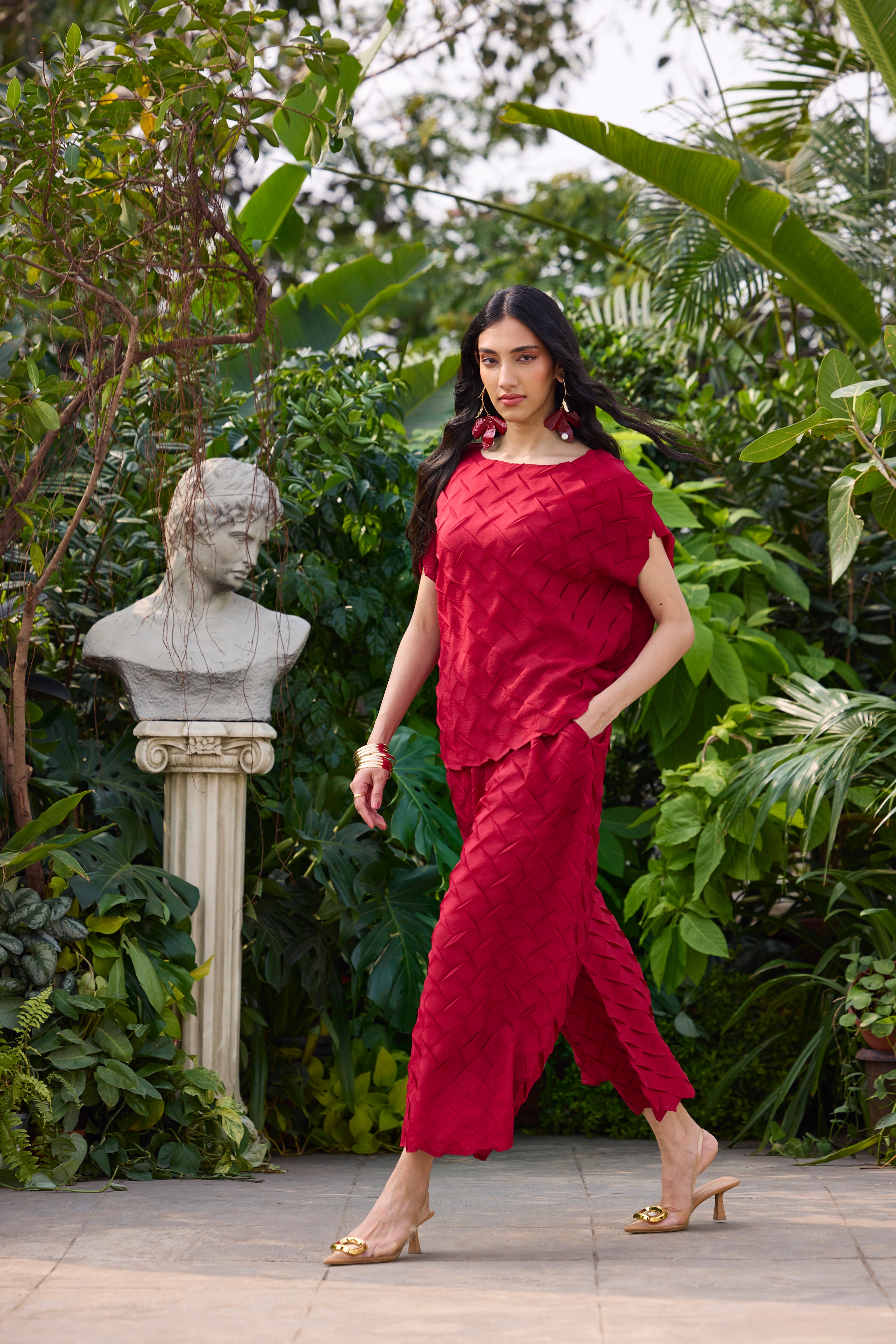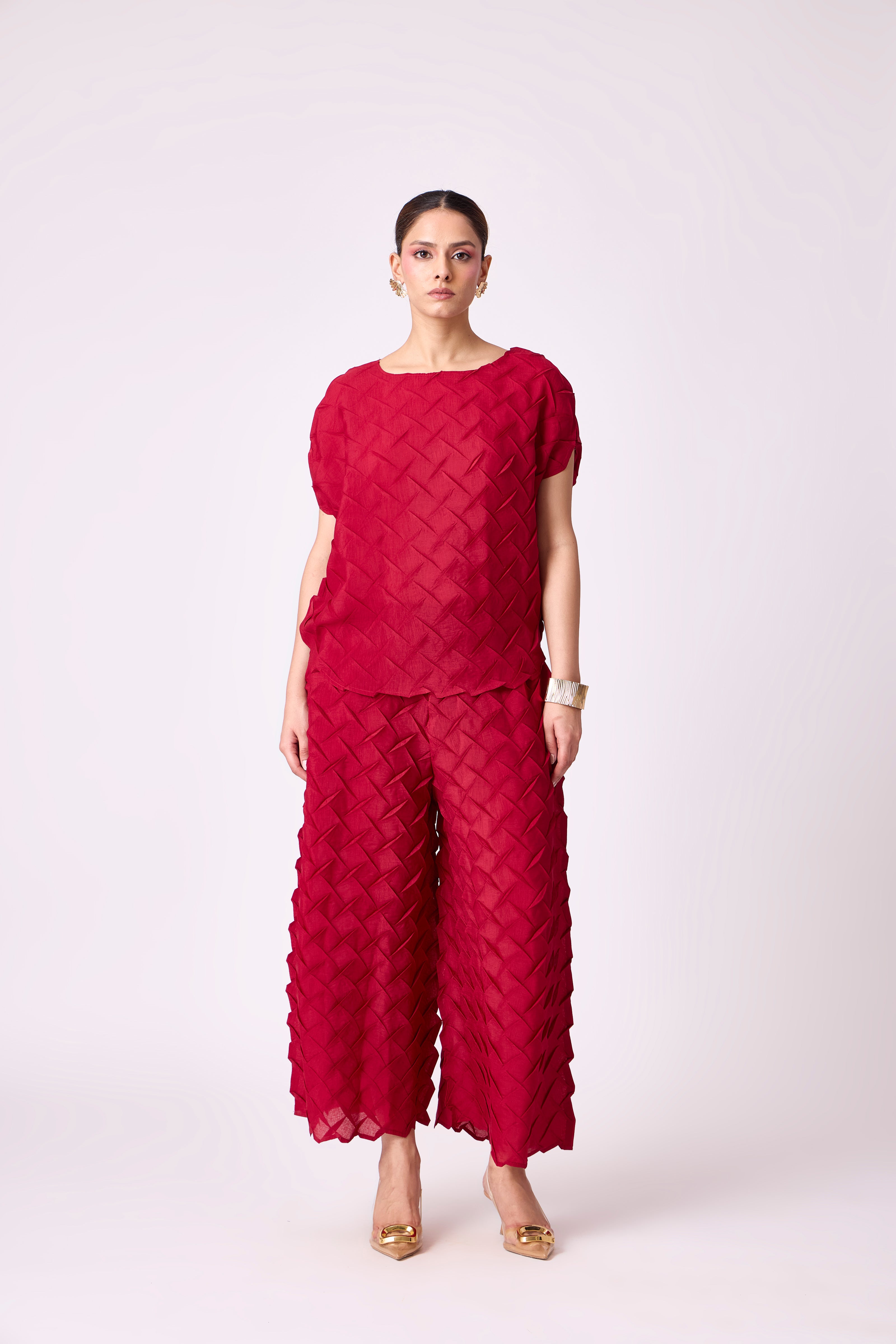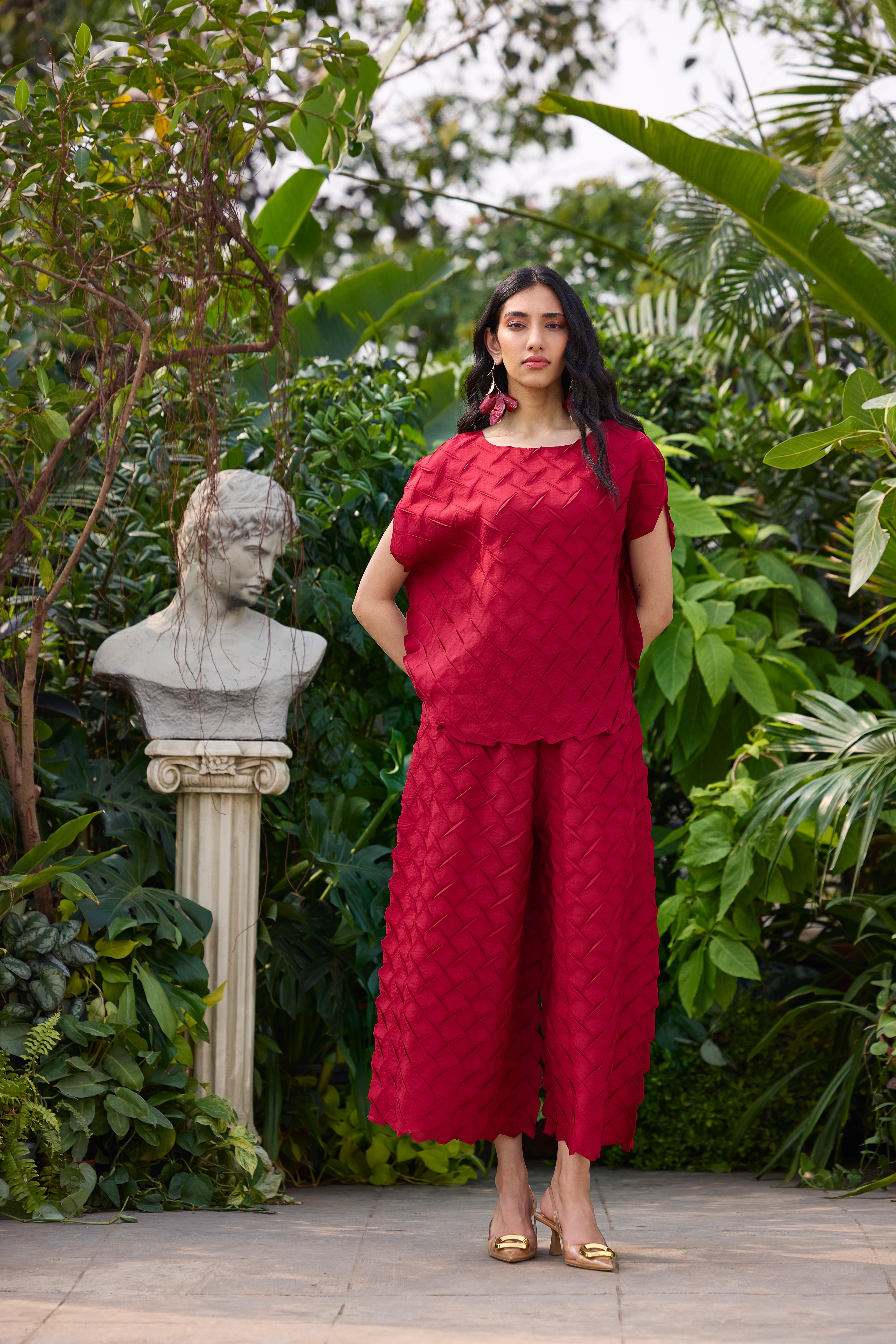 A striking set in 3D pleating, crafted in light weight material soft and airy in a statement jewel color for high summer wear.