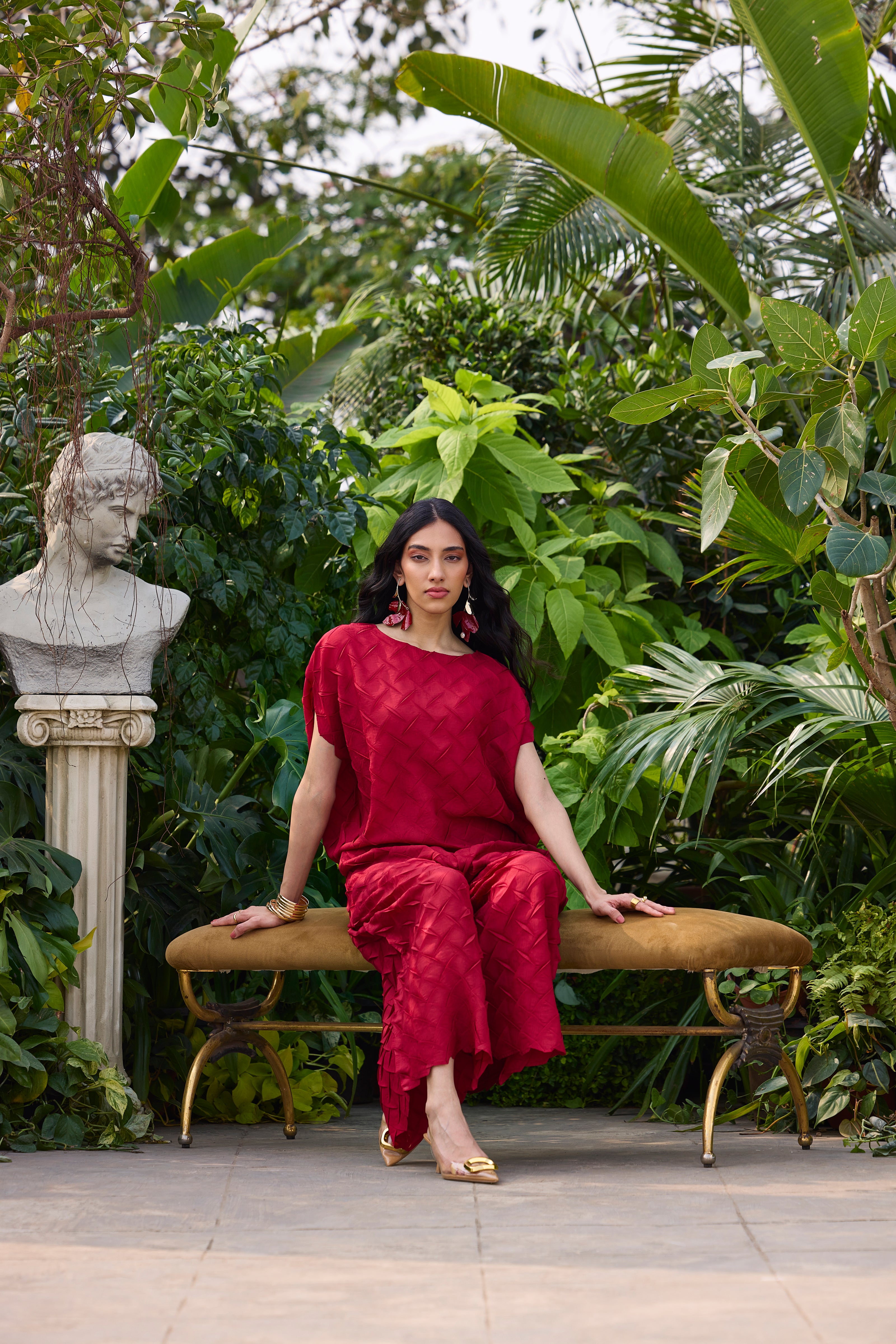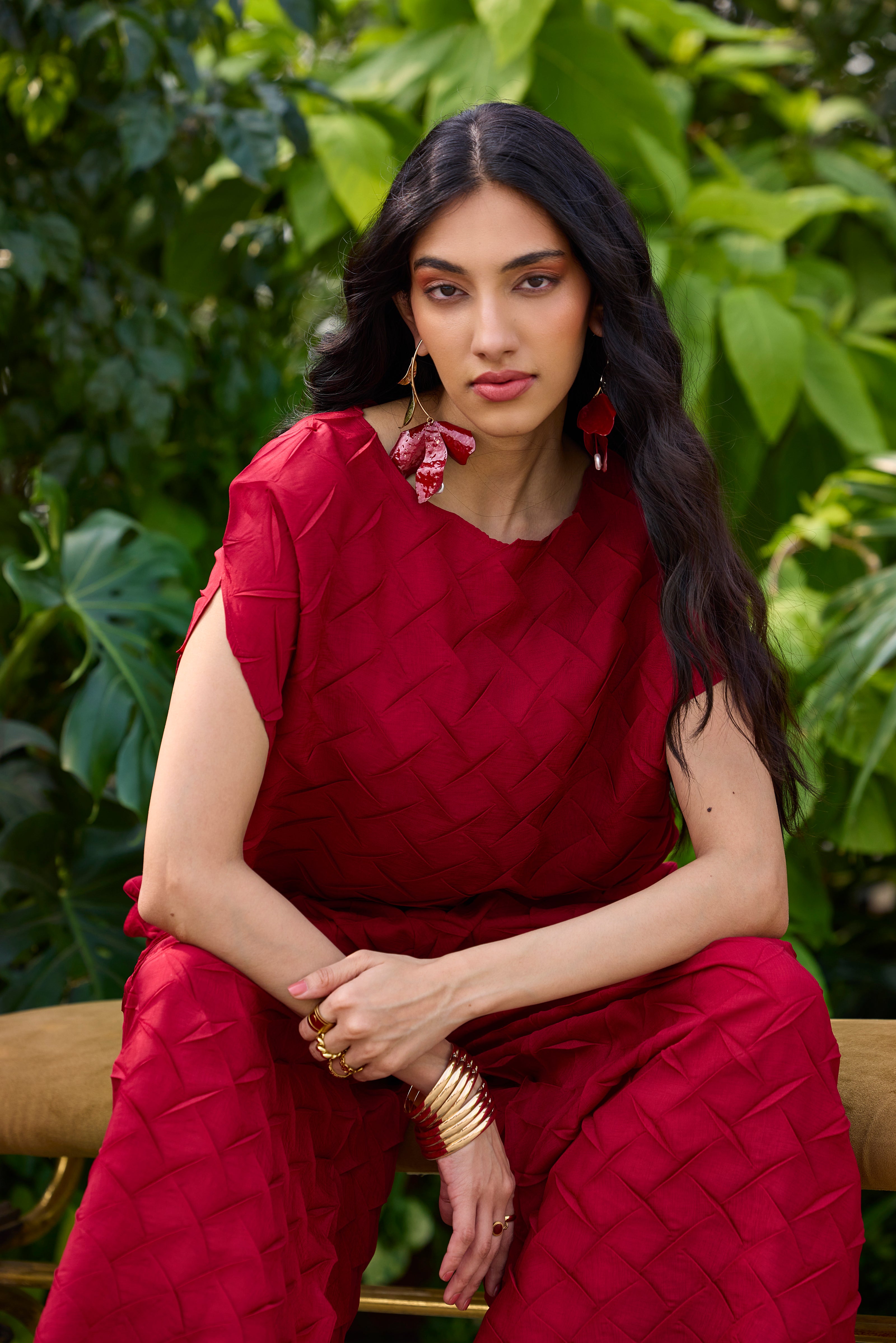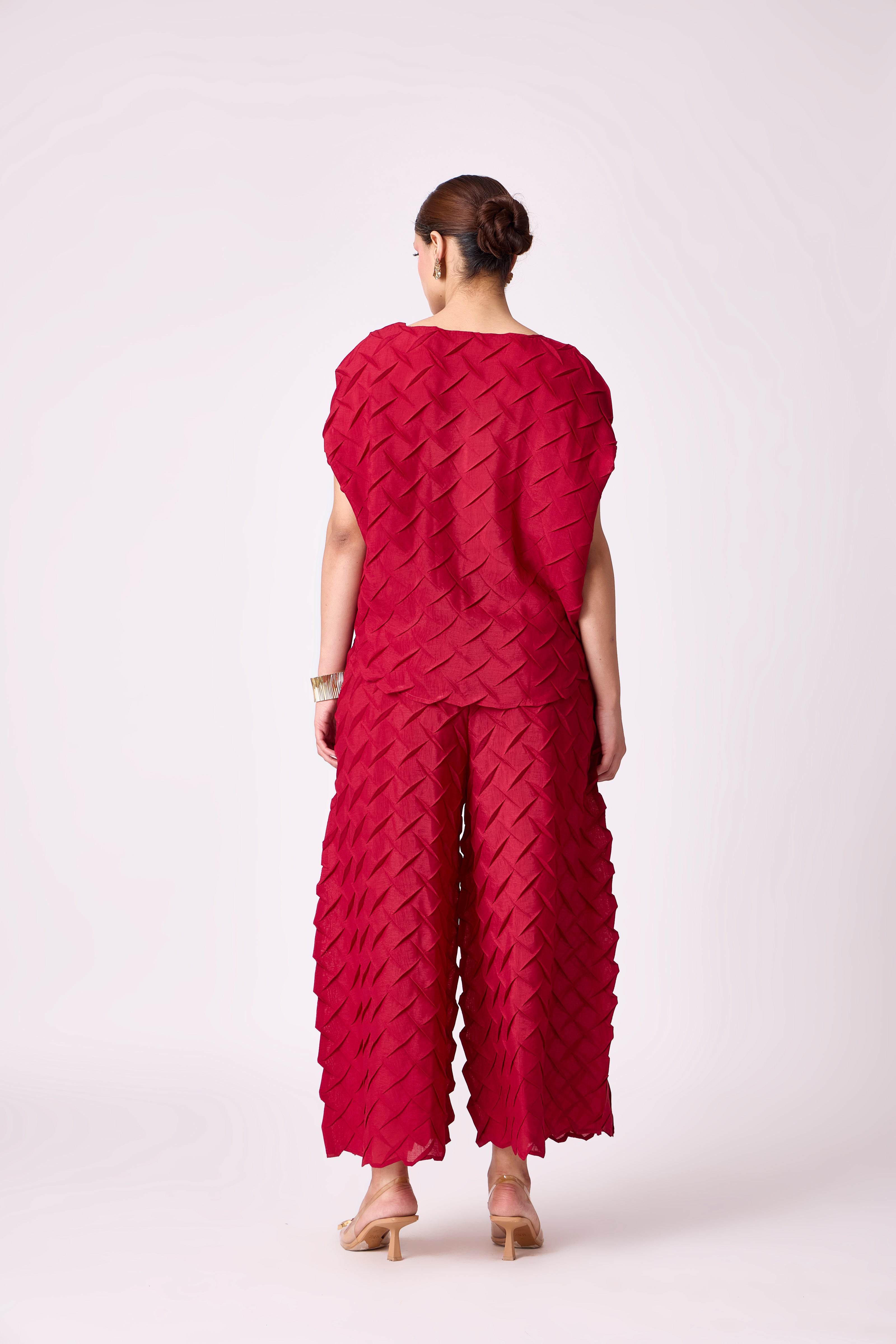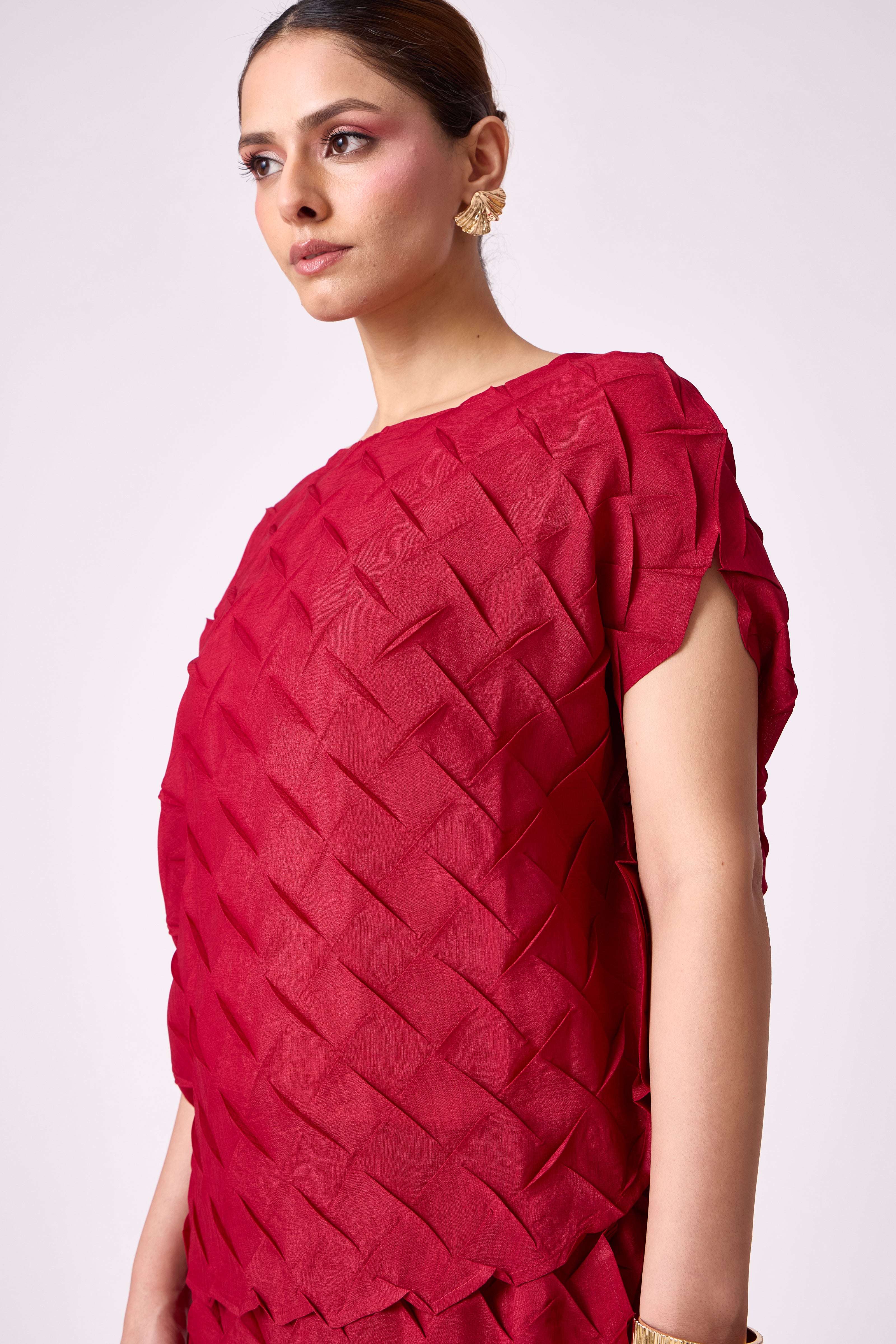 A striking set in 3D pleating, crafted in light weight material soft and airy in a statement jewel color for high summer wear.