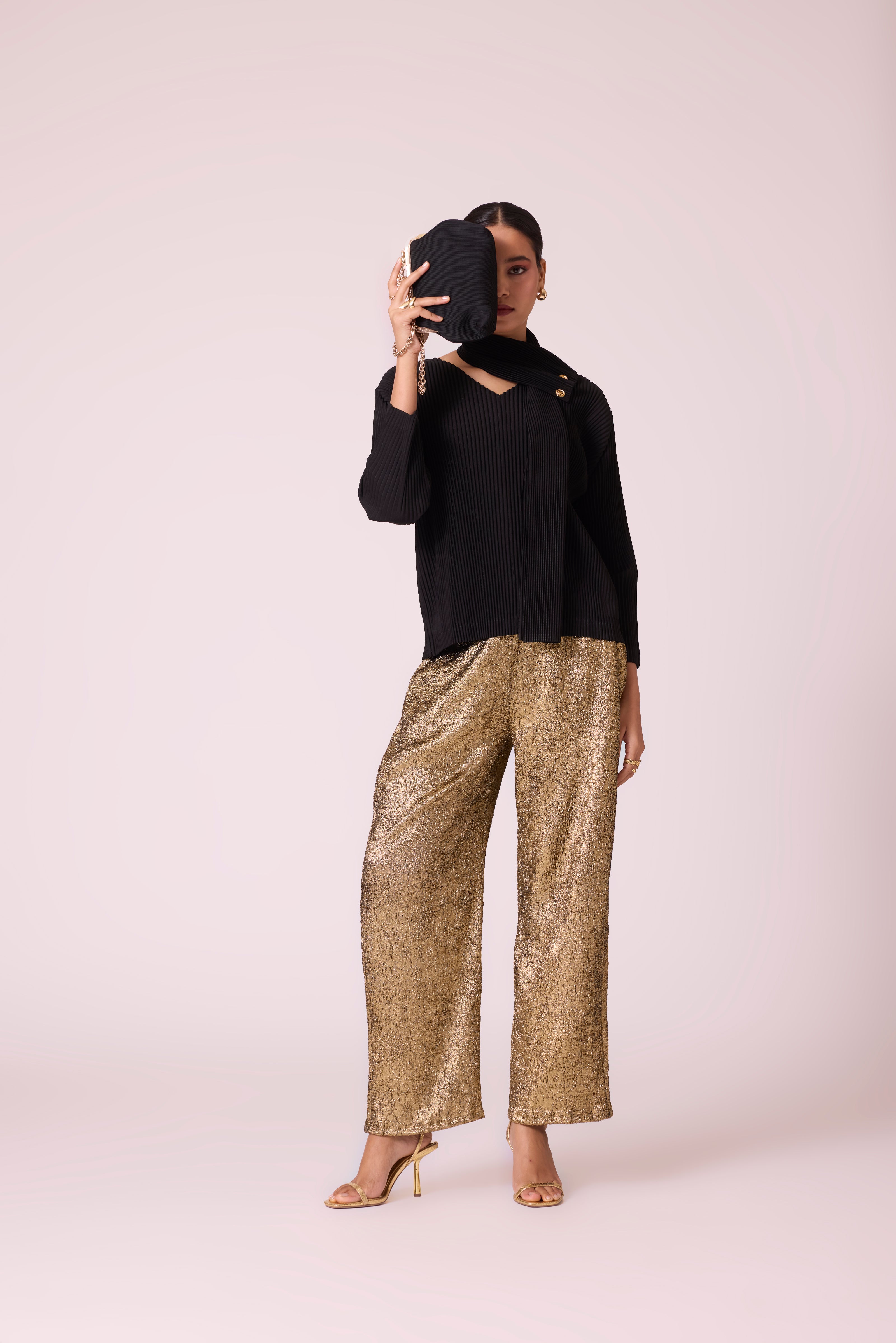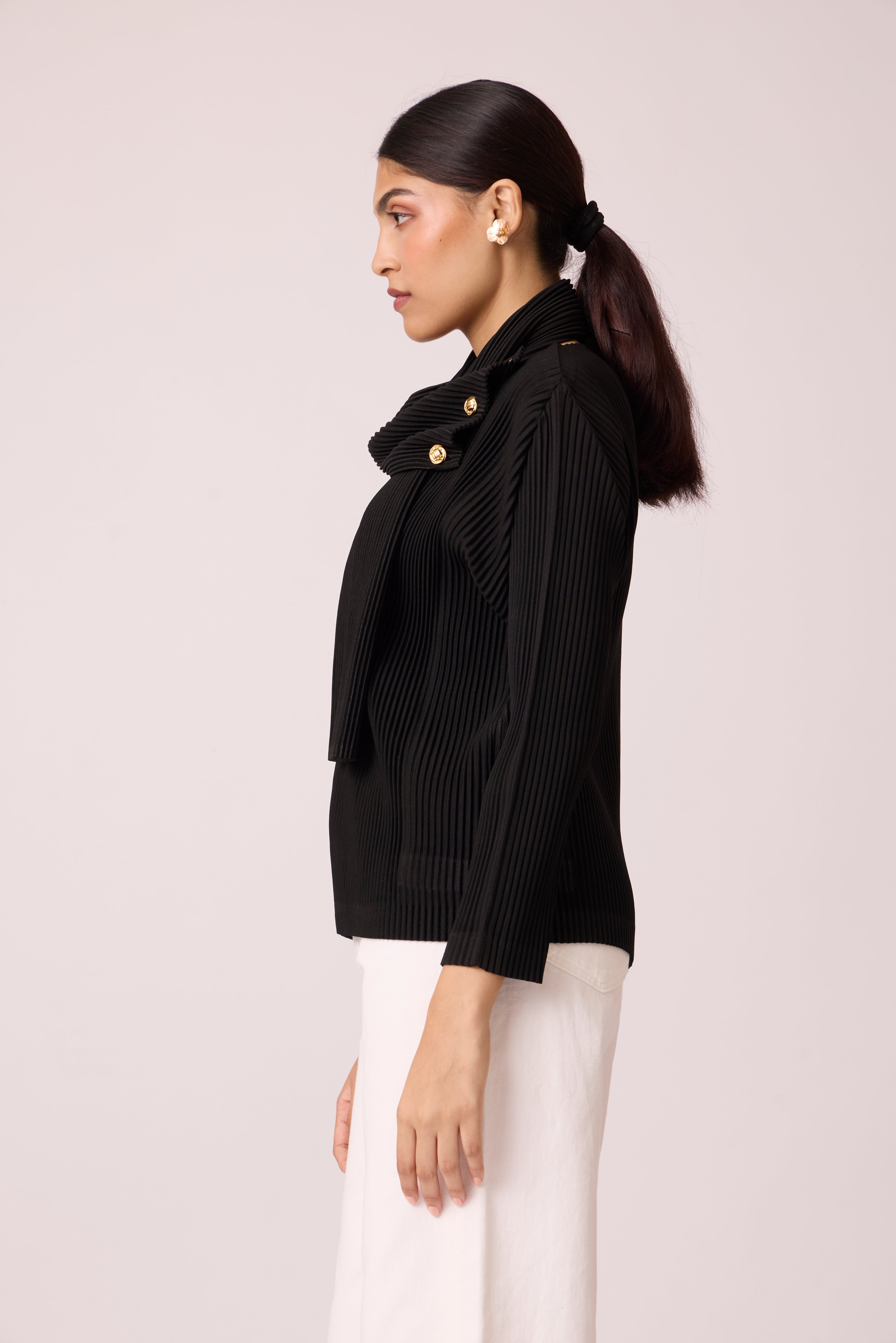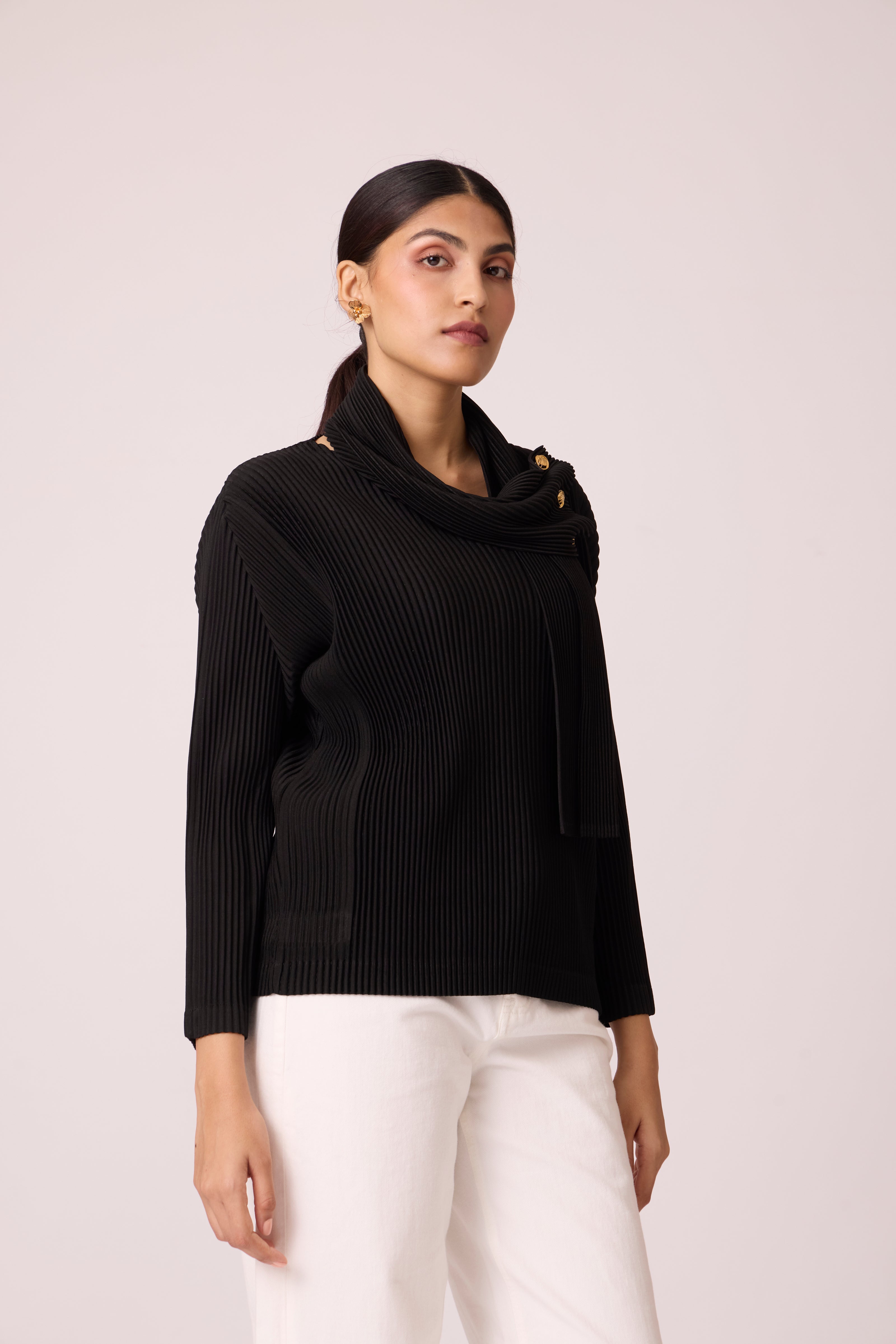 A knit pleated top with built on scarf, highlighted with gold metal button detail.