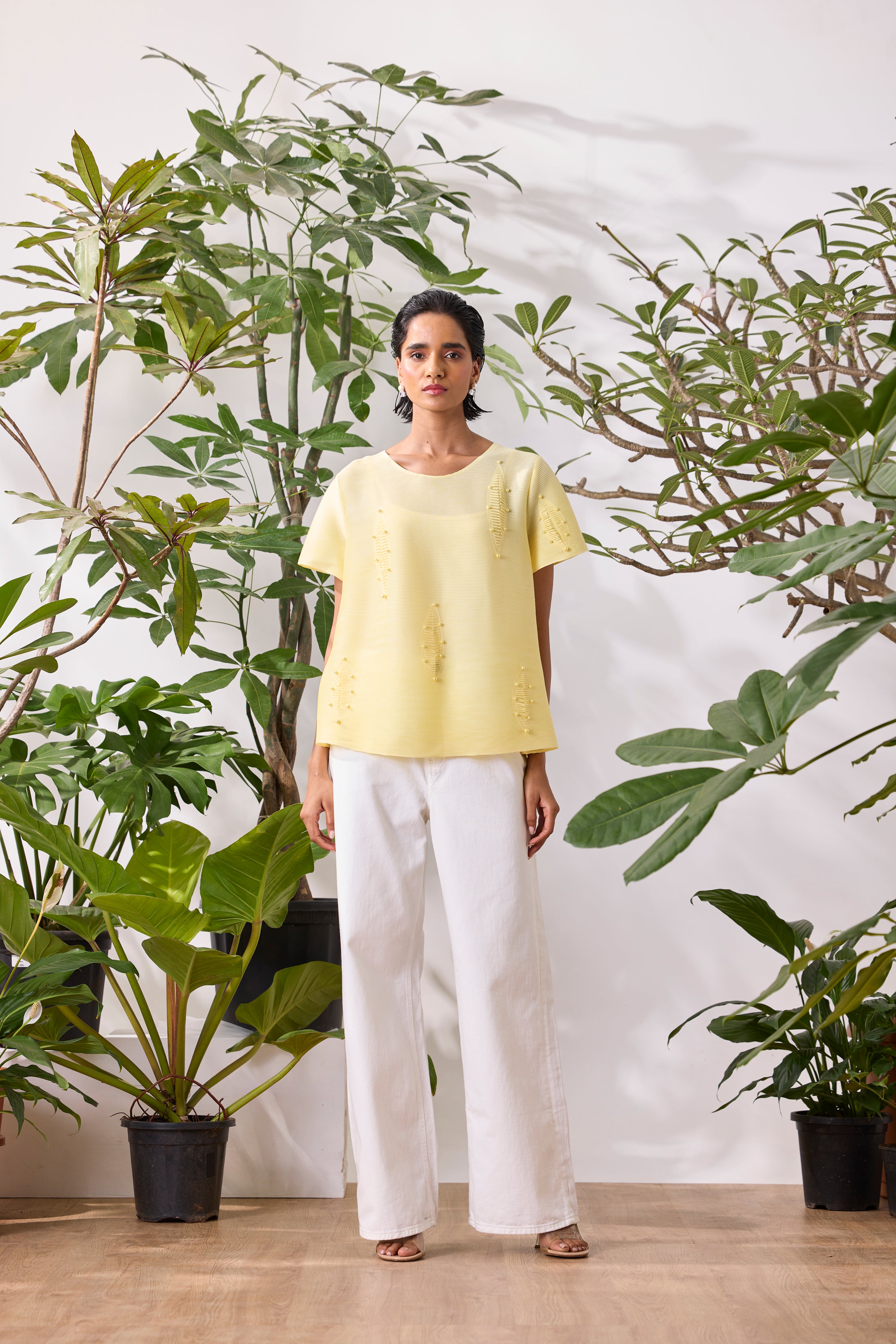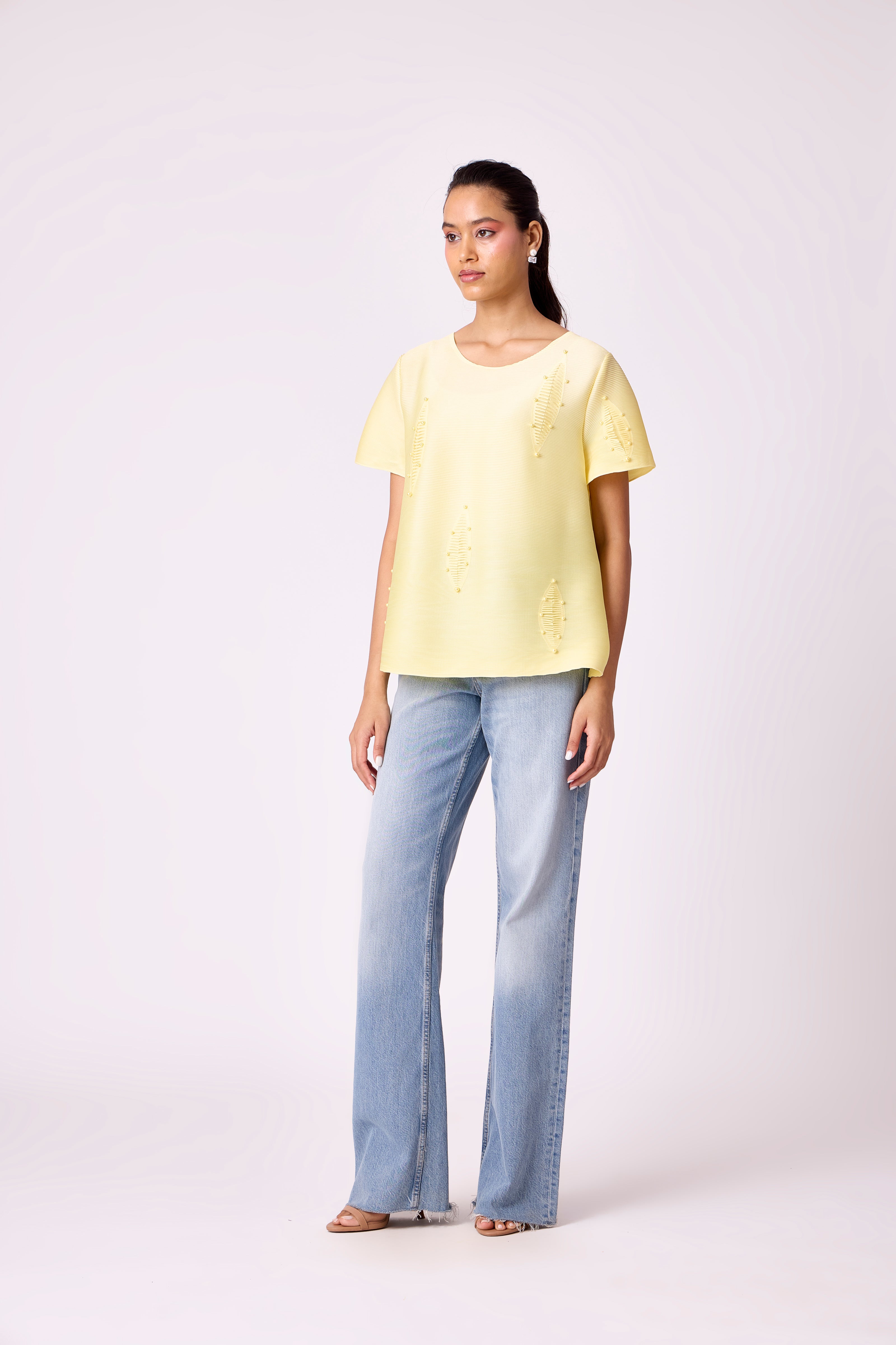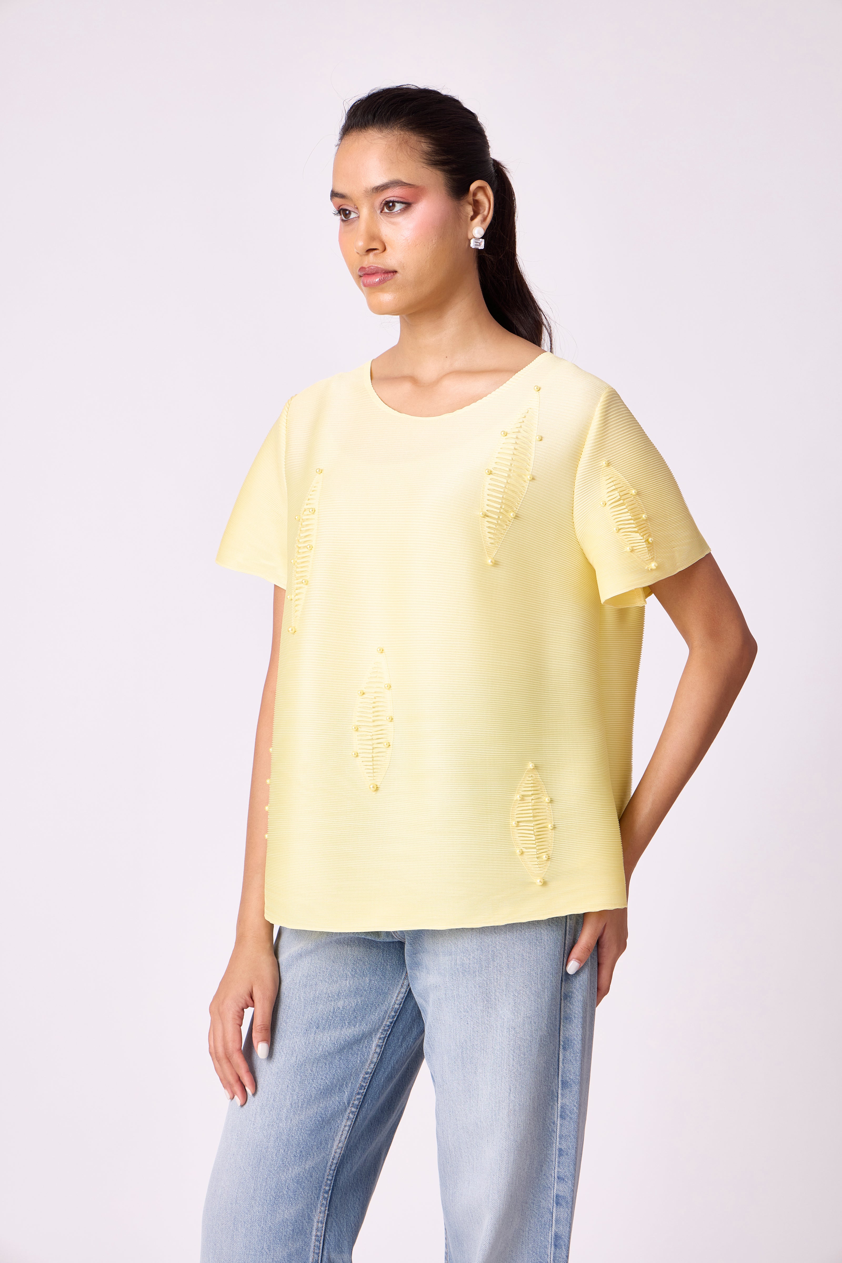 A pleated top with subtle cutwork detailing and delicate bead embellishments.