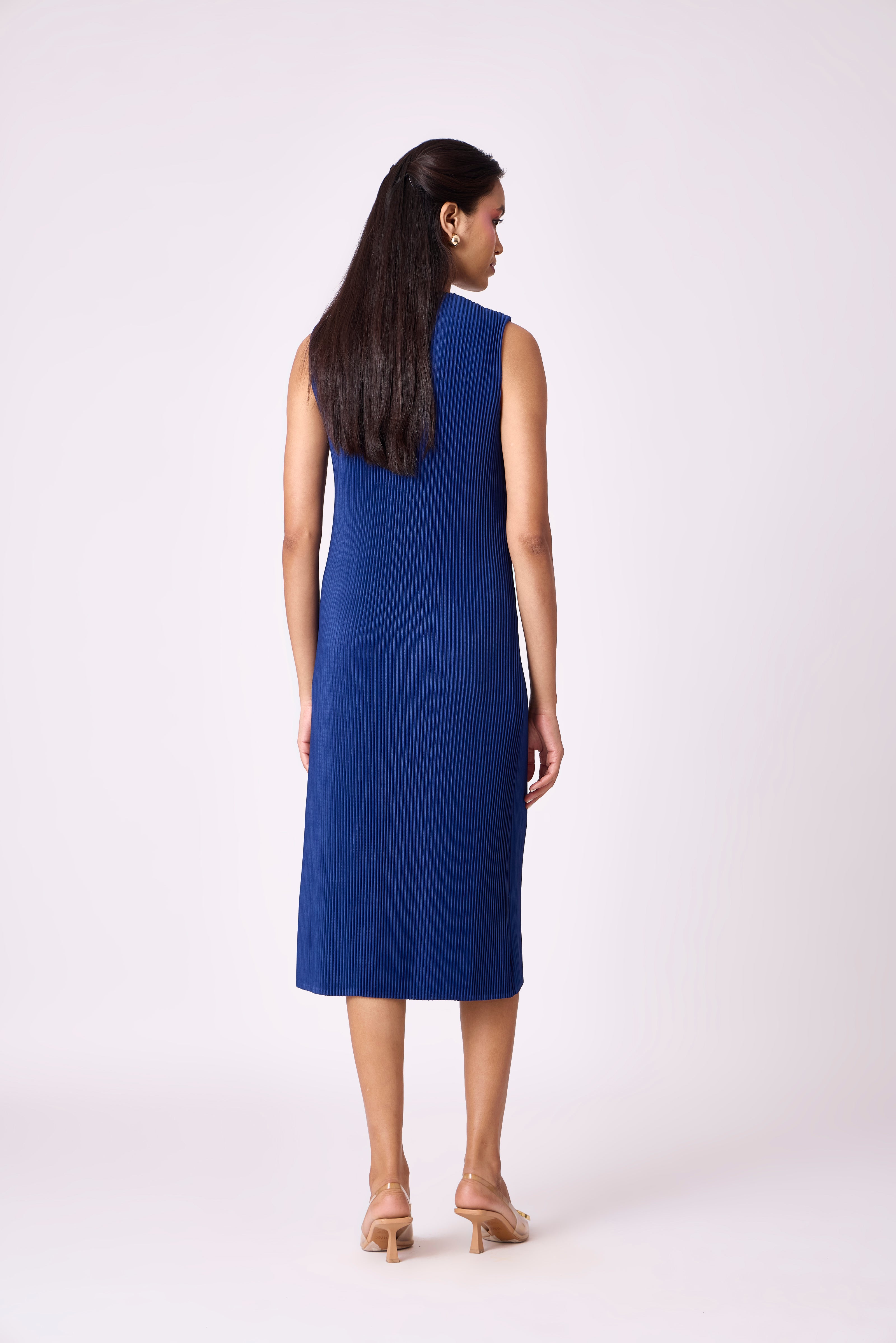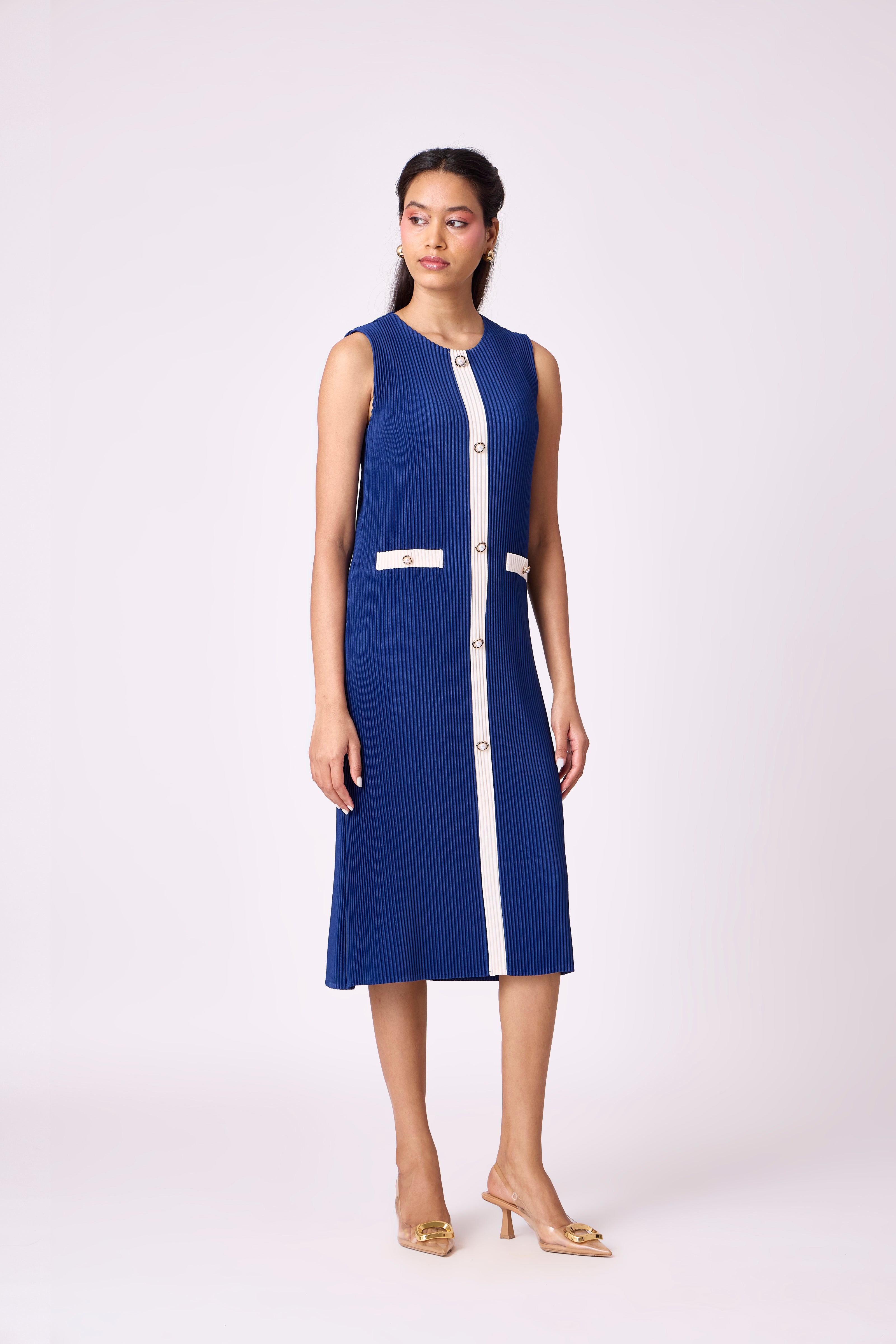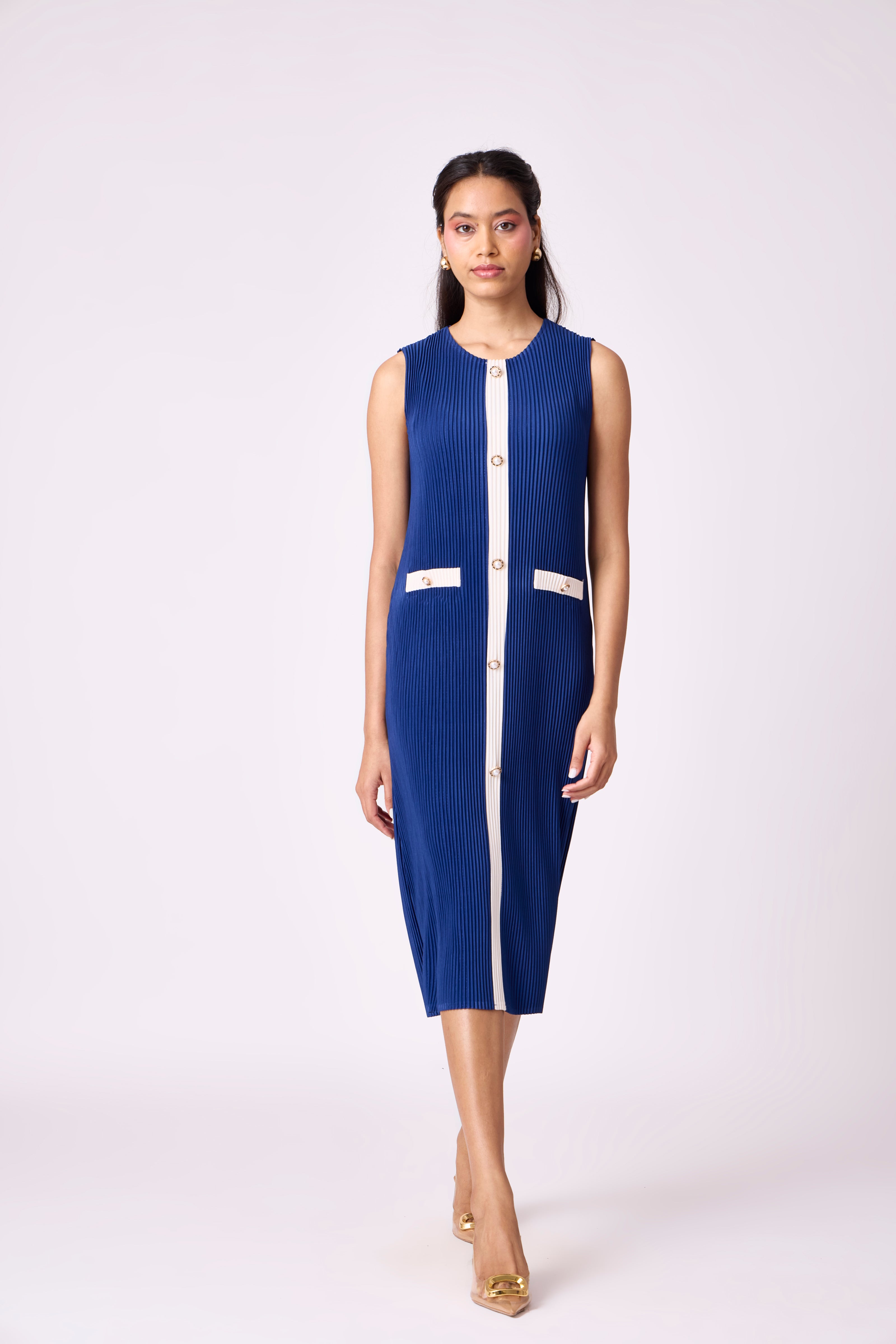 A classic sleeveless dress with contrast panel detailing and decorative buttons - a pleated take on channel-esq dressing.