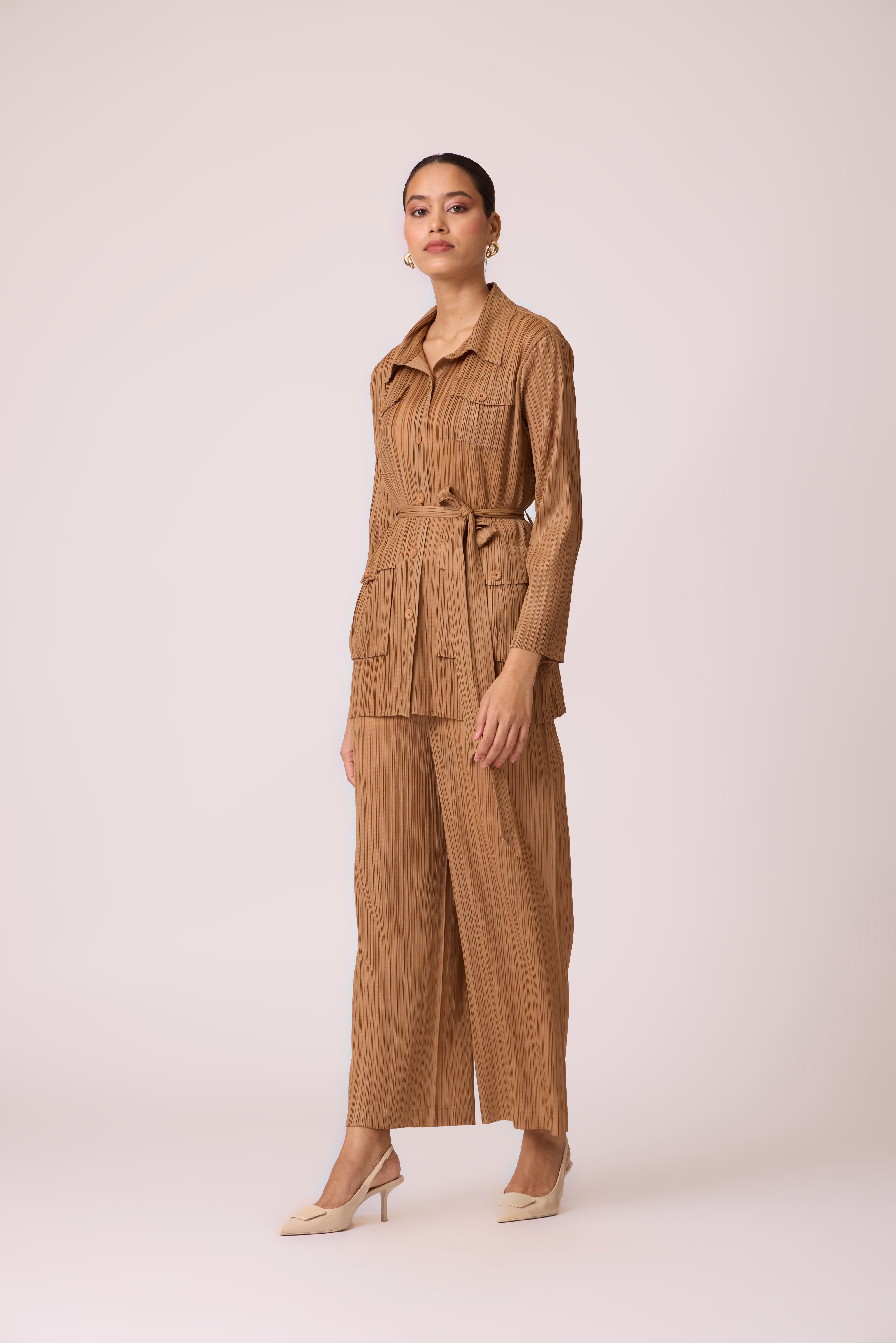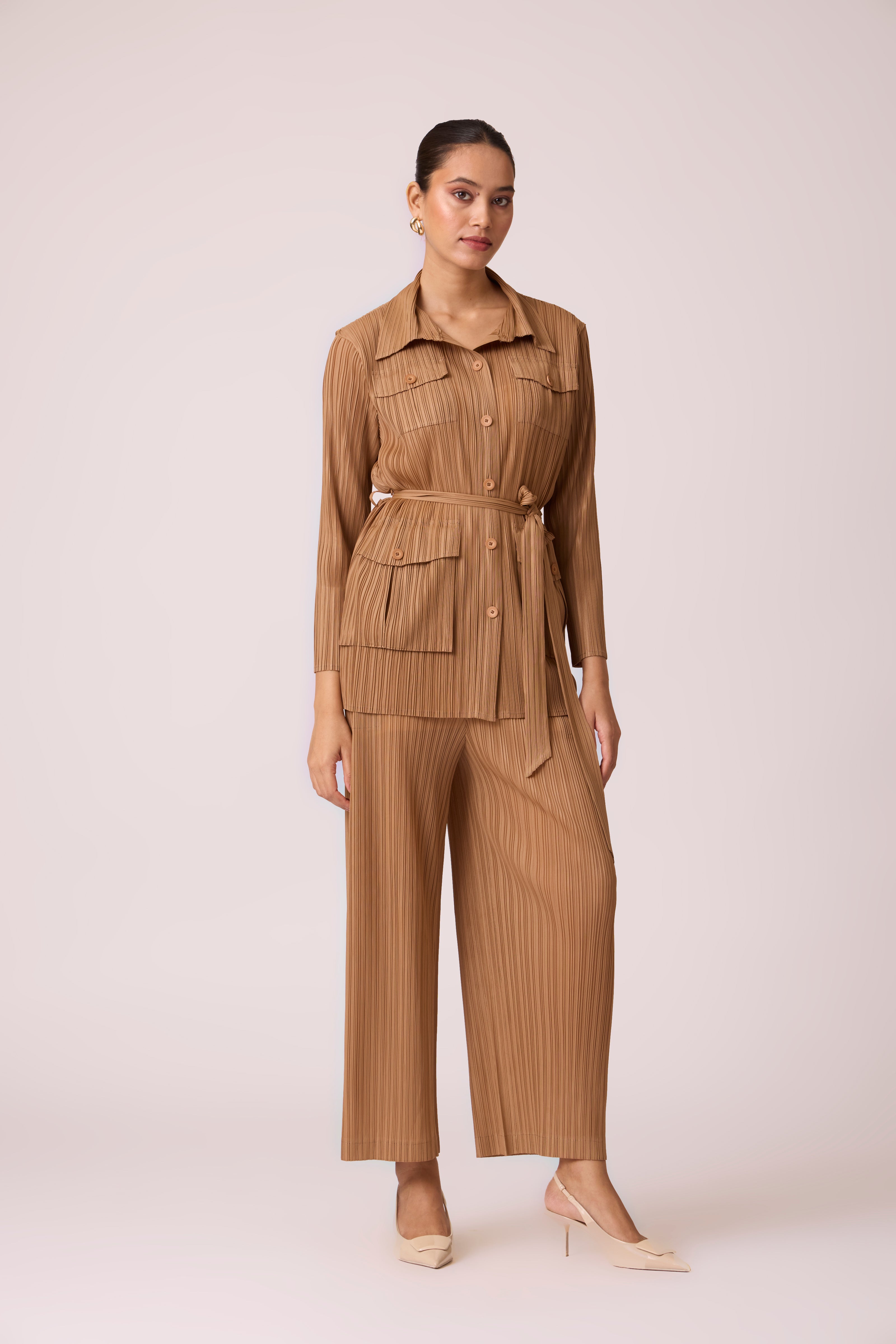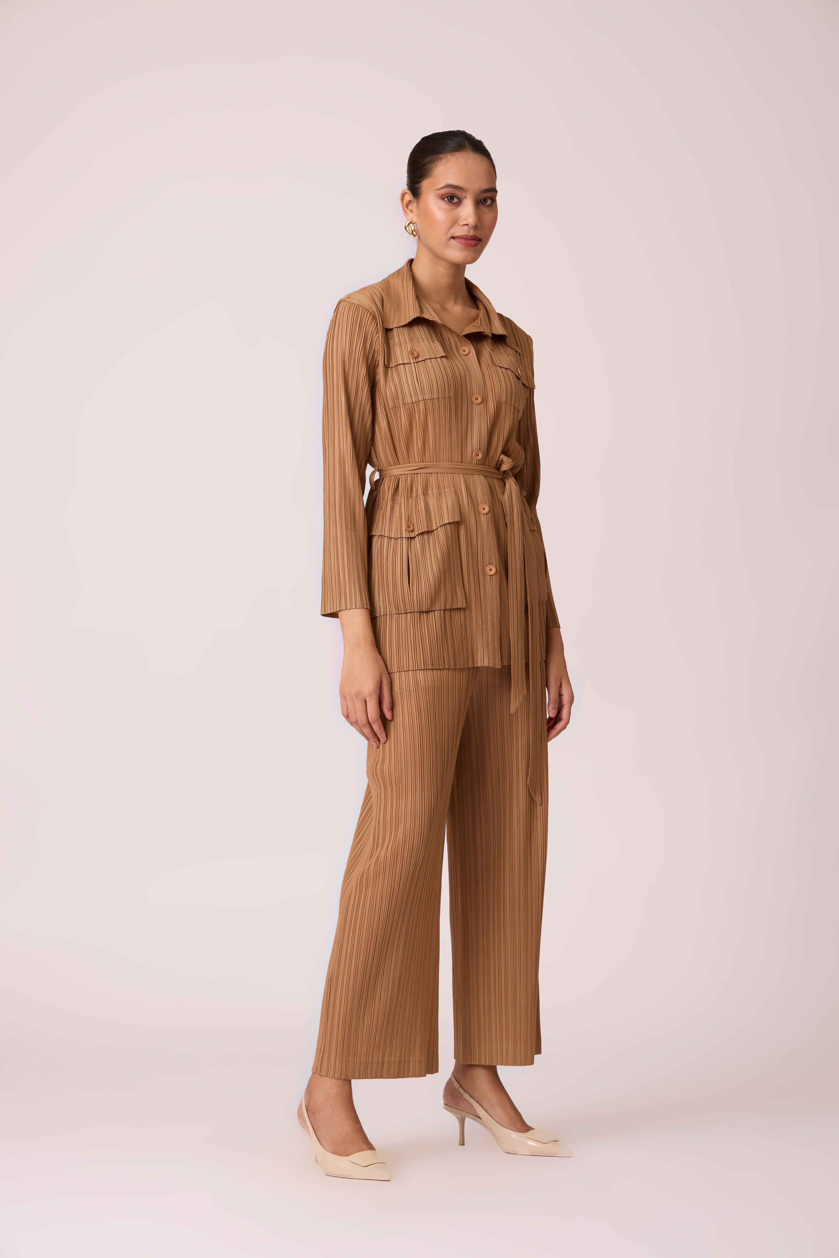 Trench like shirt top paired with straight leg pants and matching belt for a stylish co-ordinated look matching the strong fall season trends. Perfect to travel in and layer under long coats and over warm thermals.