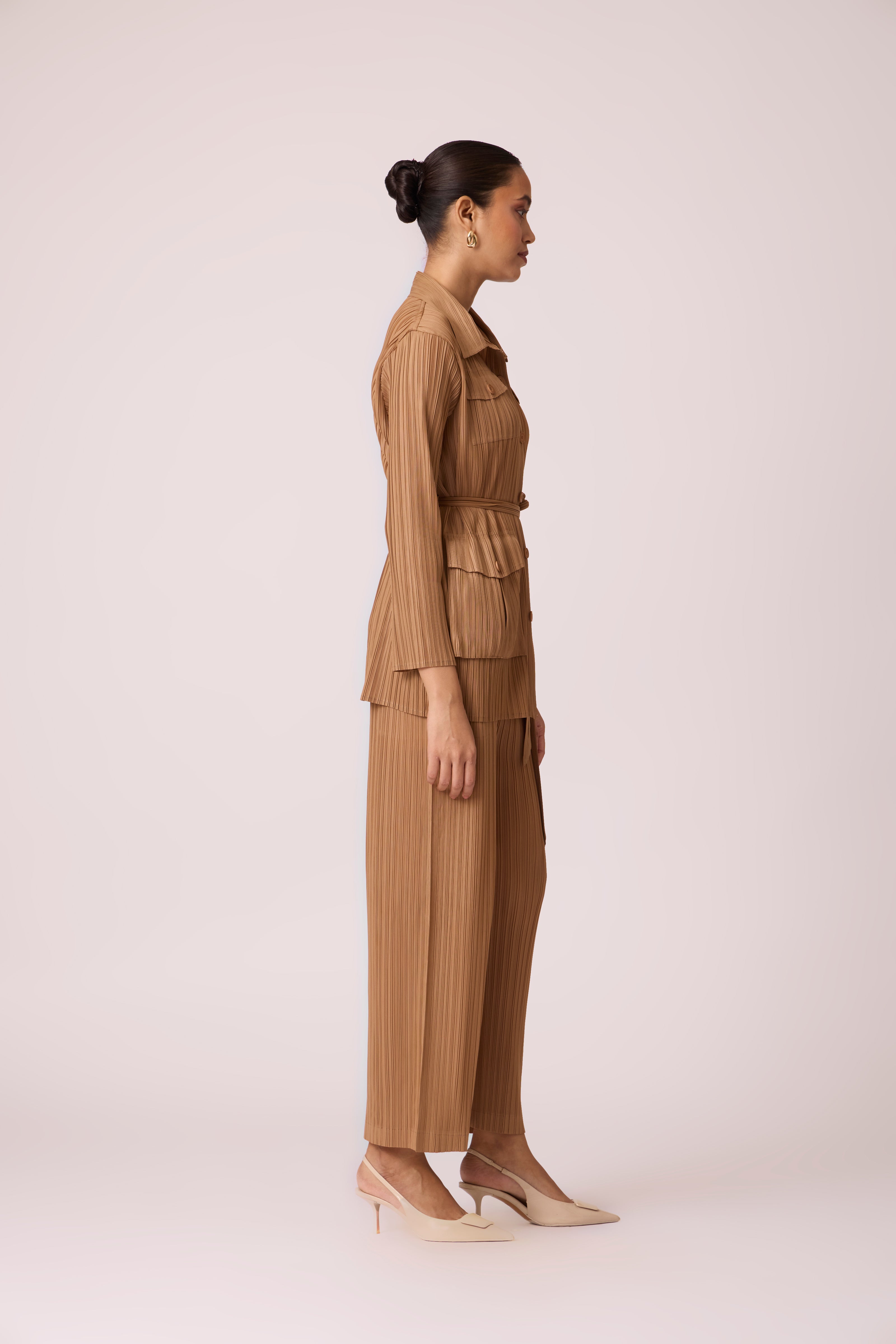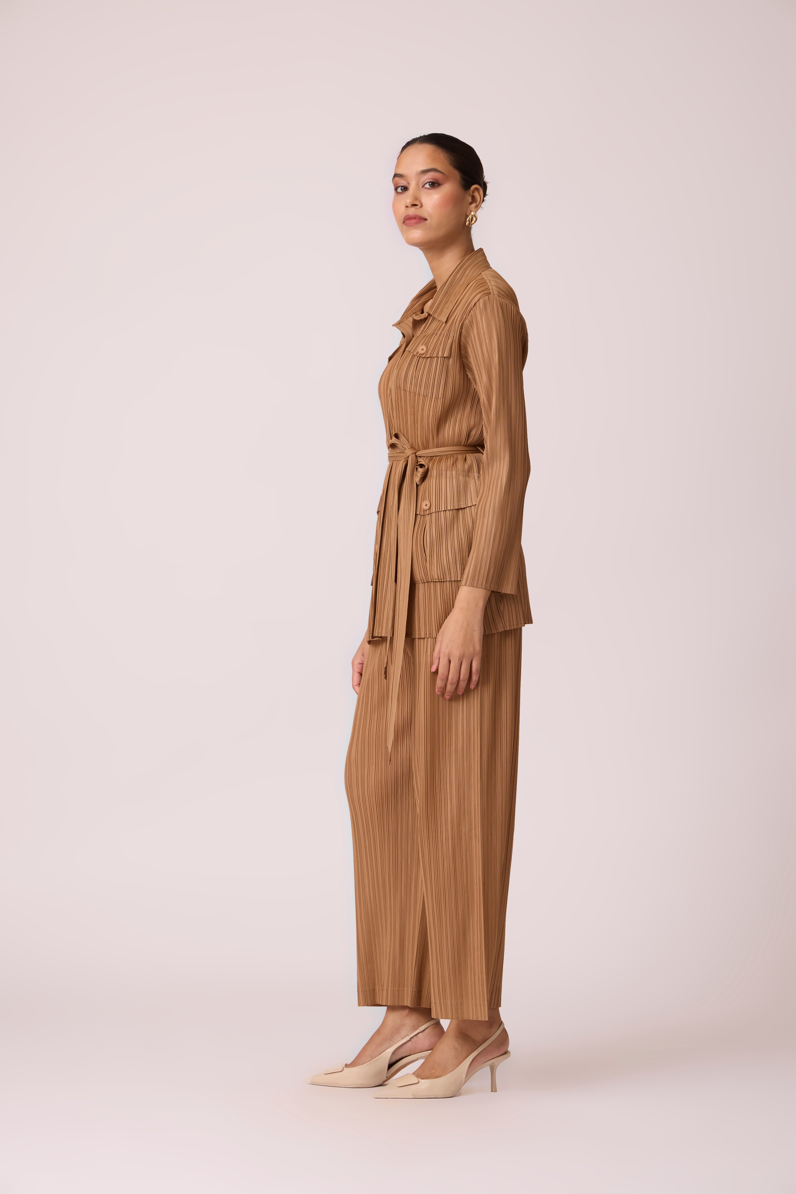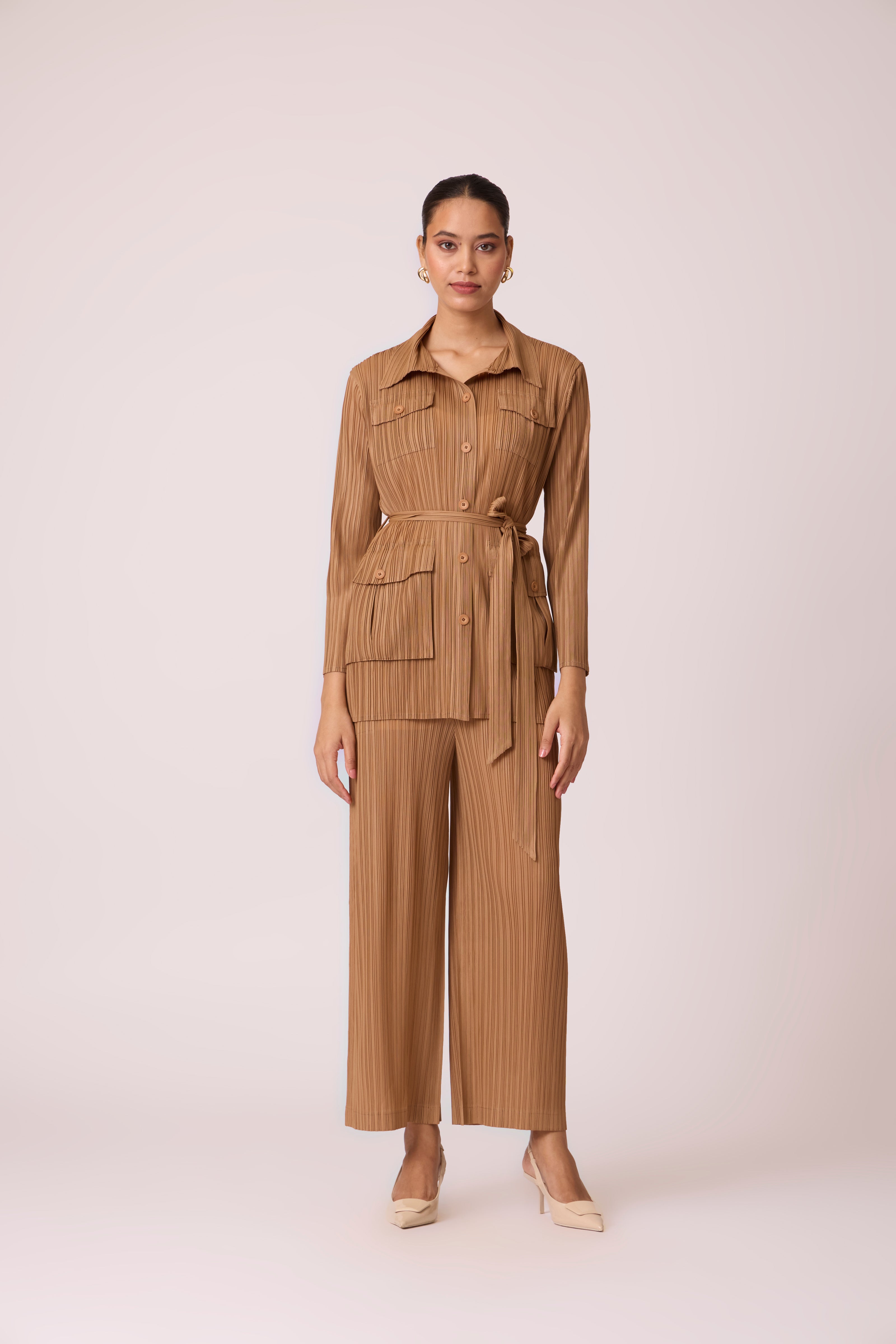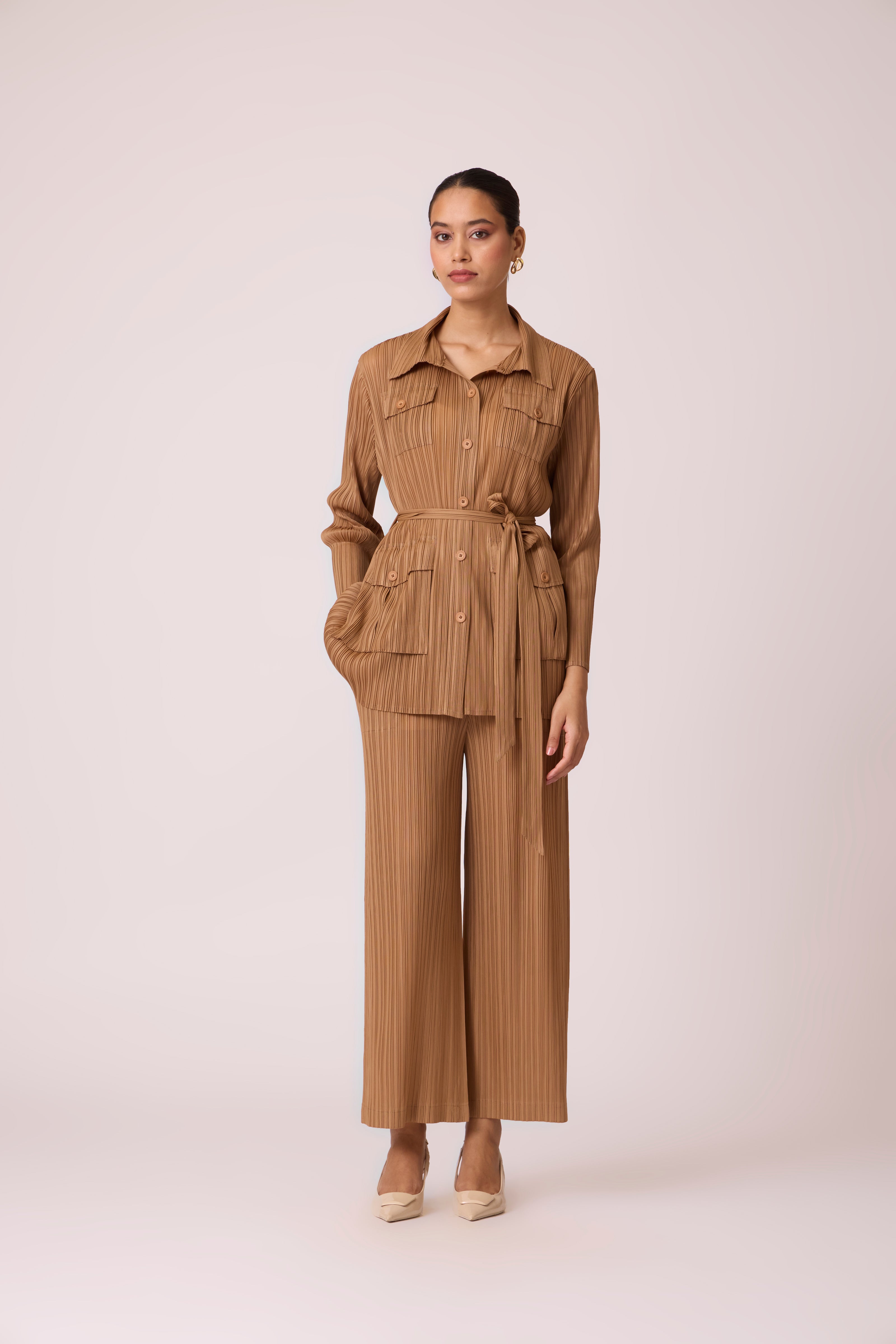 Trench like shirt top paired with straight leg pants and matching belt for a stylish co-ordinated look matching the strong fall season trends. Perfect to travel in and layer under long coats and over warm thermals.