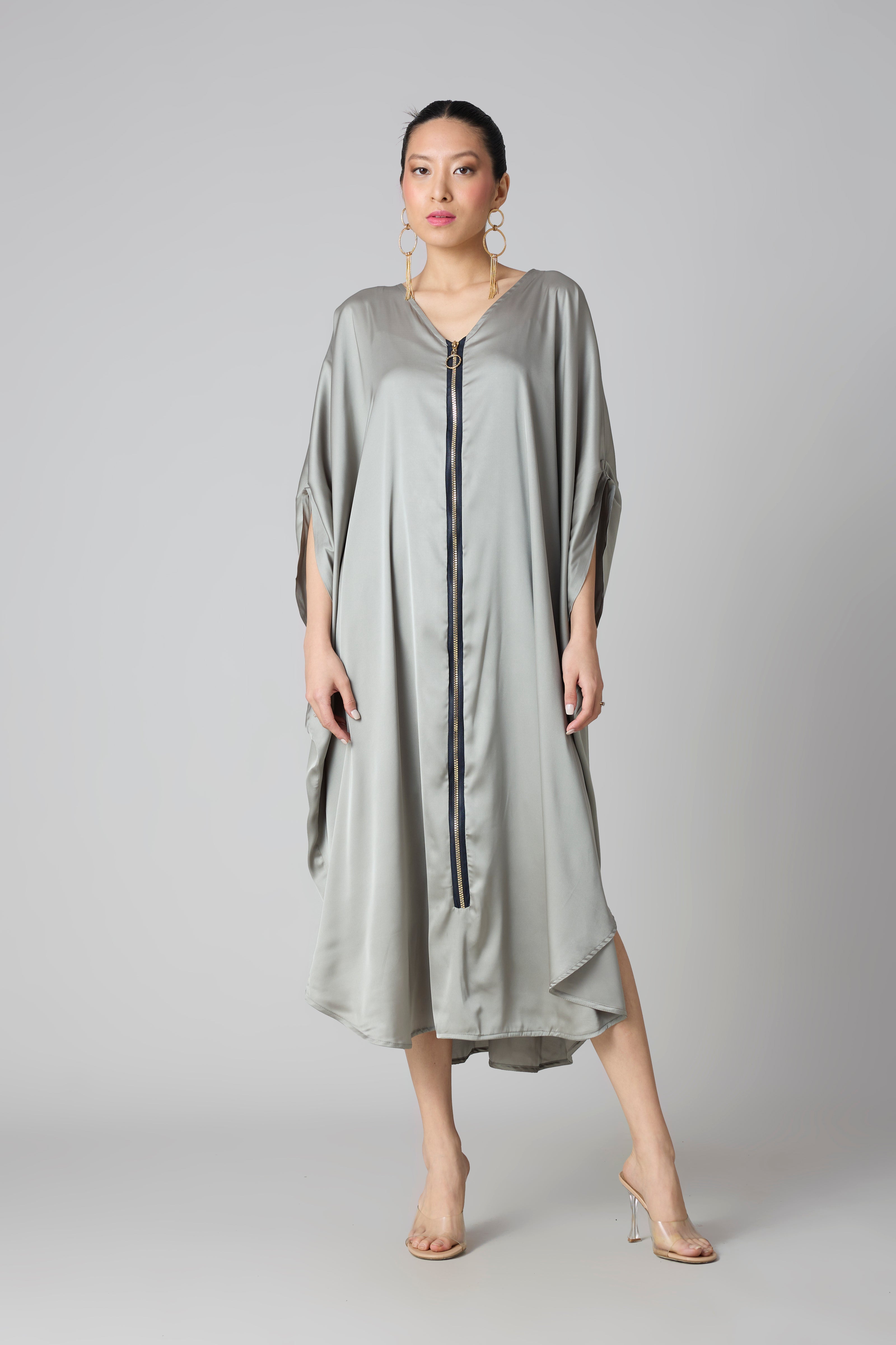 Step into effortless elegance with our Kaftan Style Dress, designed to turn heads with its captivating silhouette and contrasting zip detailing. Crafted in a luxurious satin