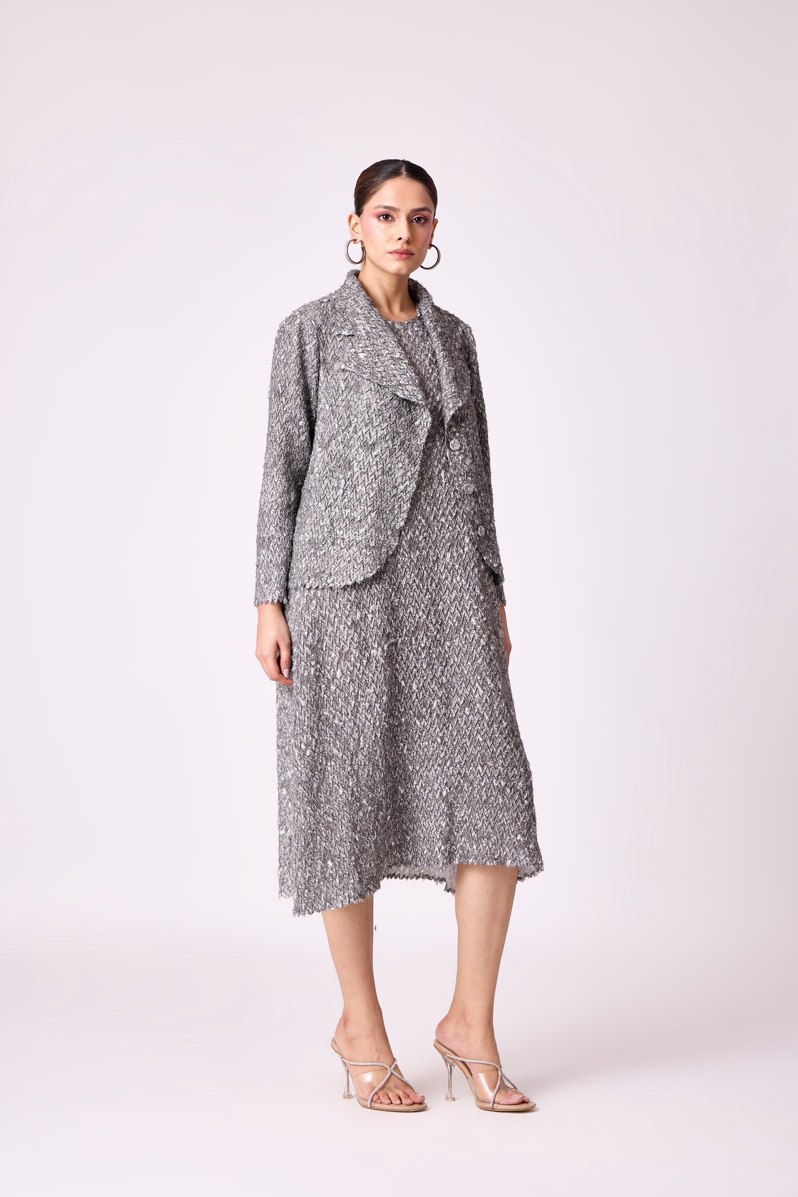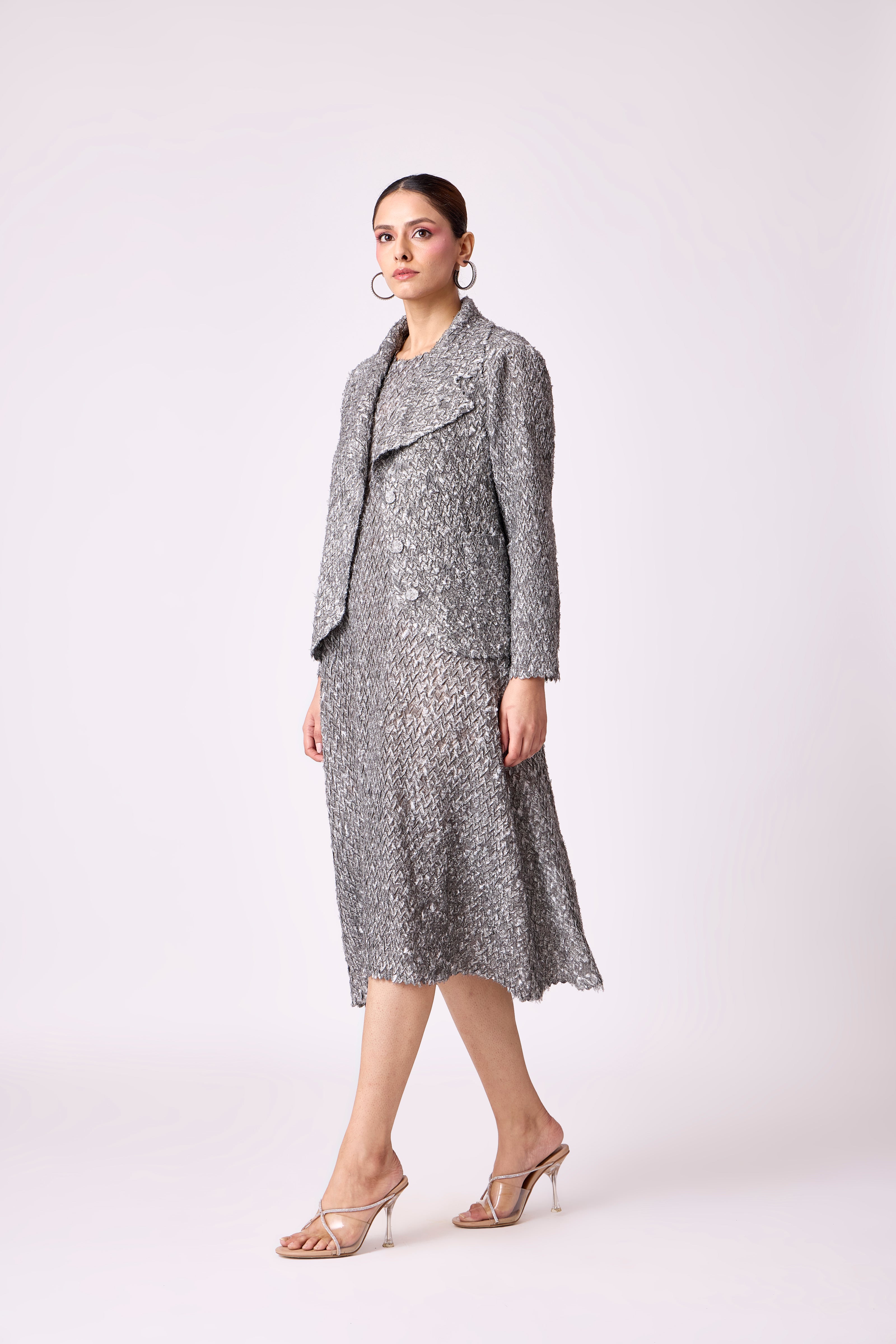 A midi dress in textured pleated fabric with a matching overlay creating a refined, structured silhouette.