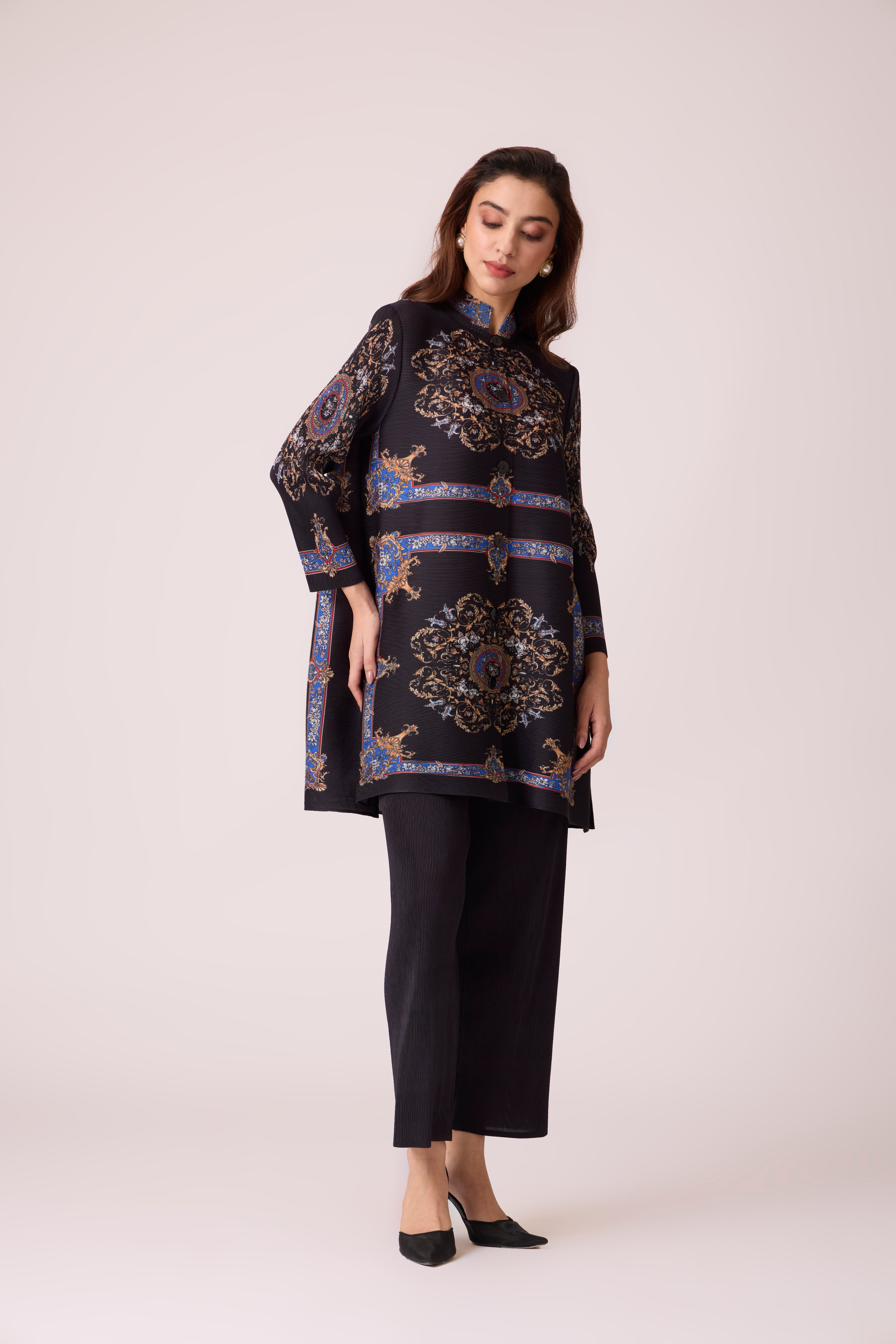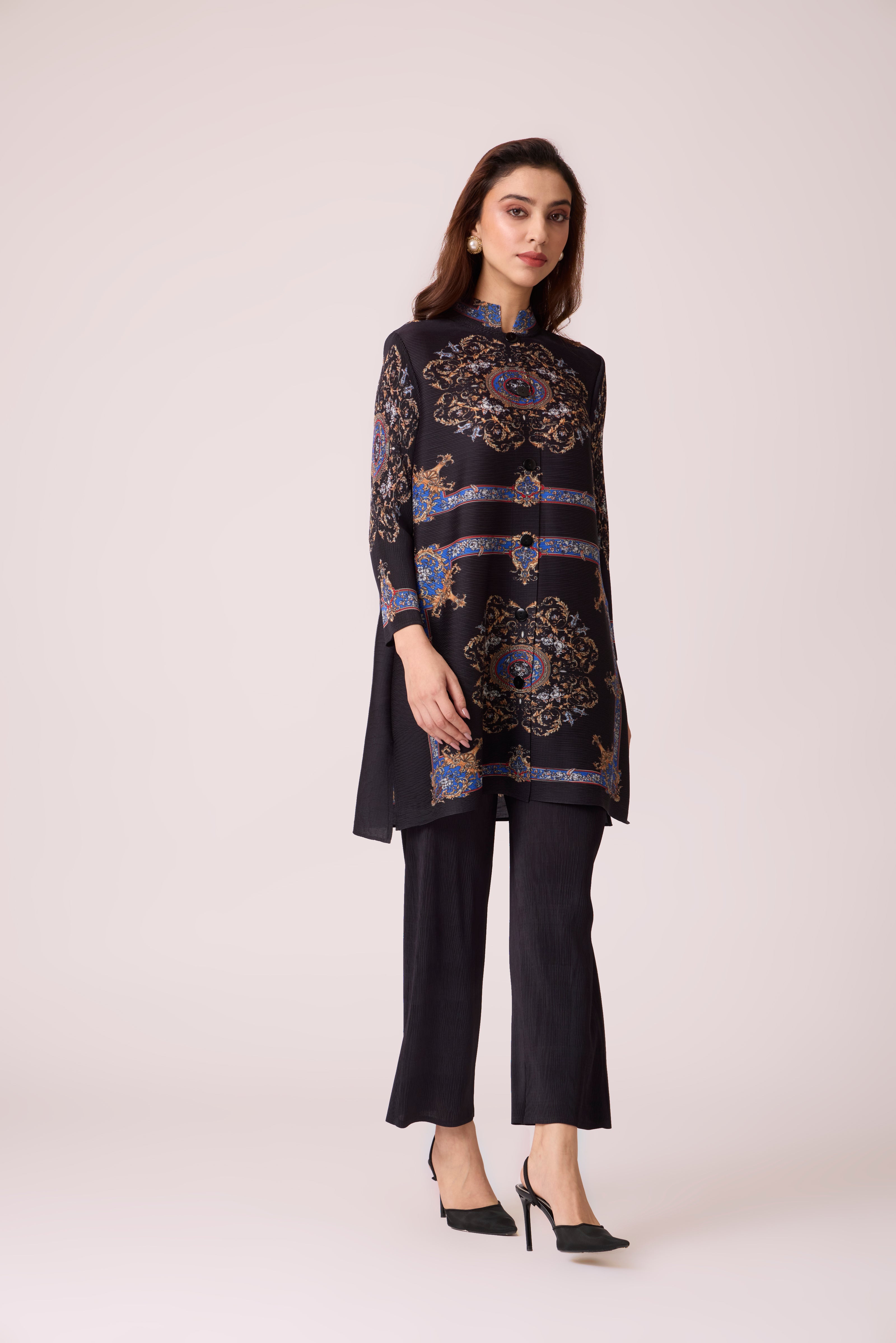 A-line, tunic-style shirt rendered in a statement art deco-inspired print, paired with straight pants.