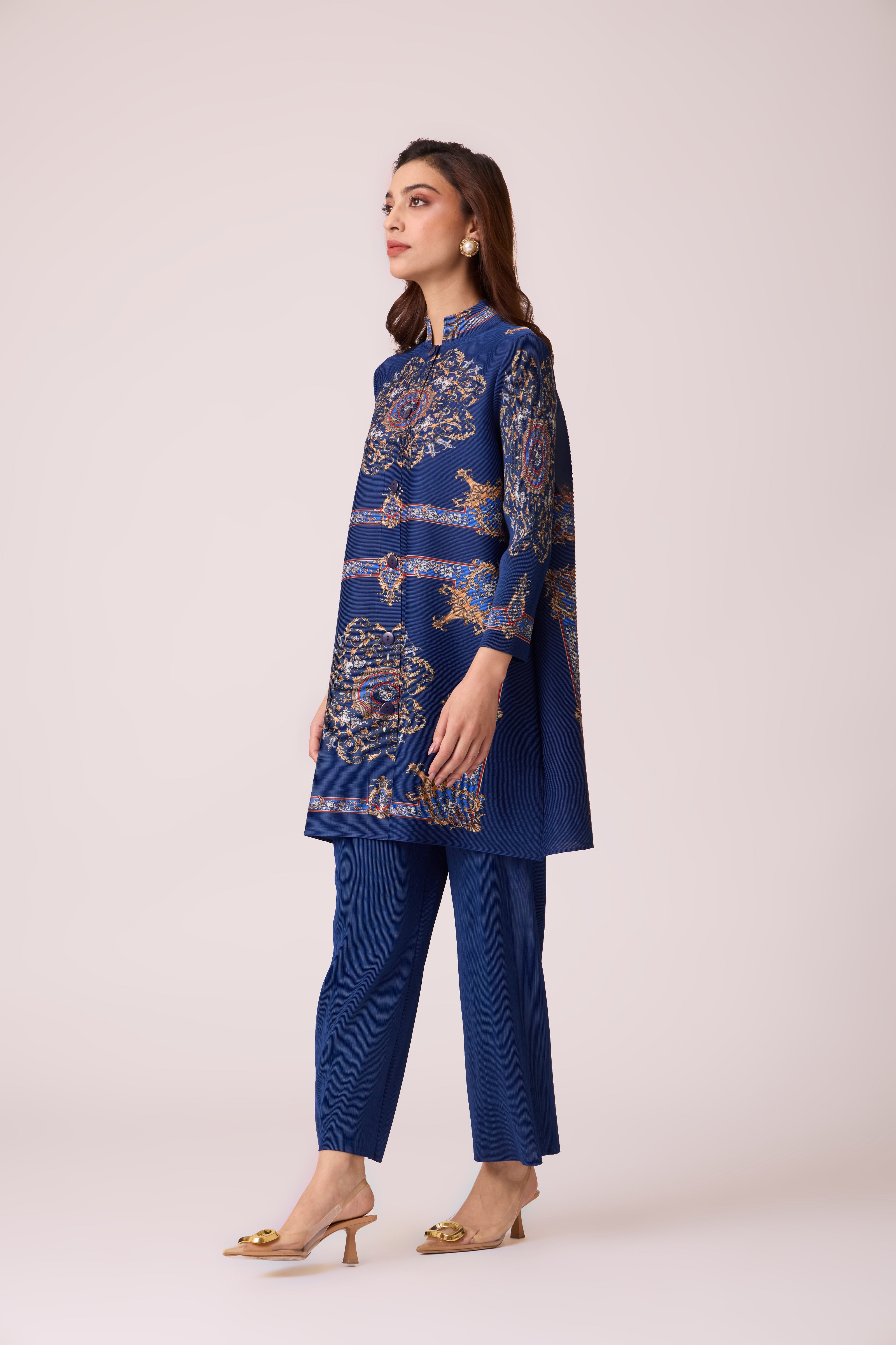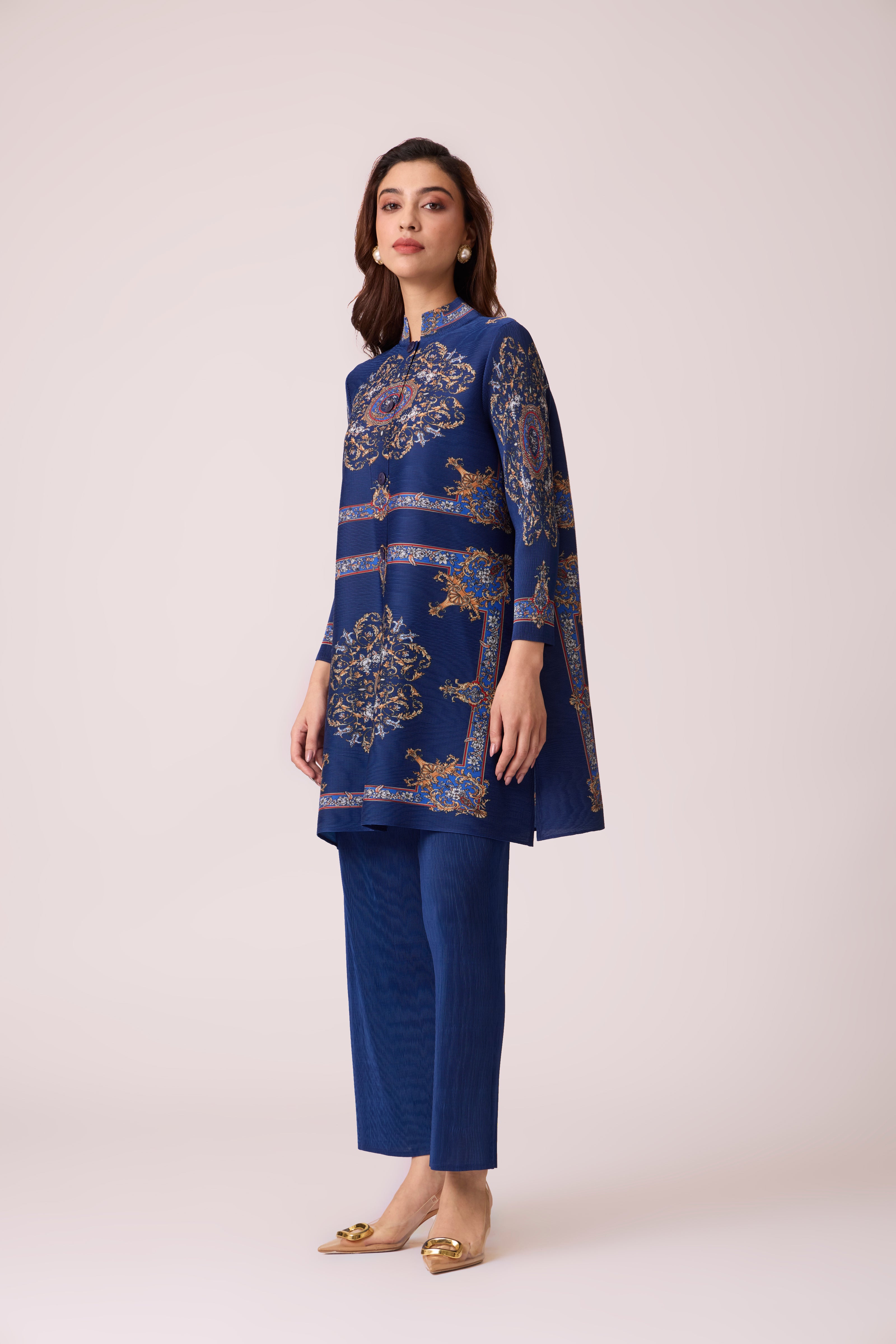 A-line, tunic-style shirt rendered in a statement art deco-inspired print, paired with straight pants.