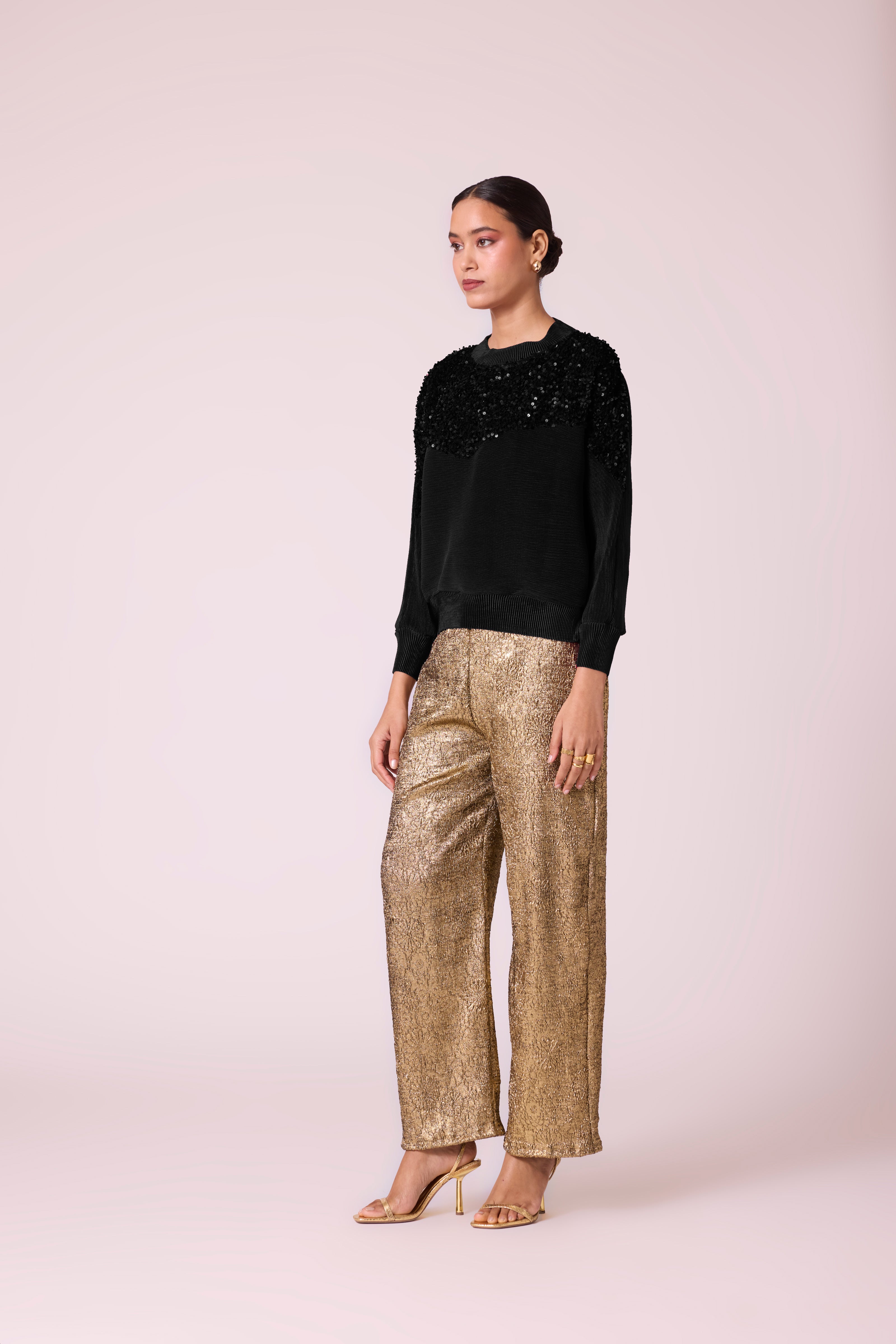 A velvet pleated sweater like top with a sequined yoke, perfect for festive winters and evening outdoor parties.