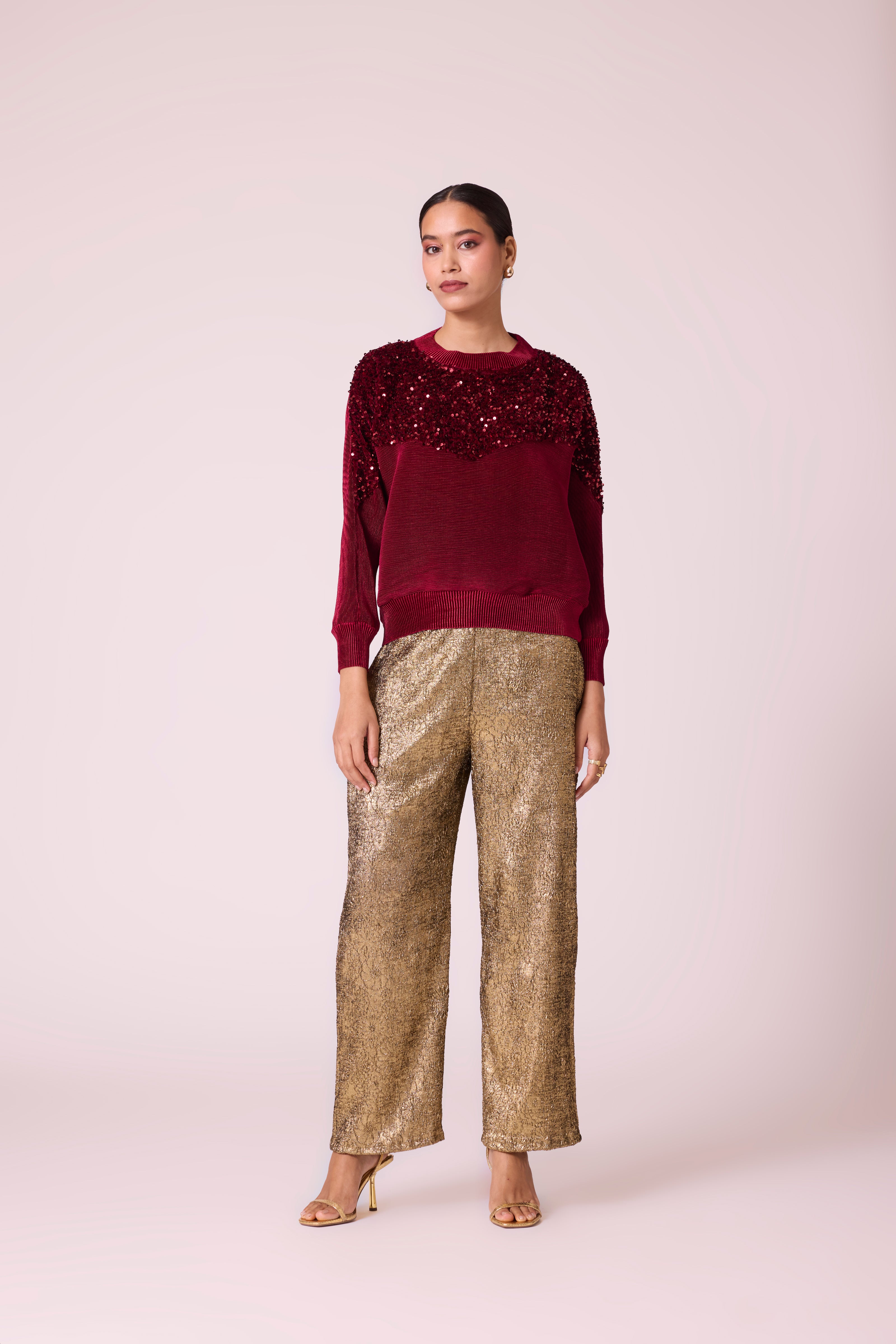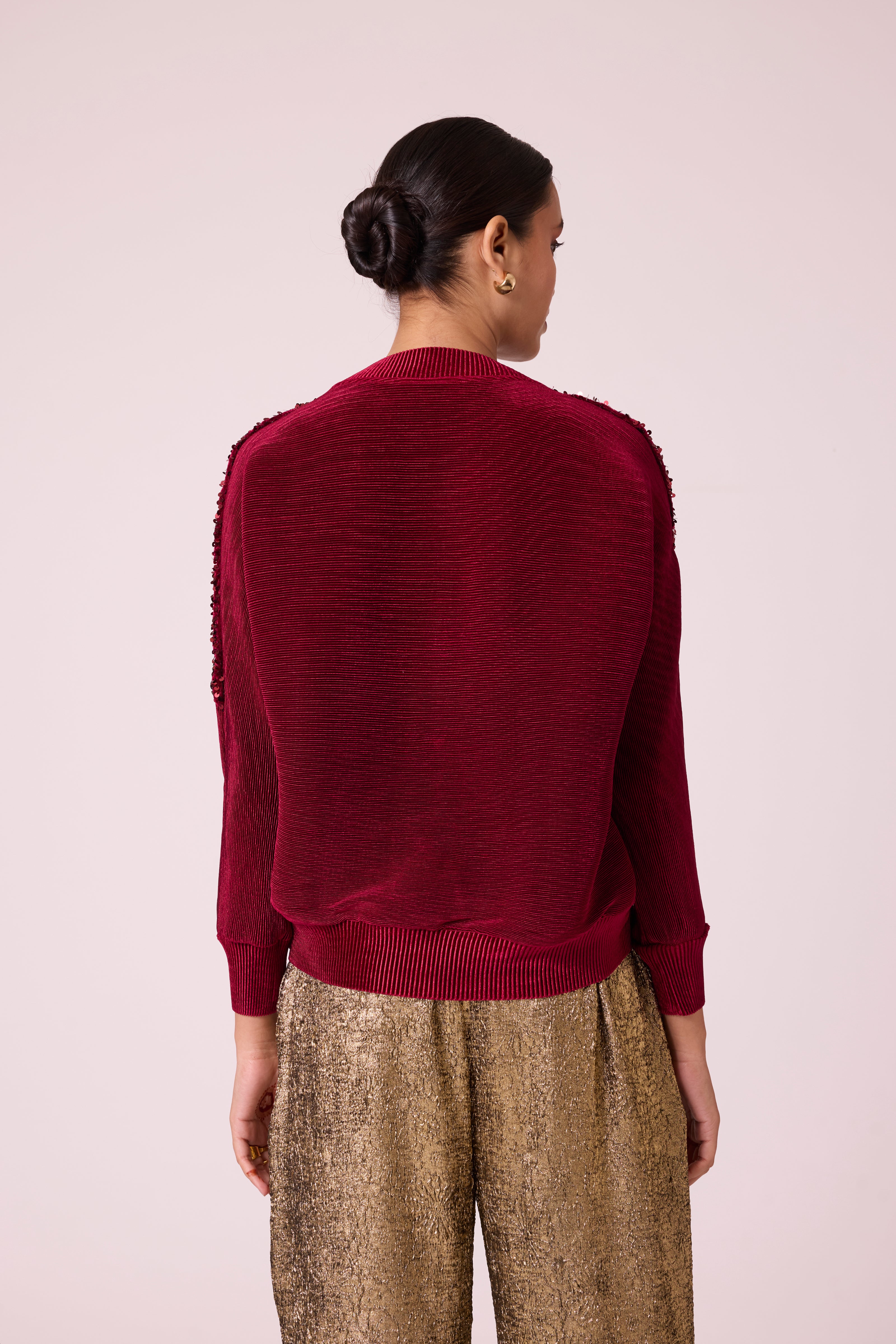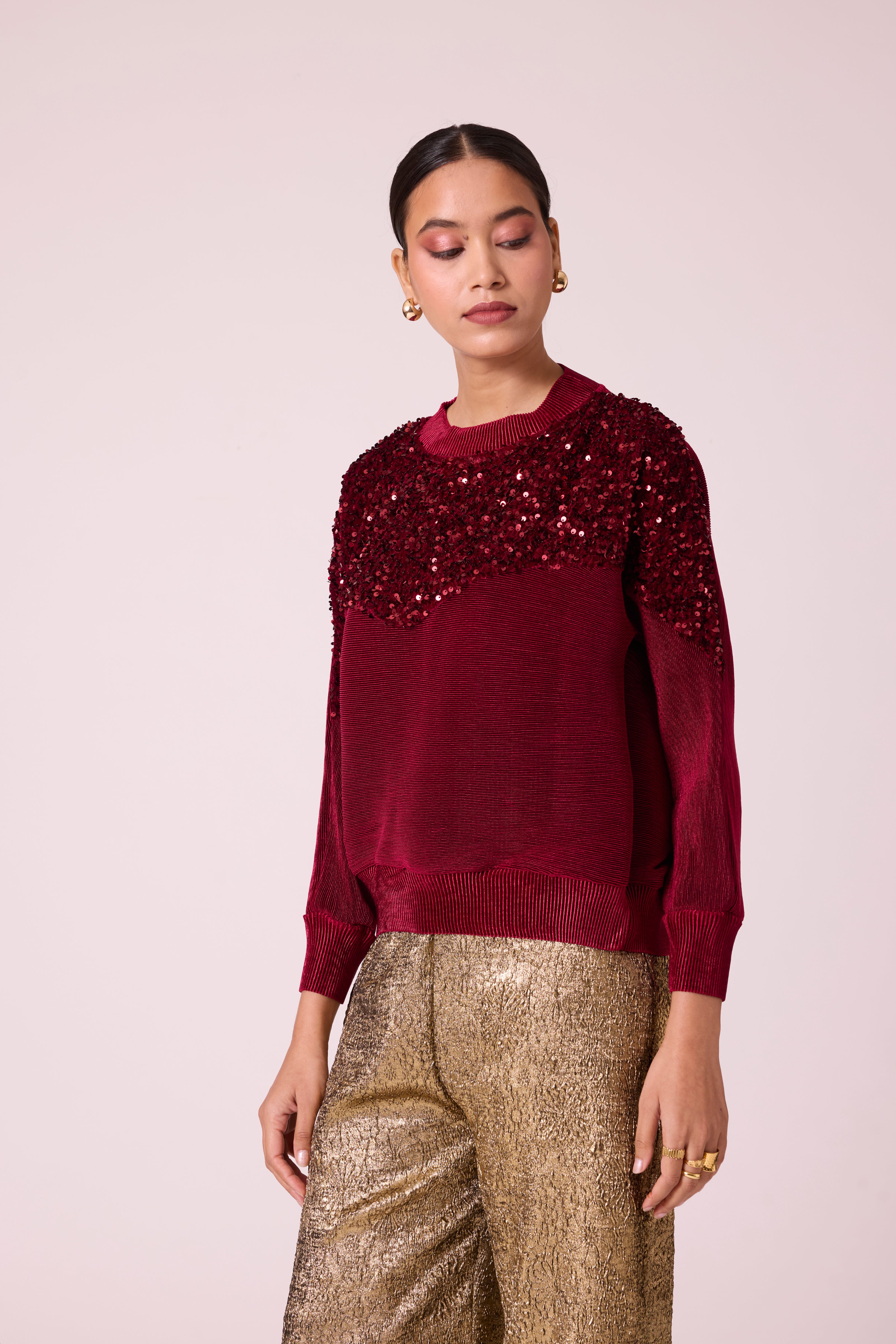 A velvet pleated sweater like top with a sequined yoke, perfect for festive winters and evening outdoor parties.