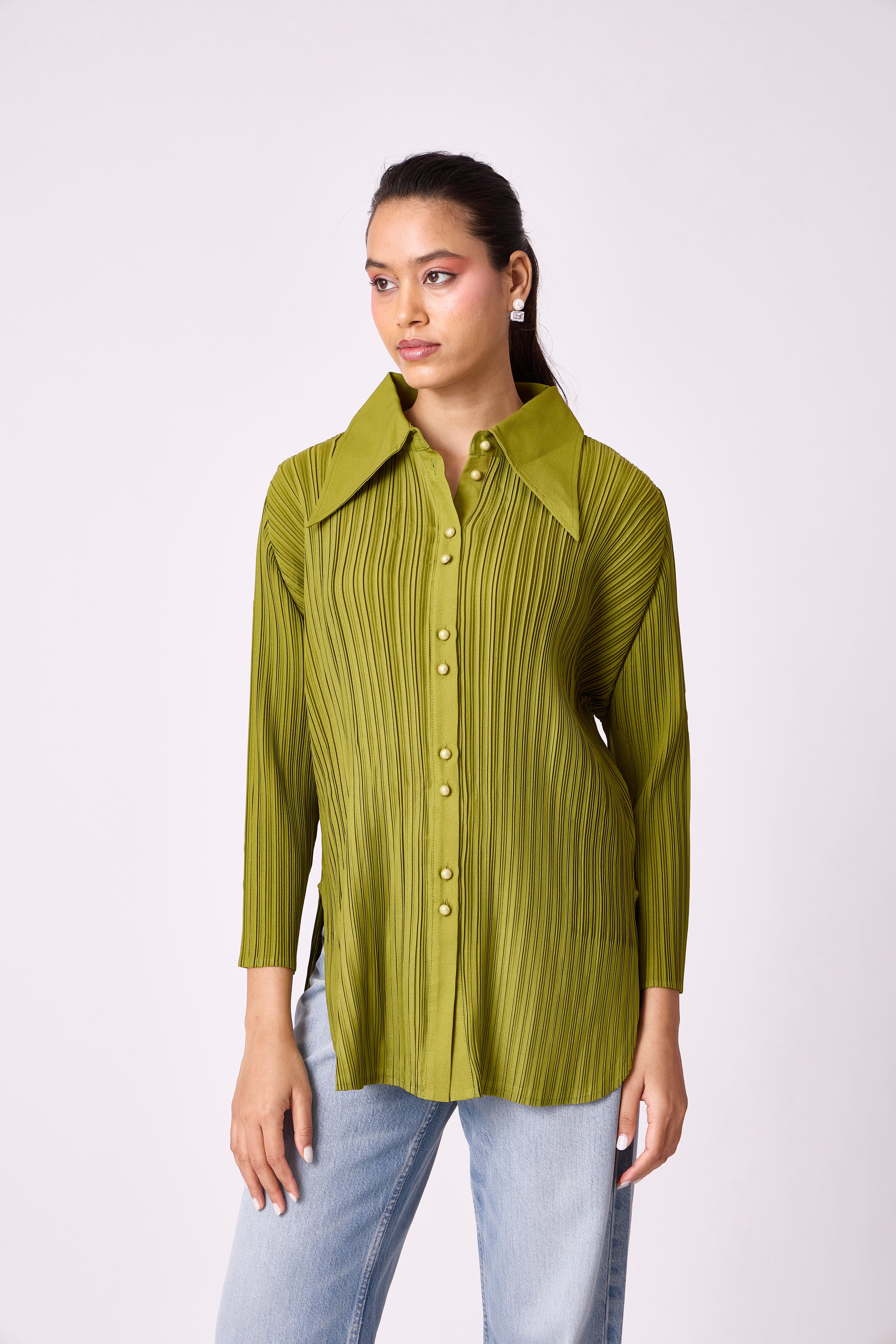 A pleated button-down shirt with a structured collar and clean silhouette, perfect for effortless everyday styling.