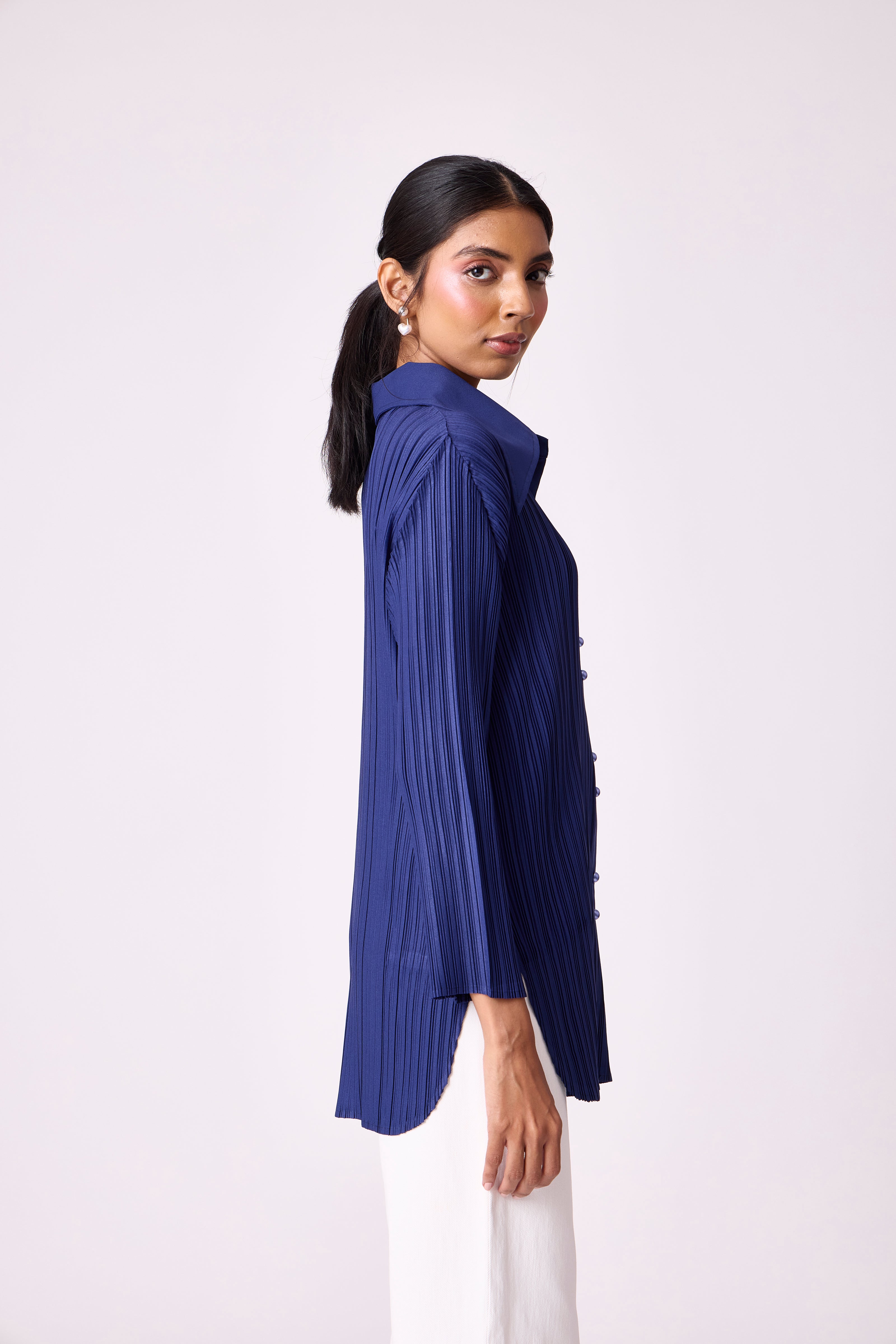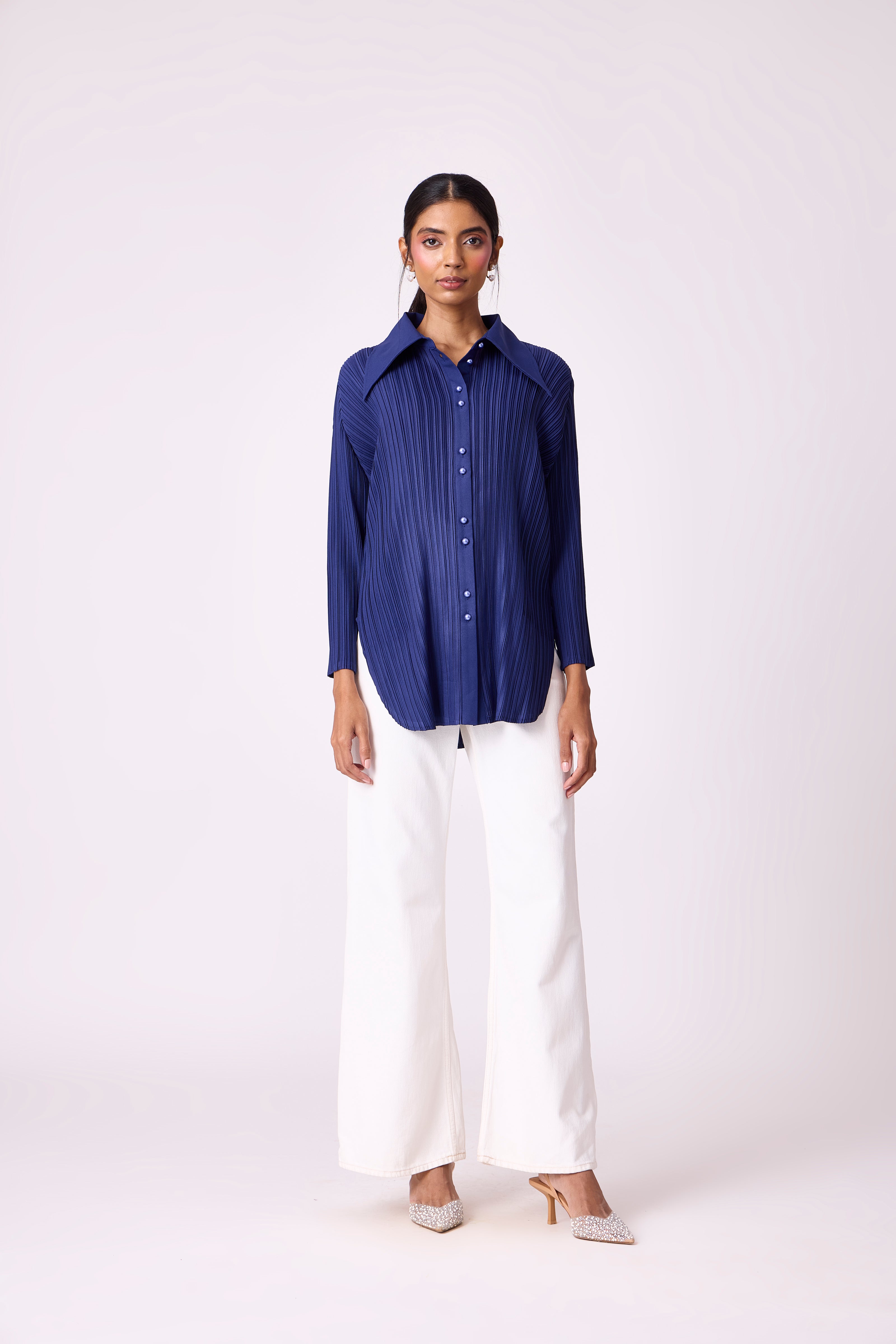 A pleated button-down shirt with a structured collar and clean silhouette, perfect for effortless...