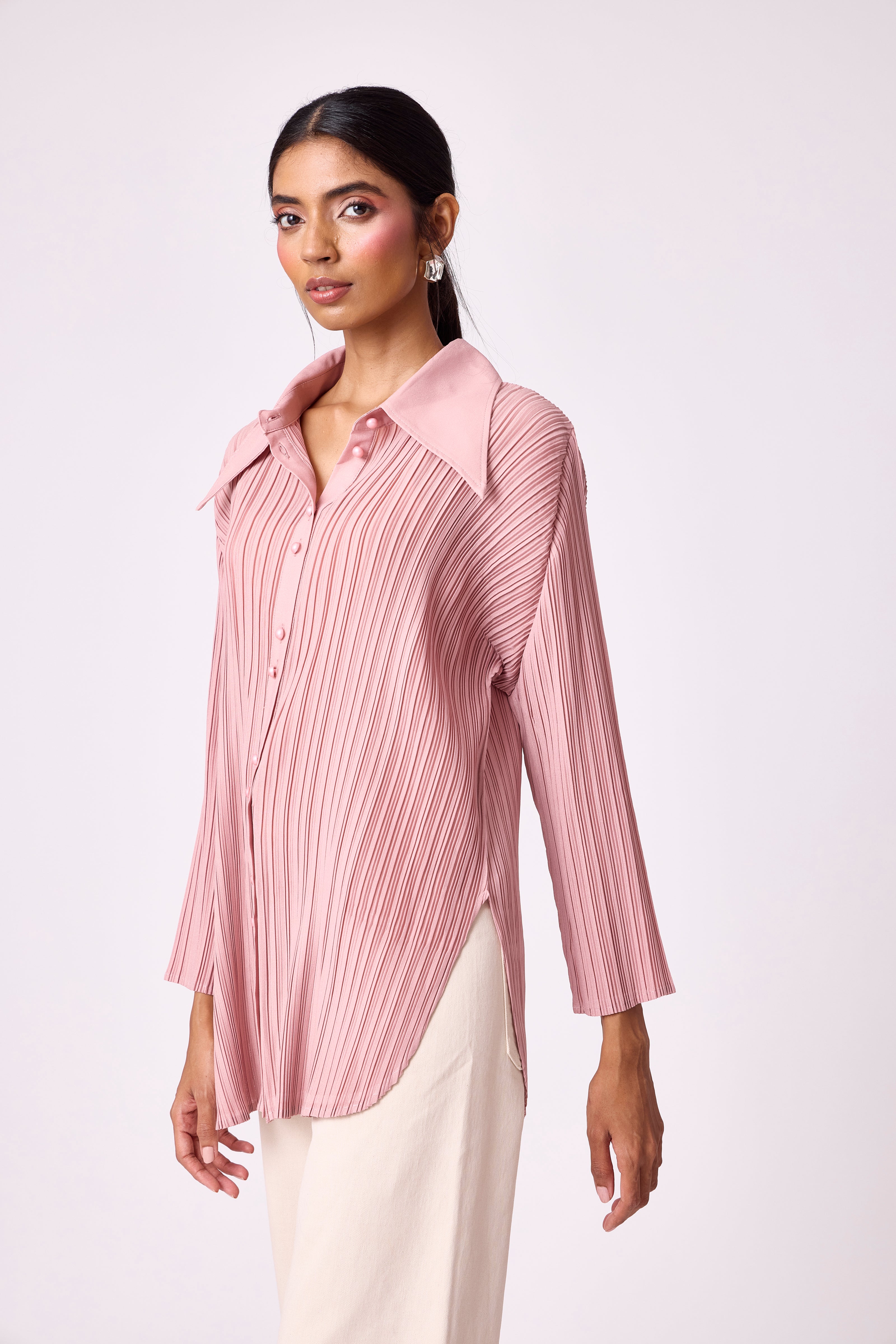 A pleated button-down shirt with a structured collar and clean silhouette, perfect for effortless...