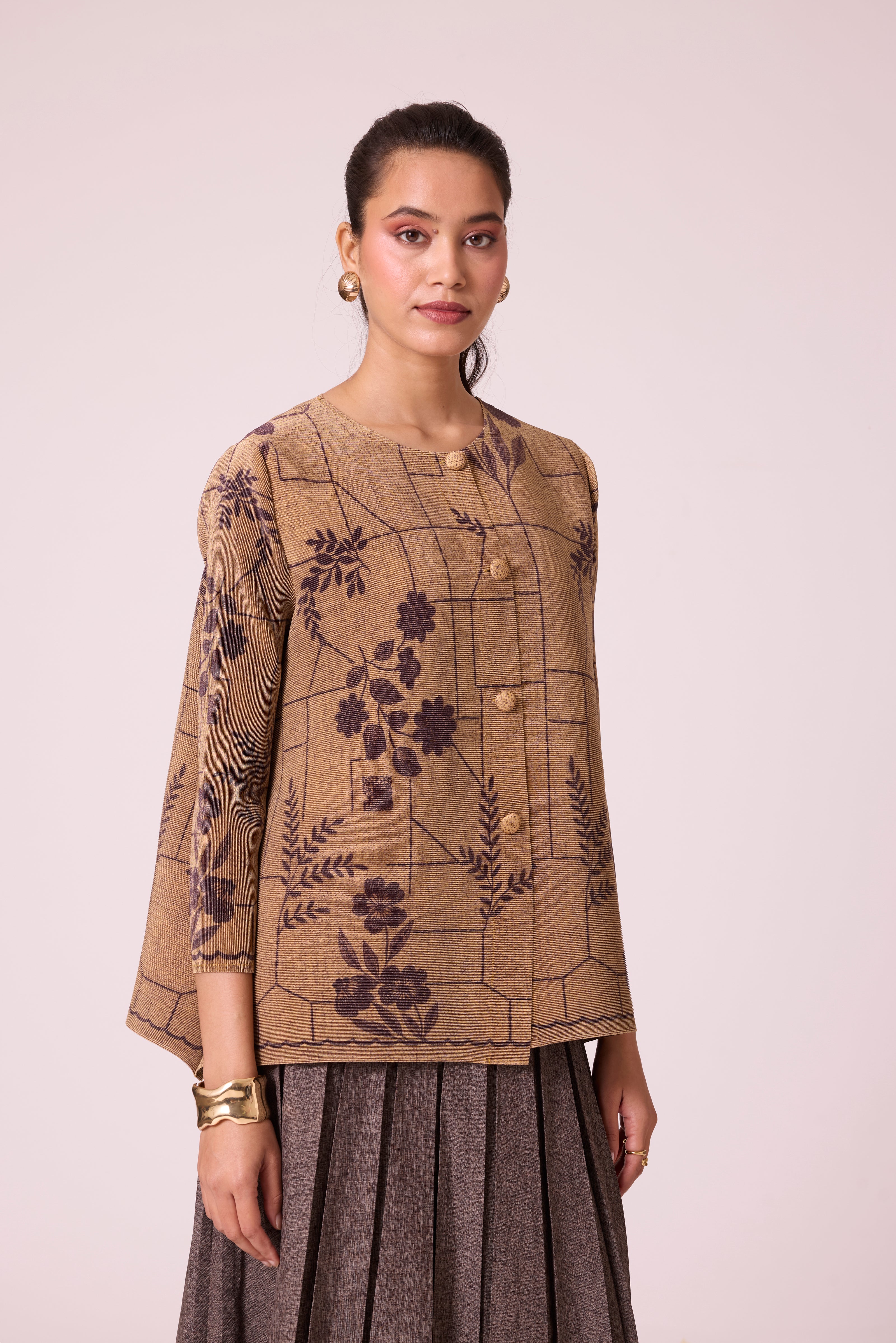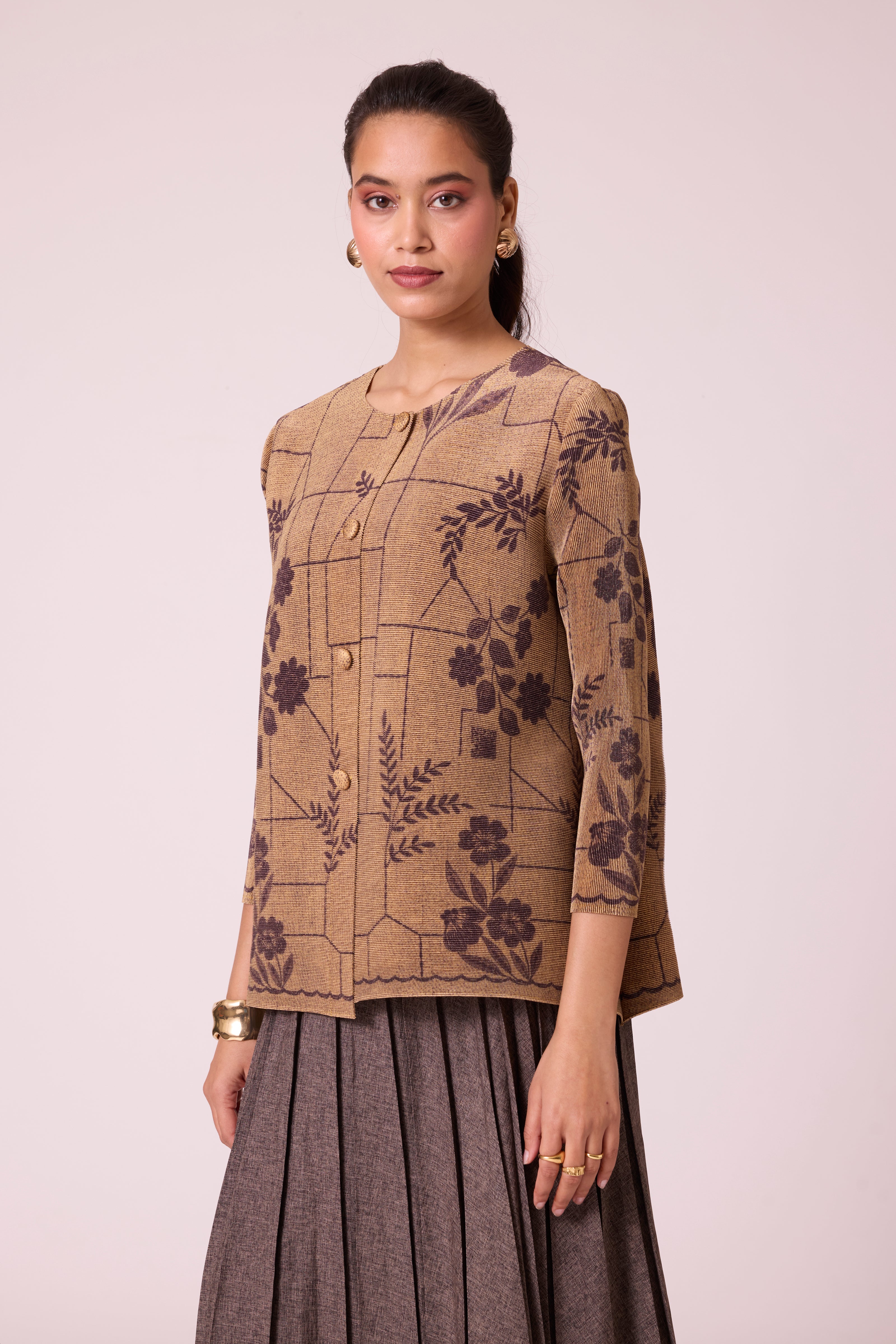 A classic button down pleated shirt in a floral yet geometric textured print.