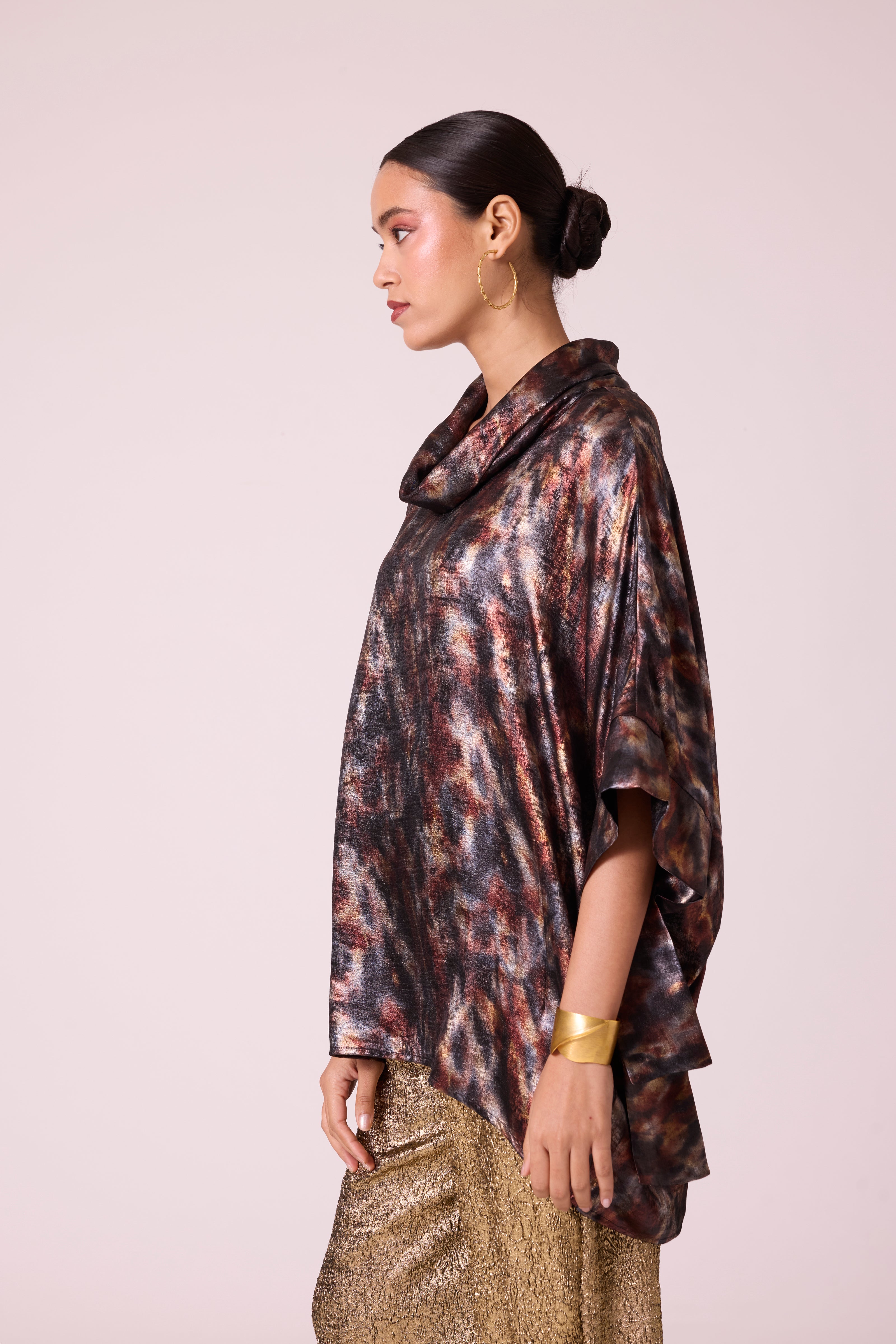 A preset cowl collar, dolman tie detail sleeves top in a metallic finish fabric.
