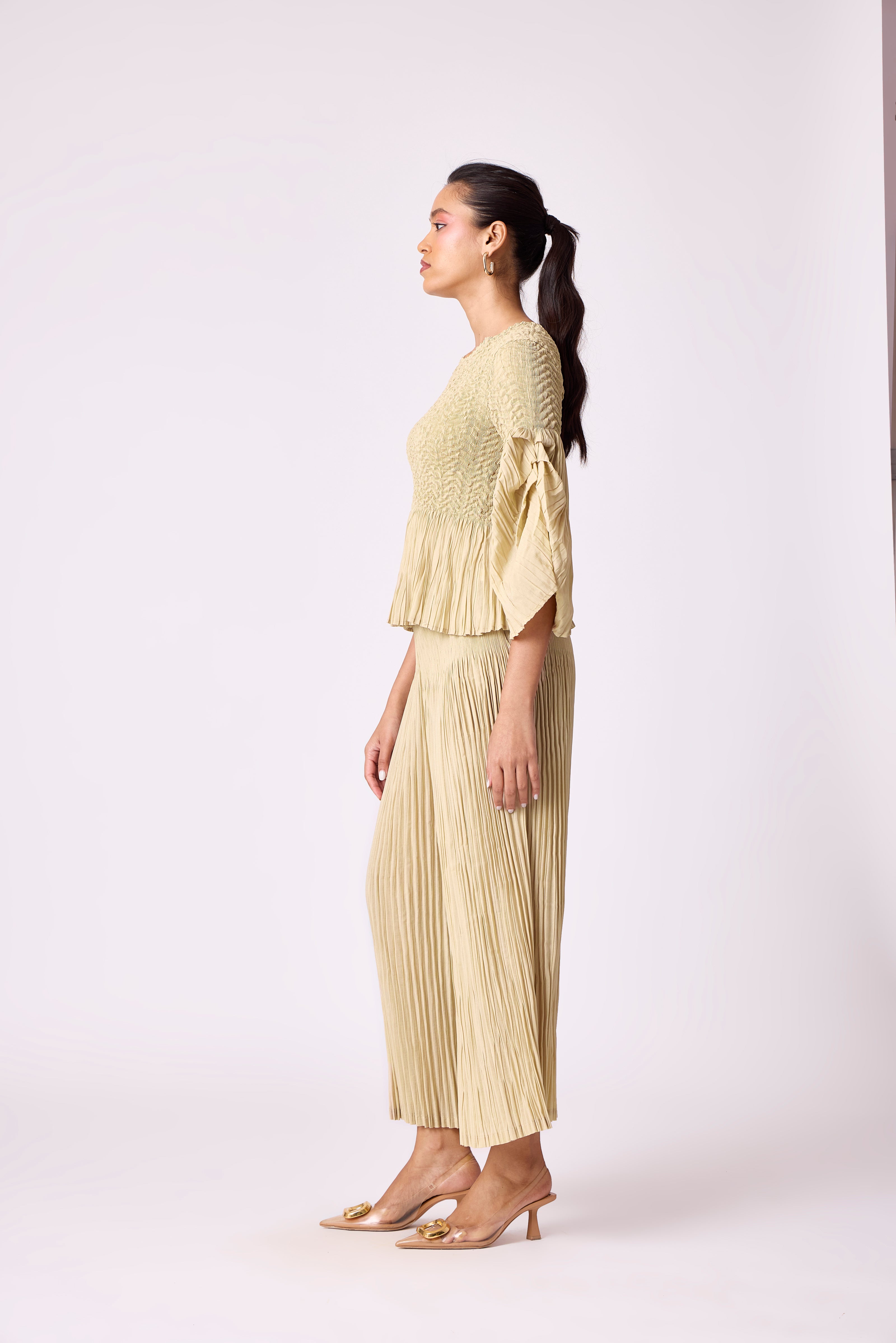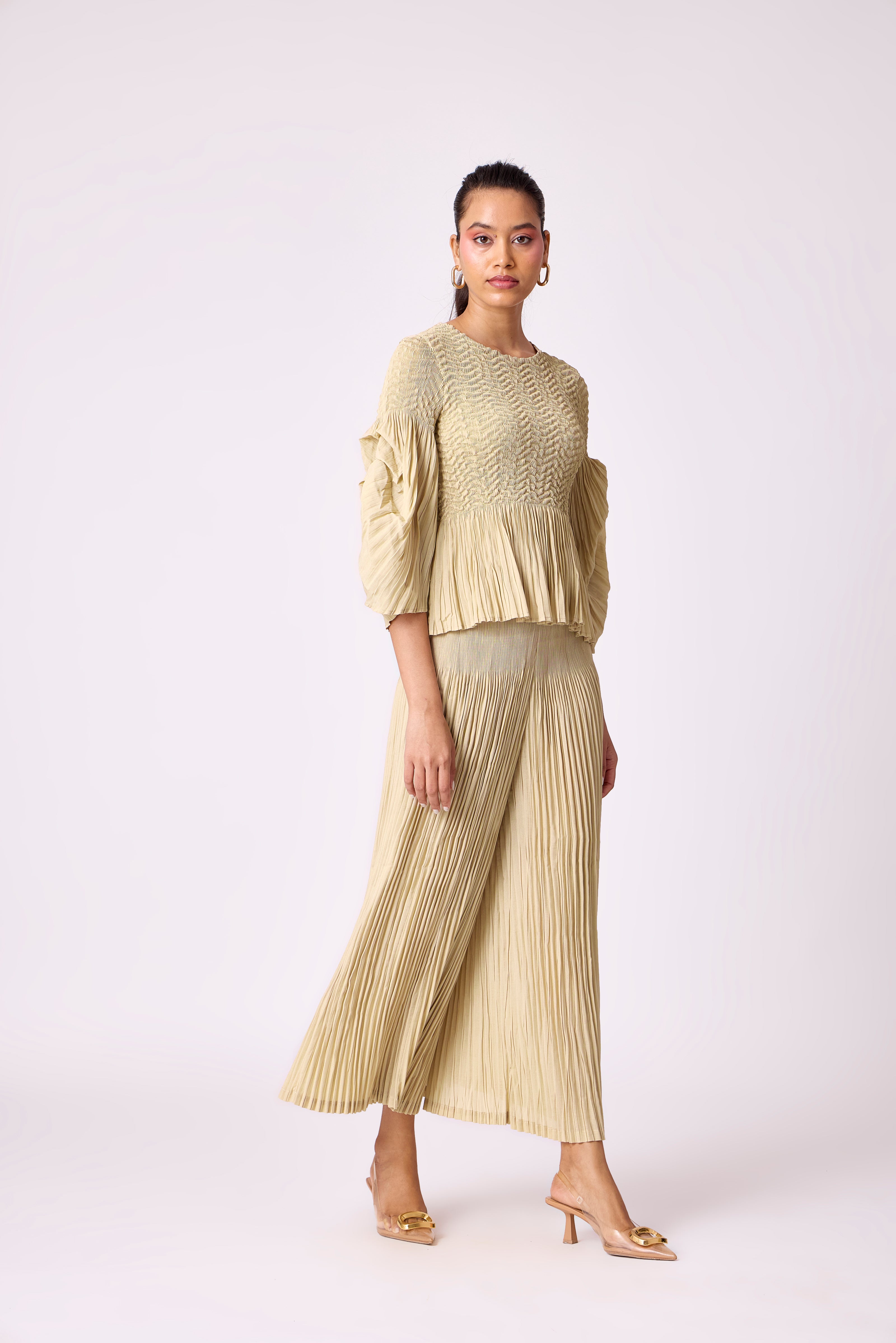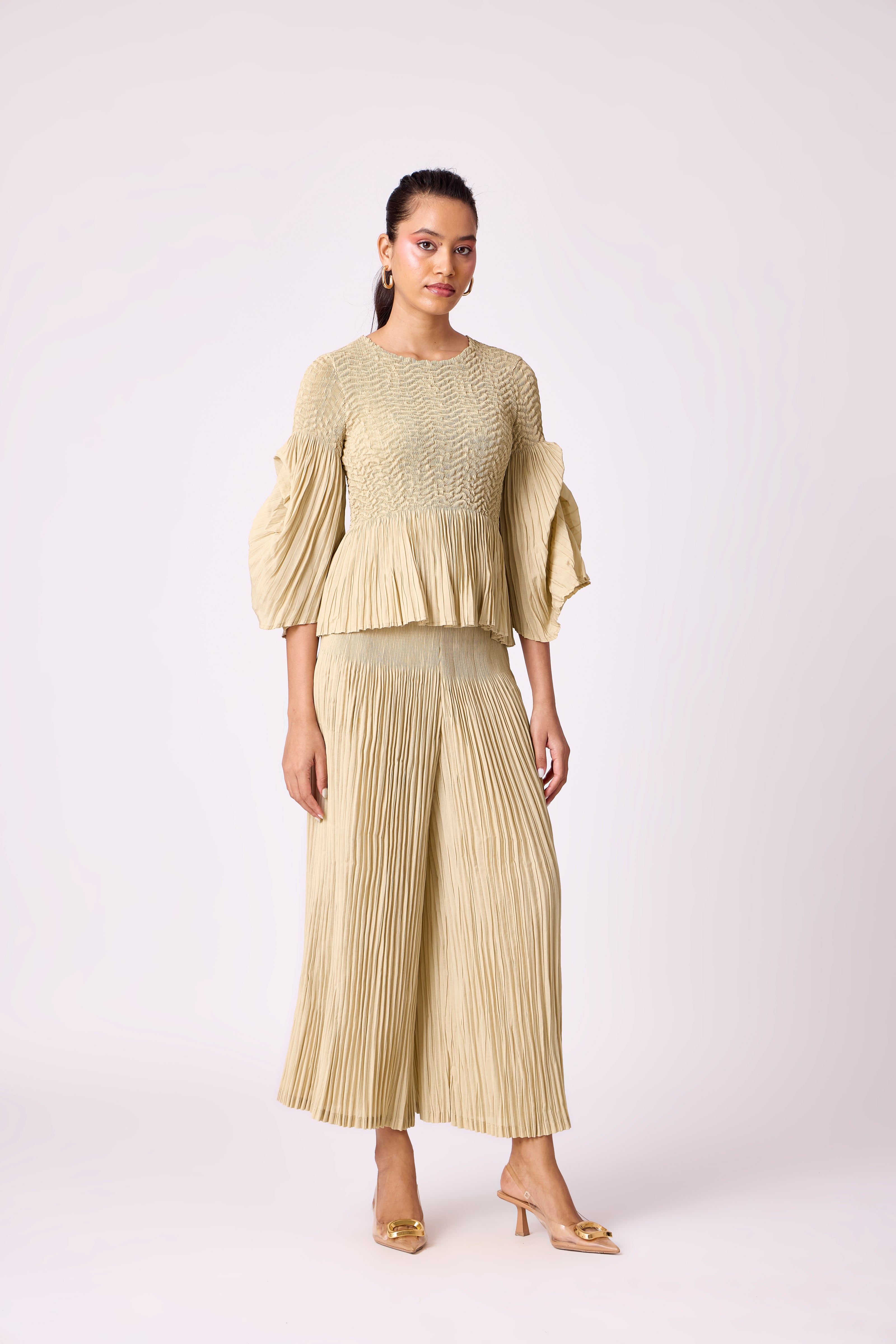 A co-ord set featuring a pleated peplum top with statement sleeves and matching pant.