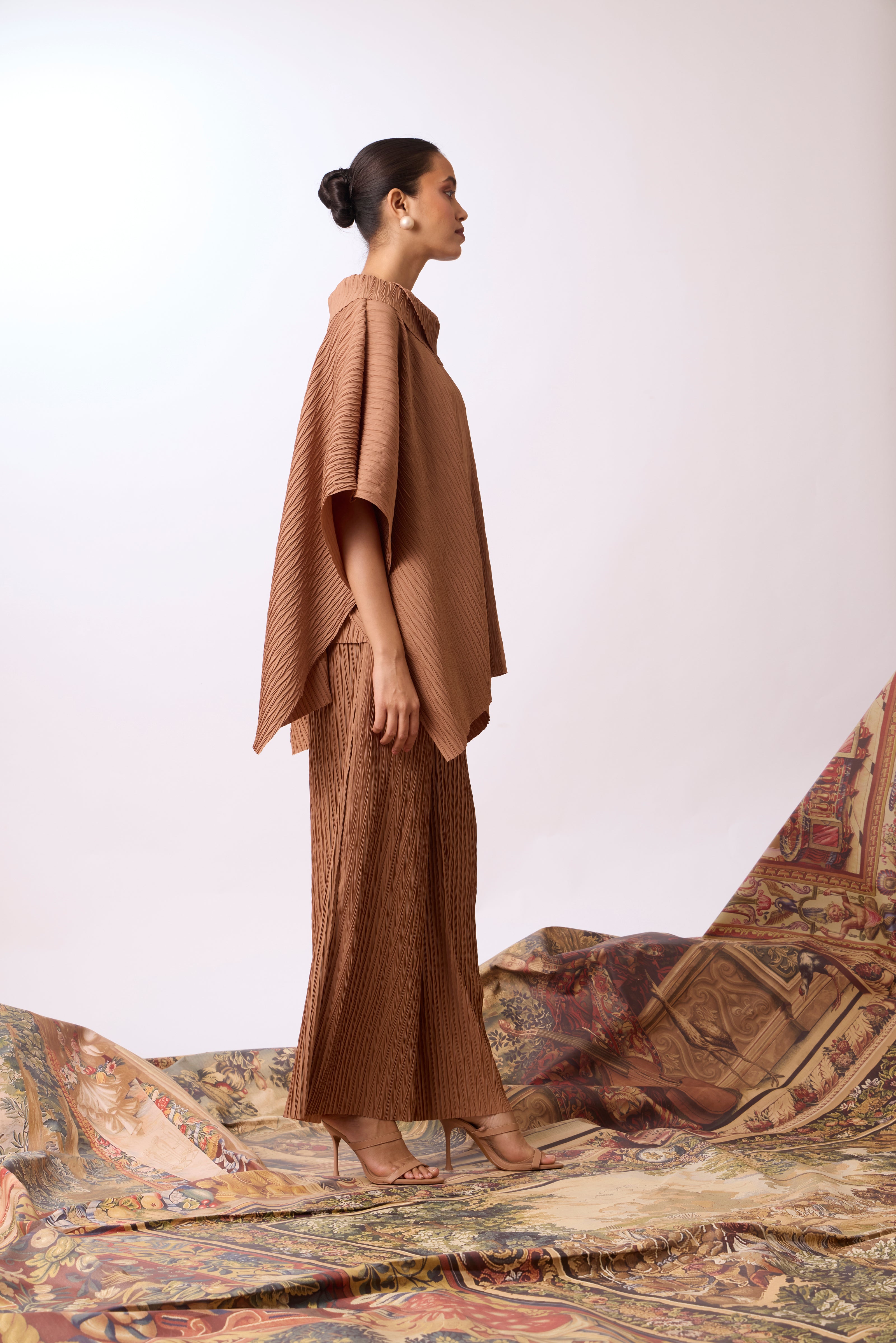 An elegant co-ord set with an overlap turtleneck collar and matching wide leg pants crafted in a soft chevron pleated fabric. Comes with same color slip.