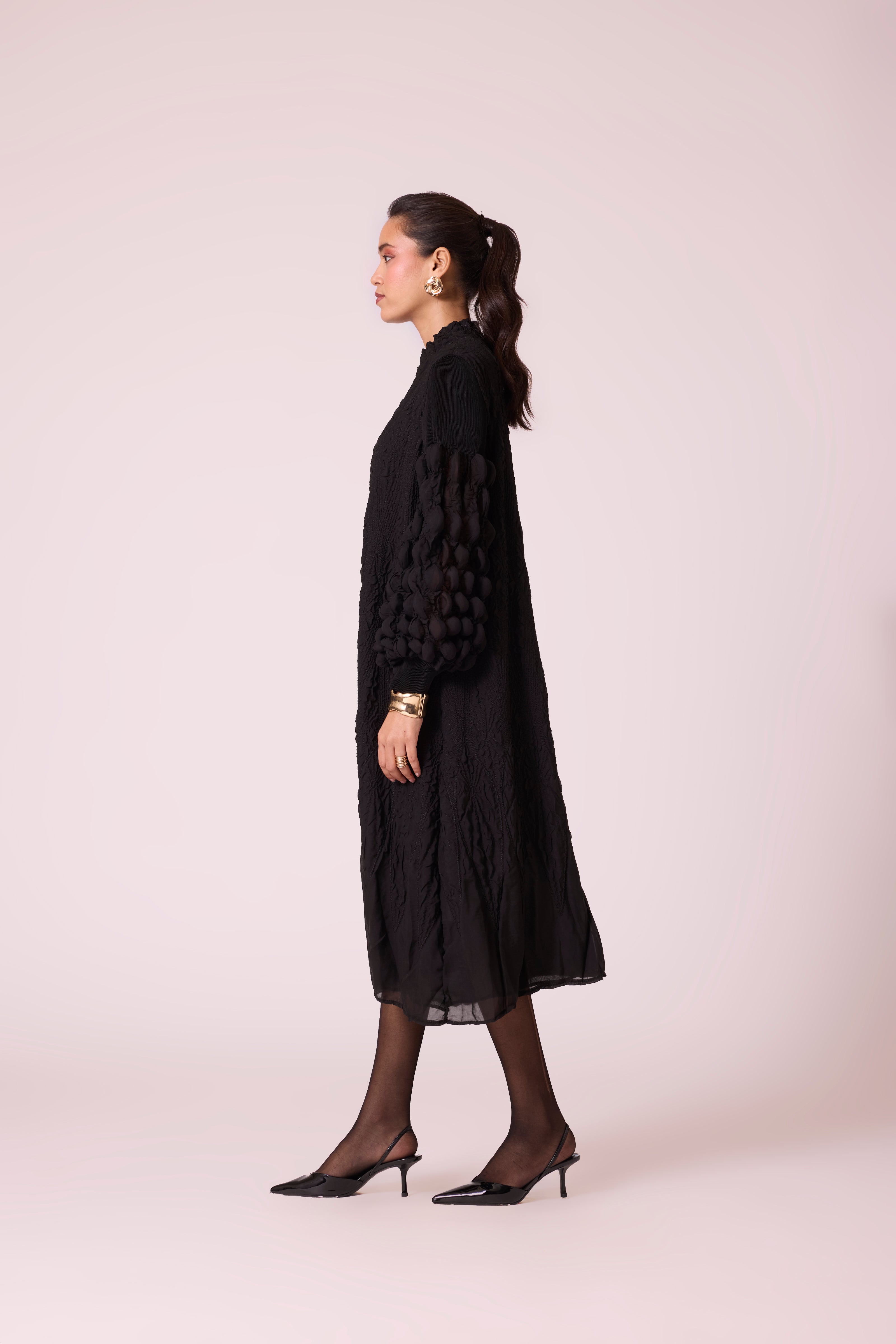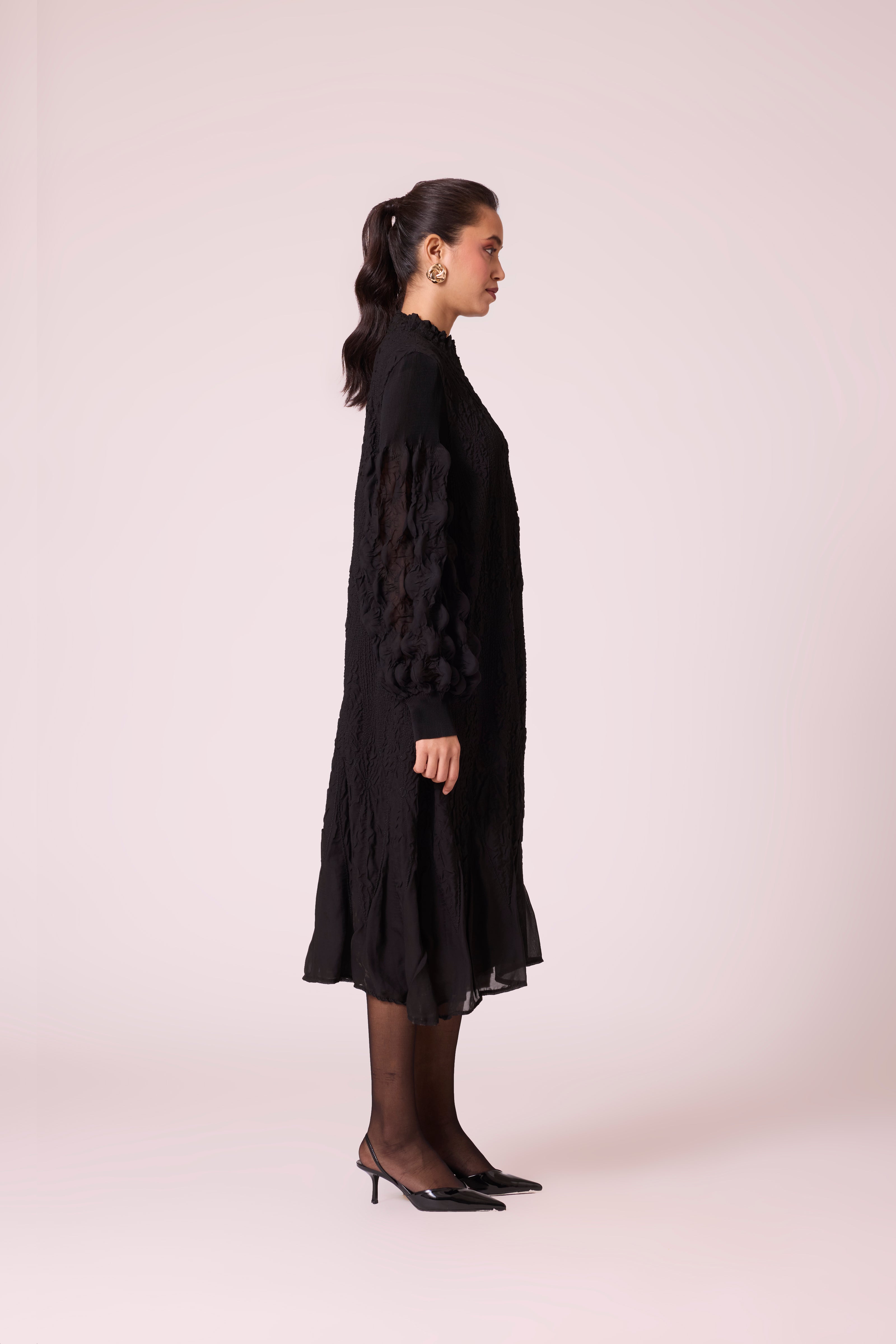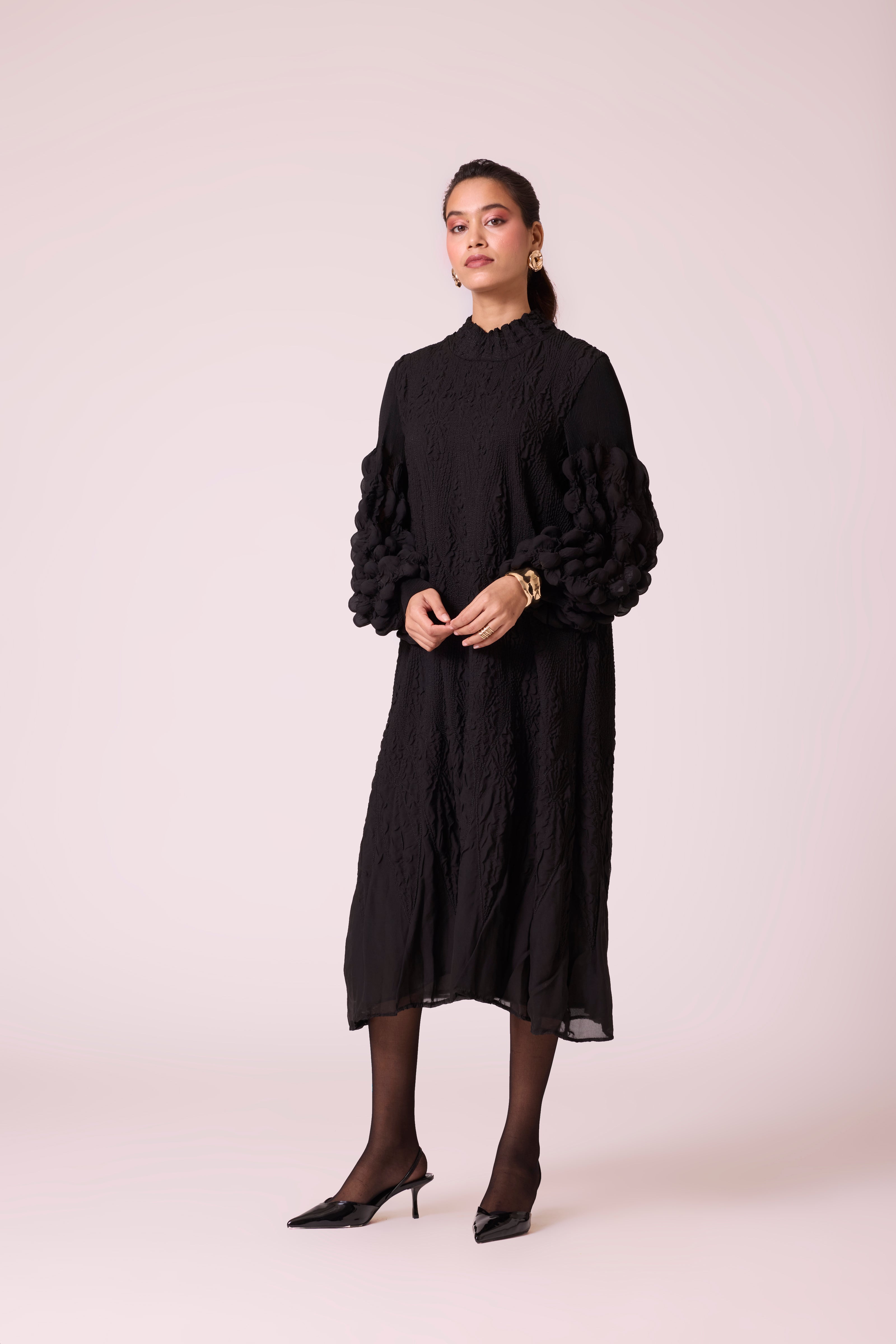 Beautiful bubble pleated sleeves, soft embroidery quilted A line dress in a soft light weight fabric.