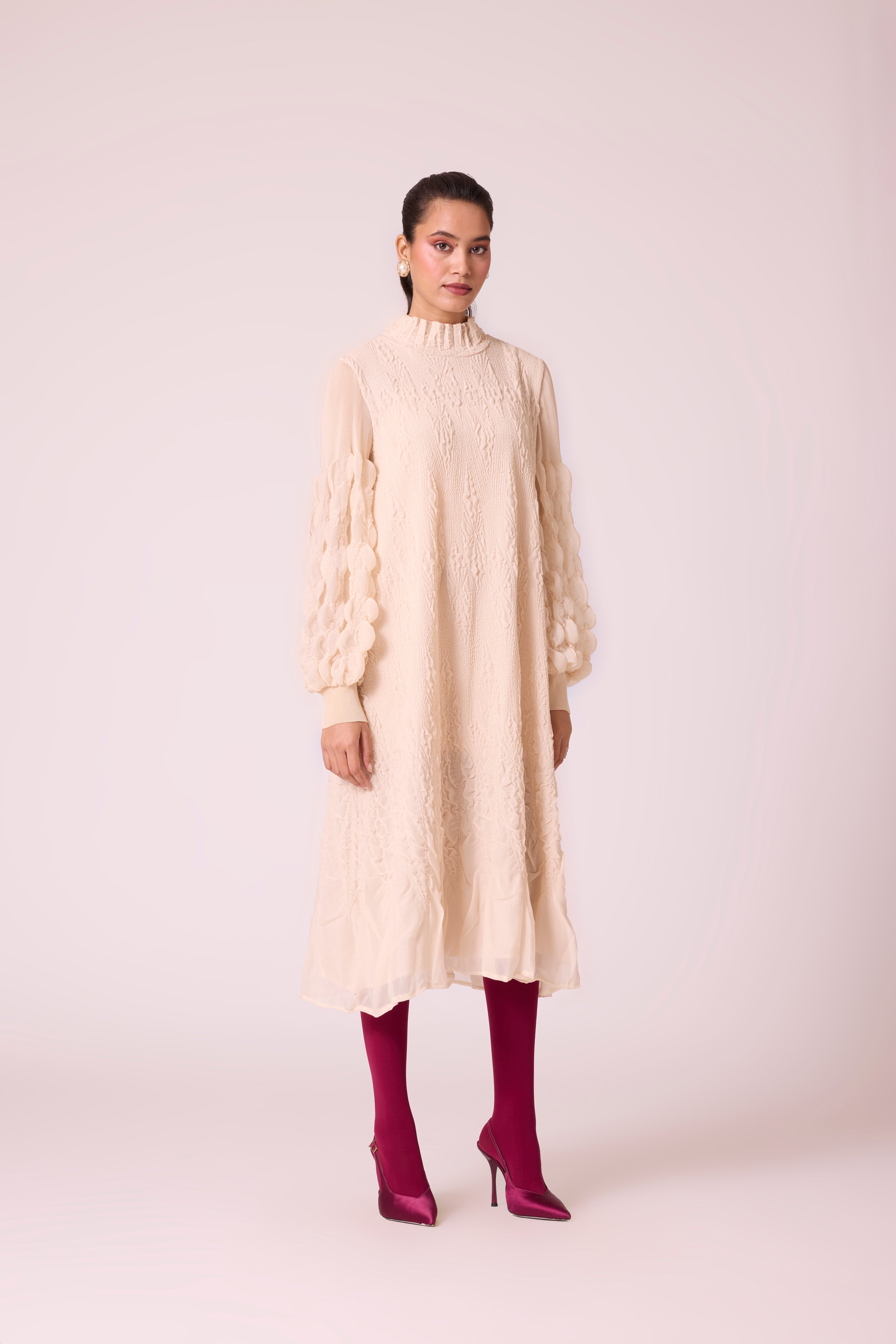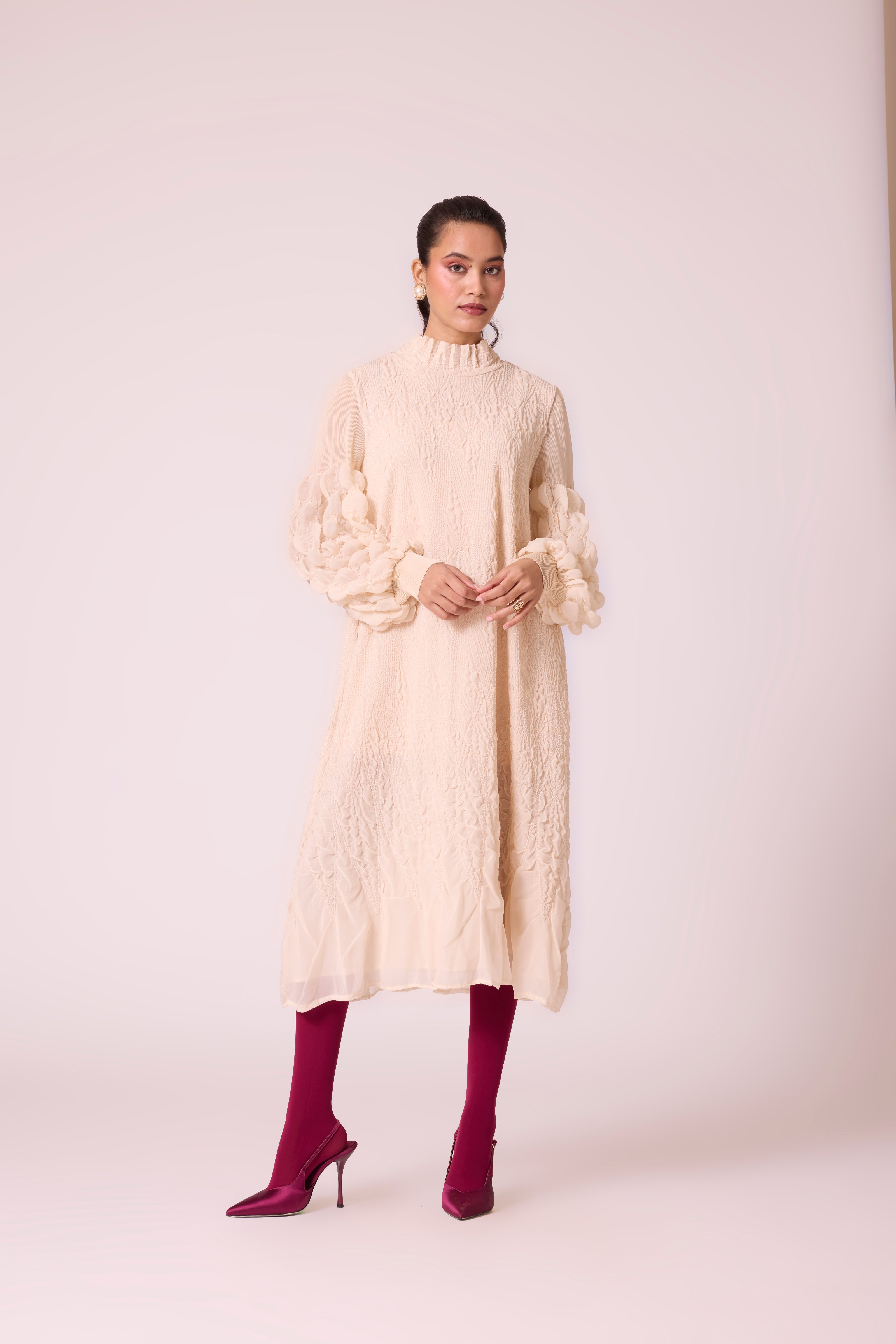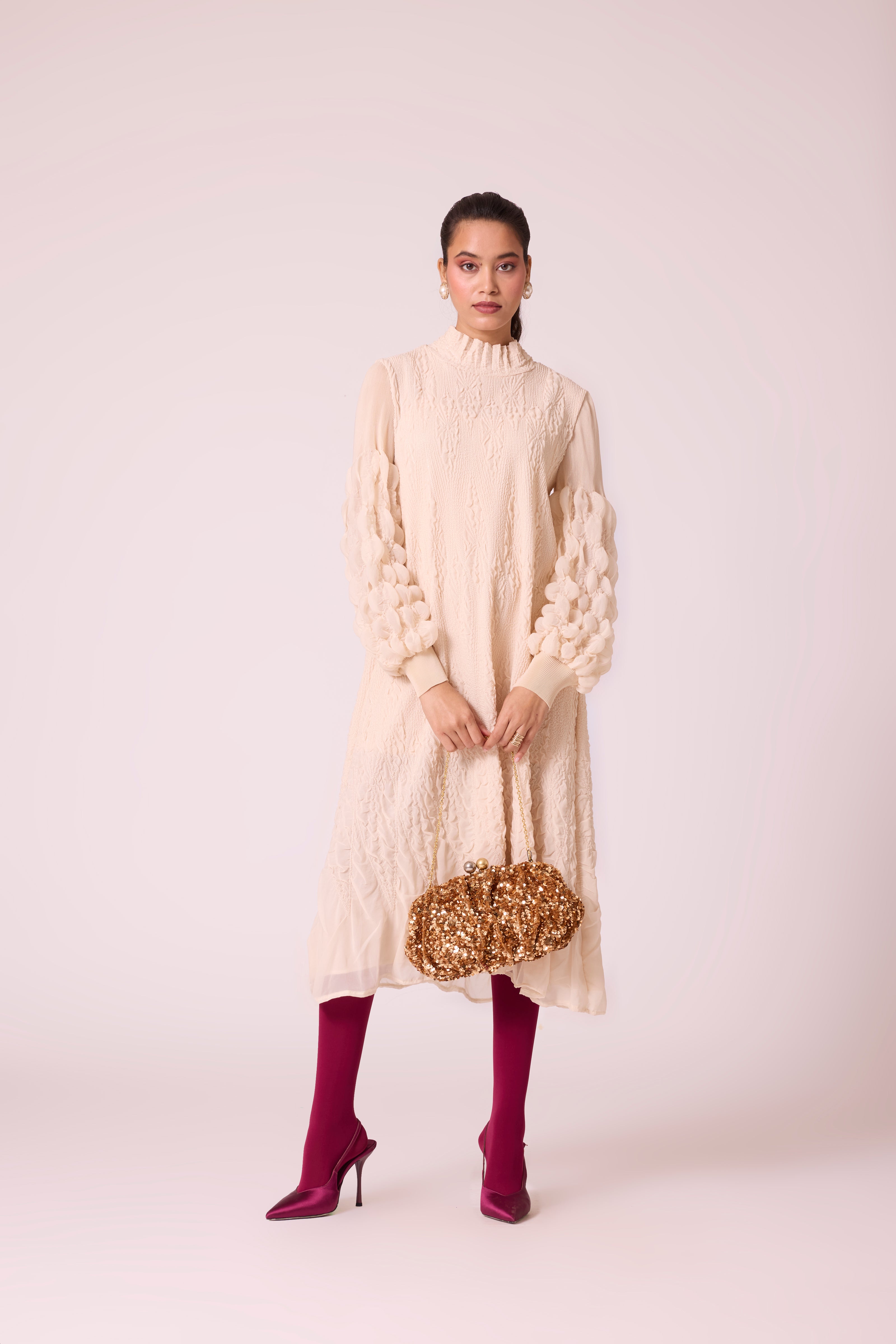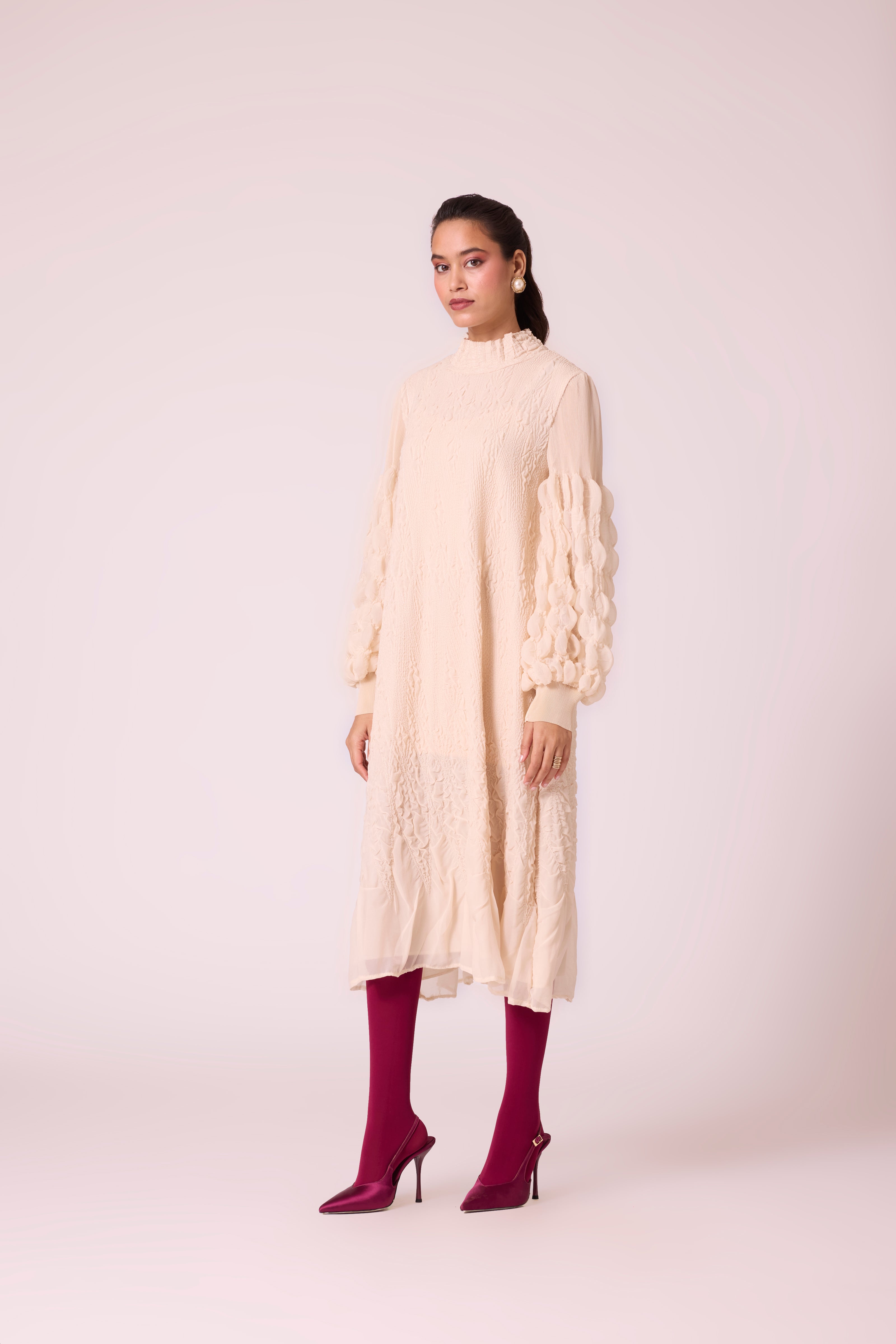 Beautiful bubble pleated sleeves, soft embroidery quilted A line dress in a soft light...