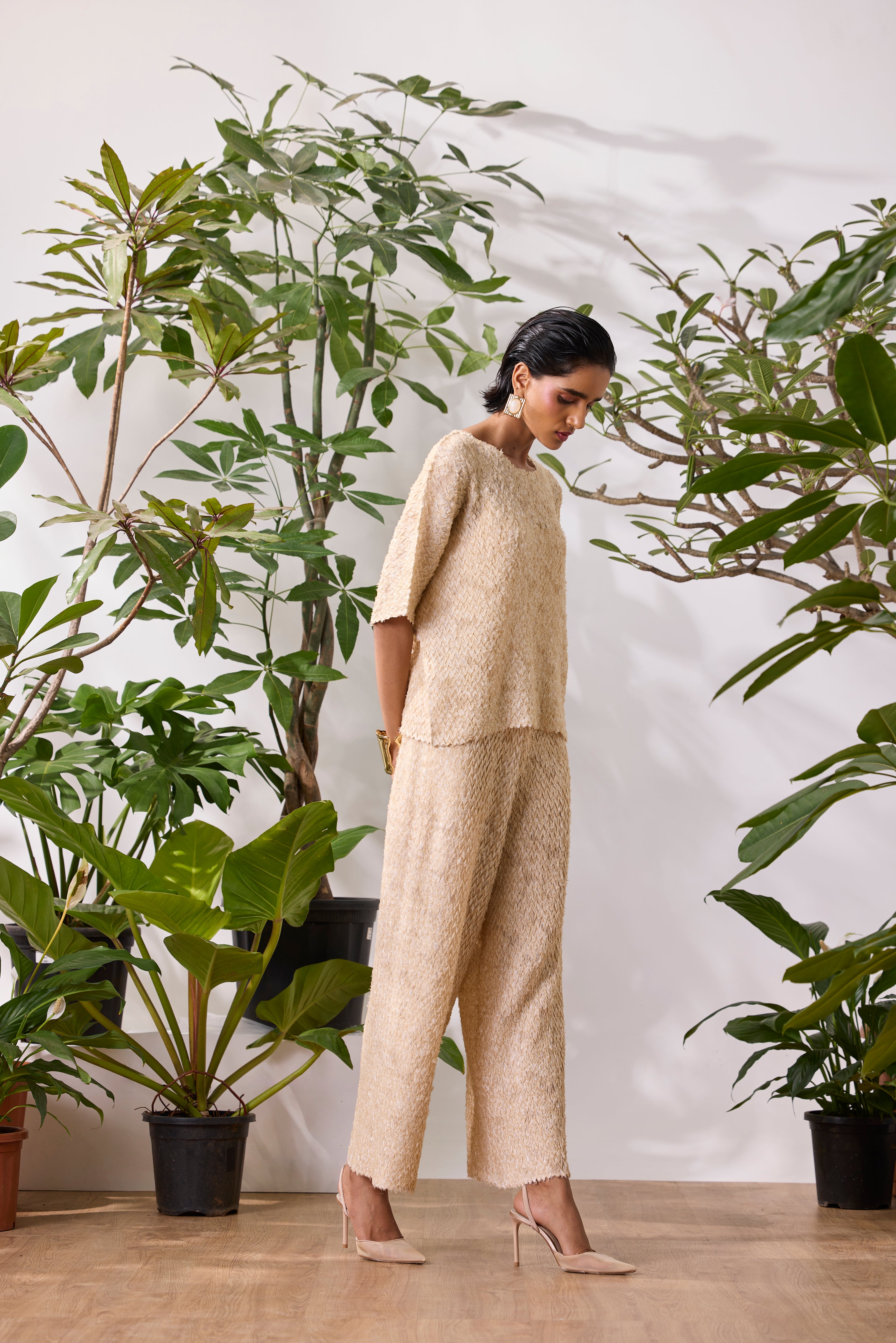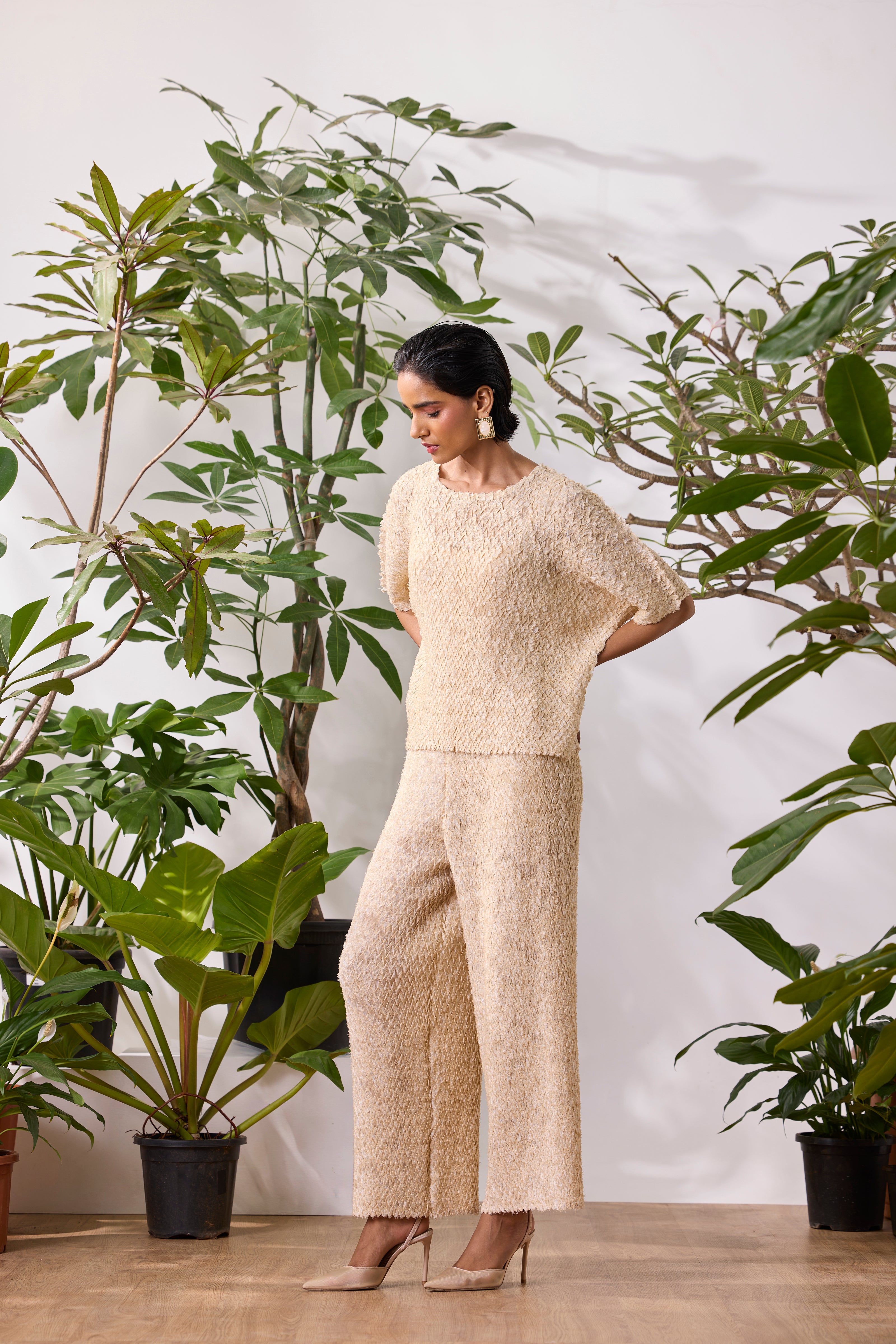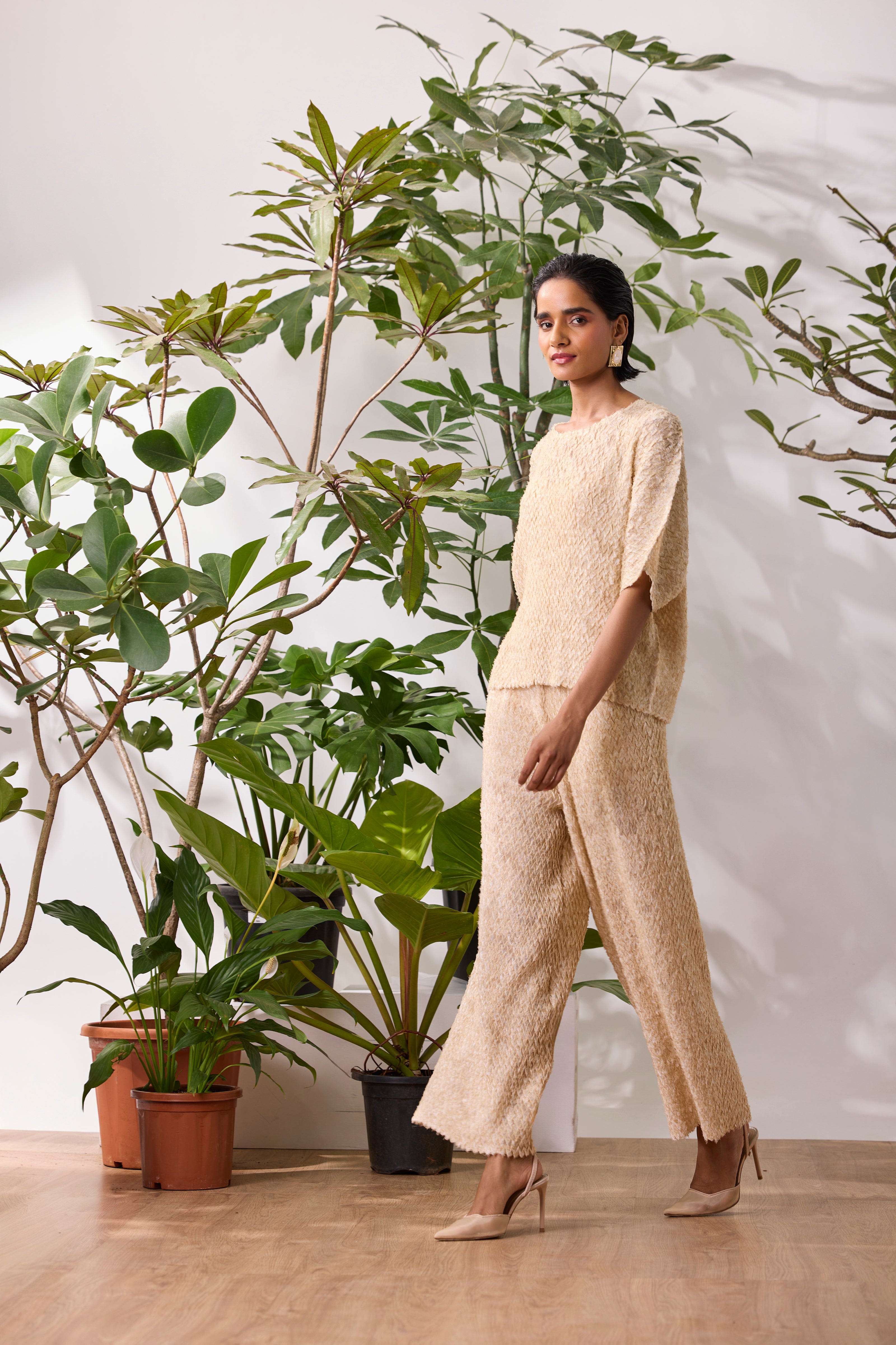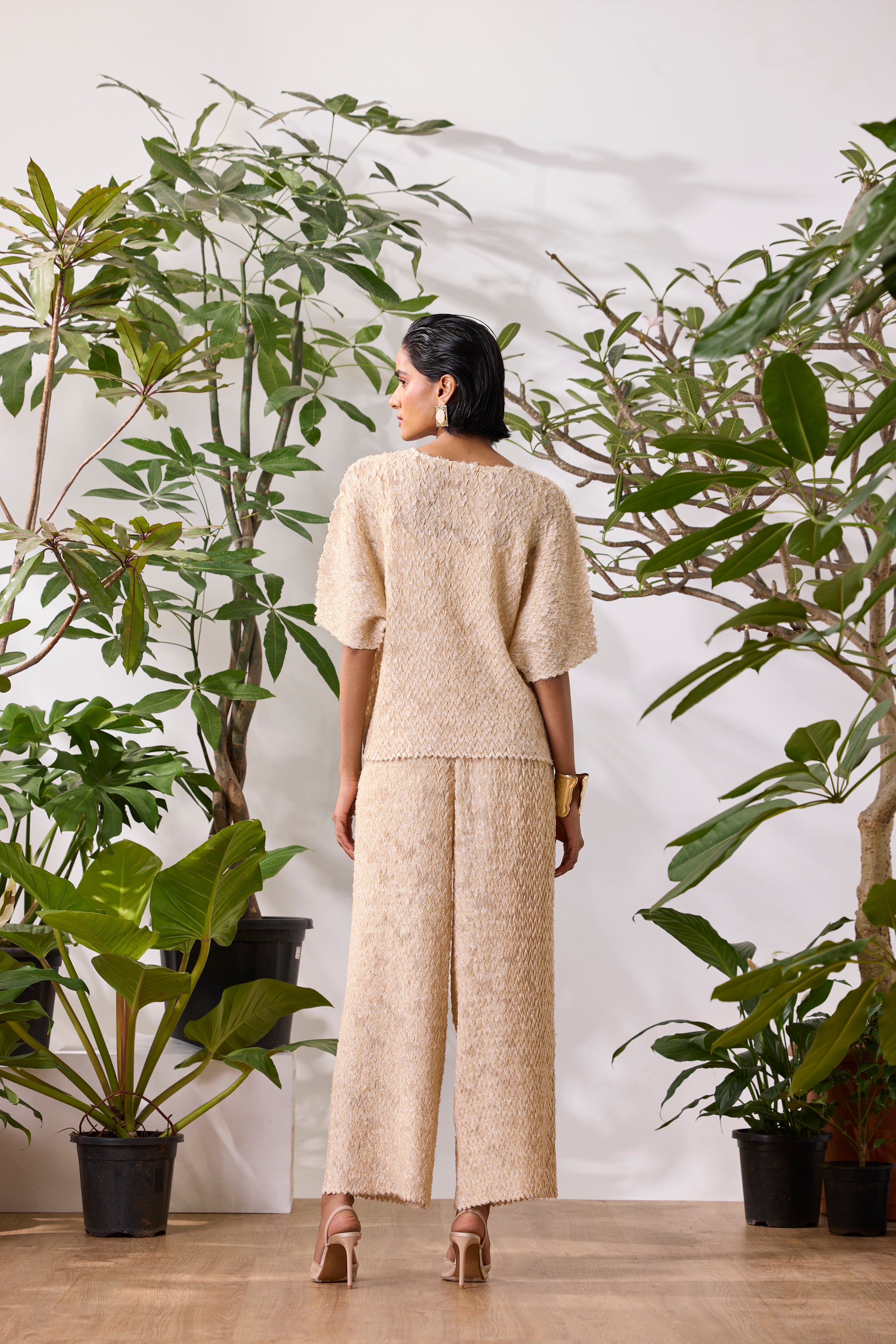 A co-ord set in textured pleated fabric featuring a relaxed top with wide sleeves and straight-fit pants for an effortless, modern silhouette.