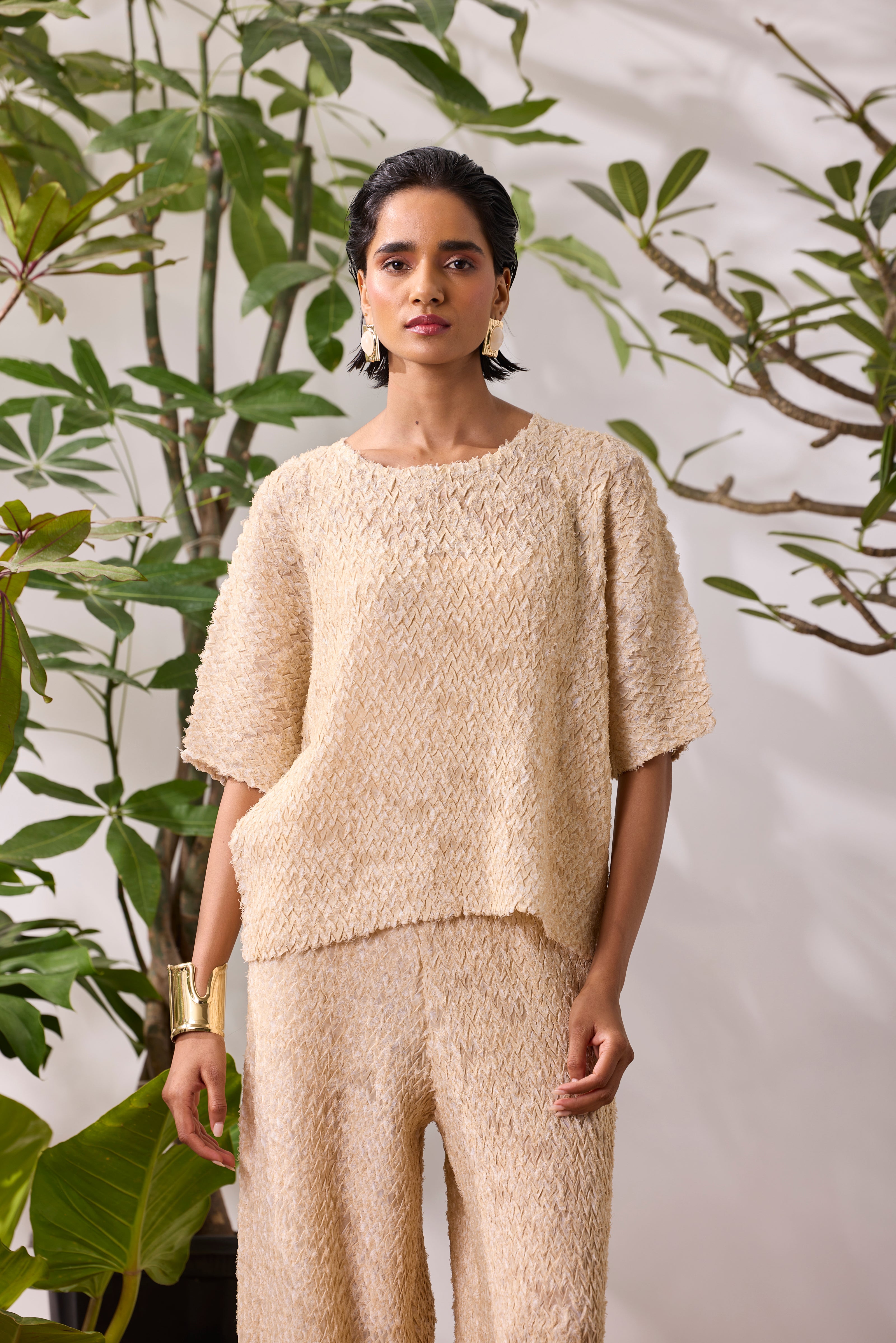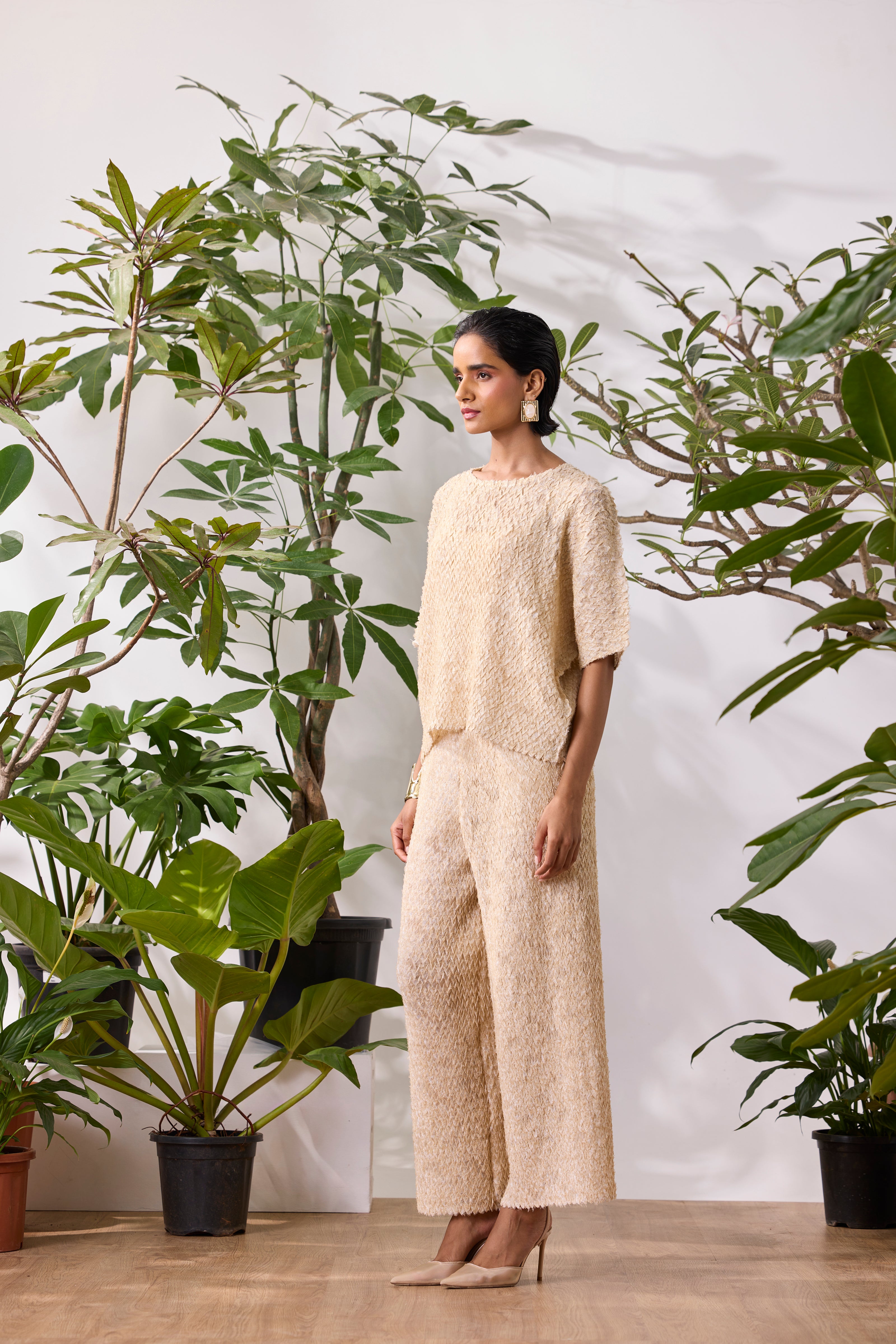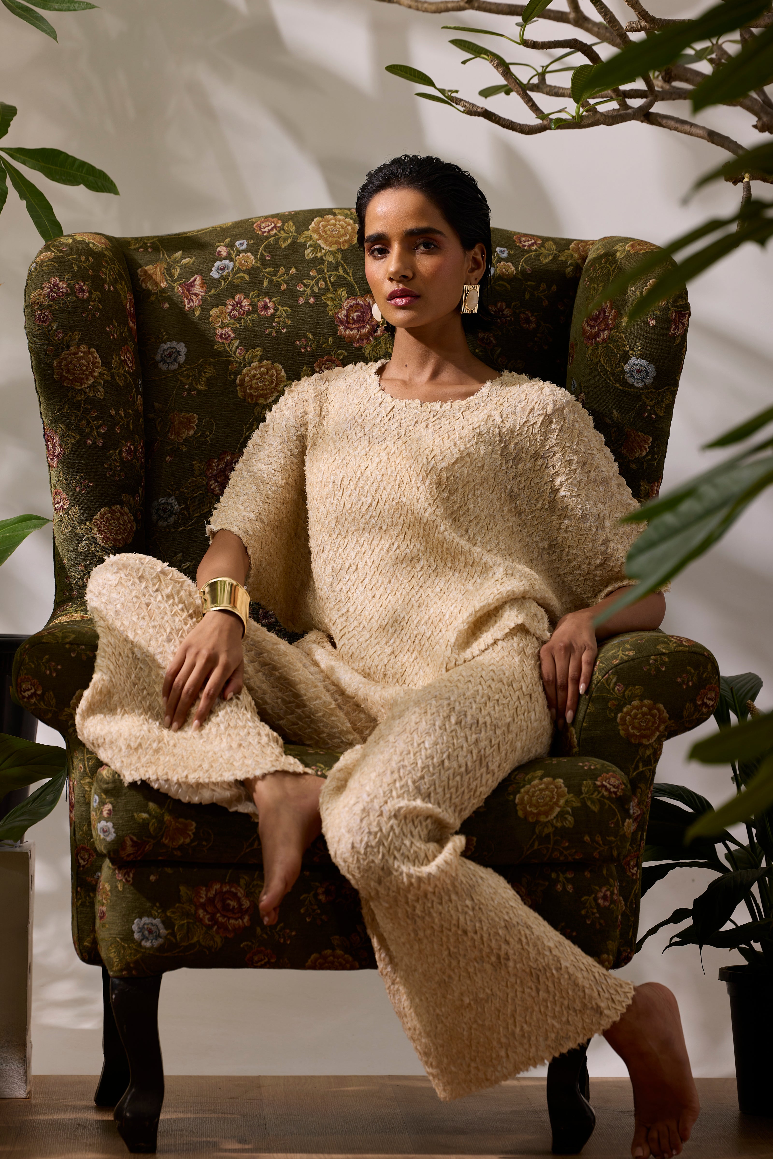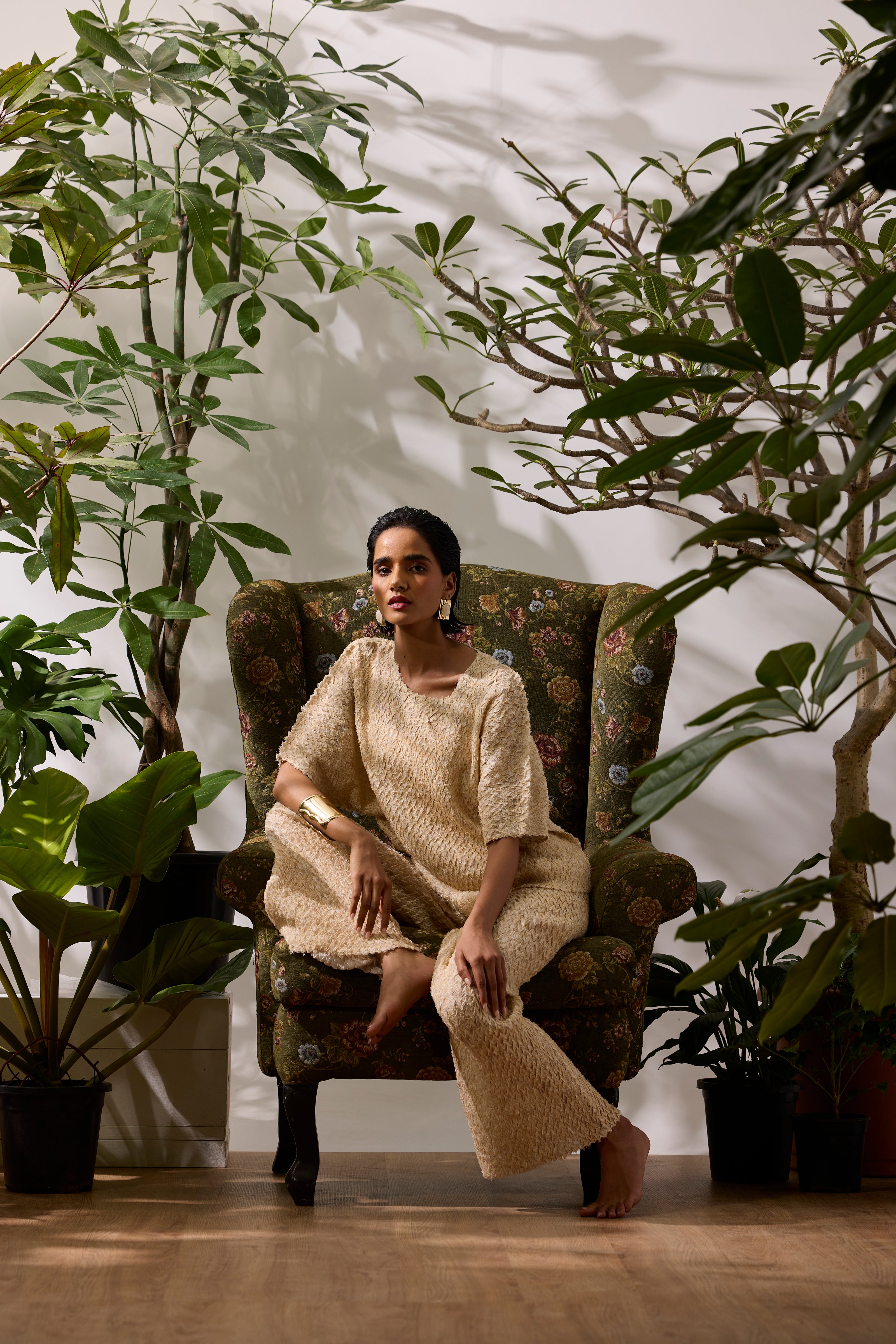 A co-ord set in textured pleated fabric featuring a relaxed top with wide sleeves and straight-fit pants for an effortless, modern silhouette.