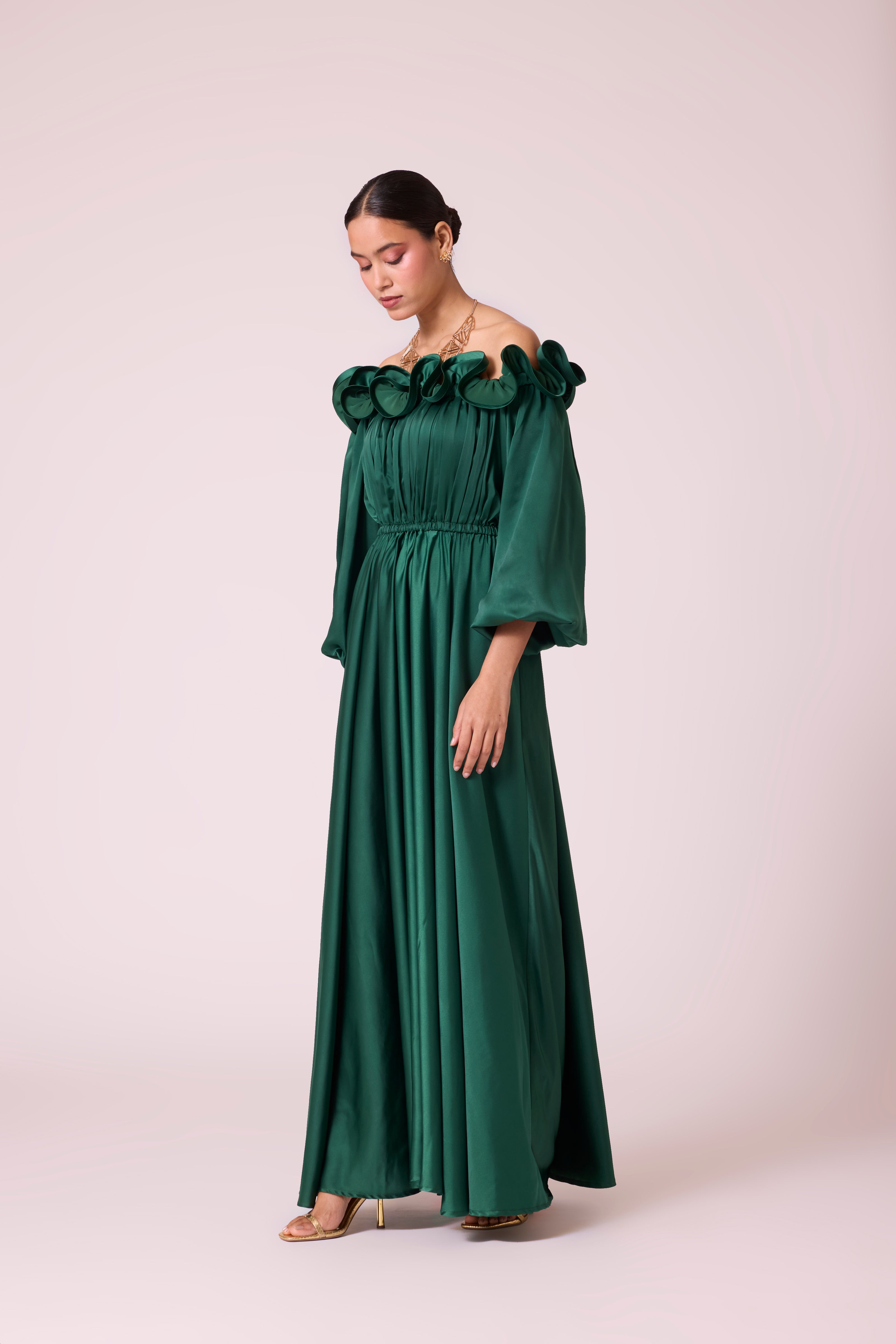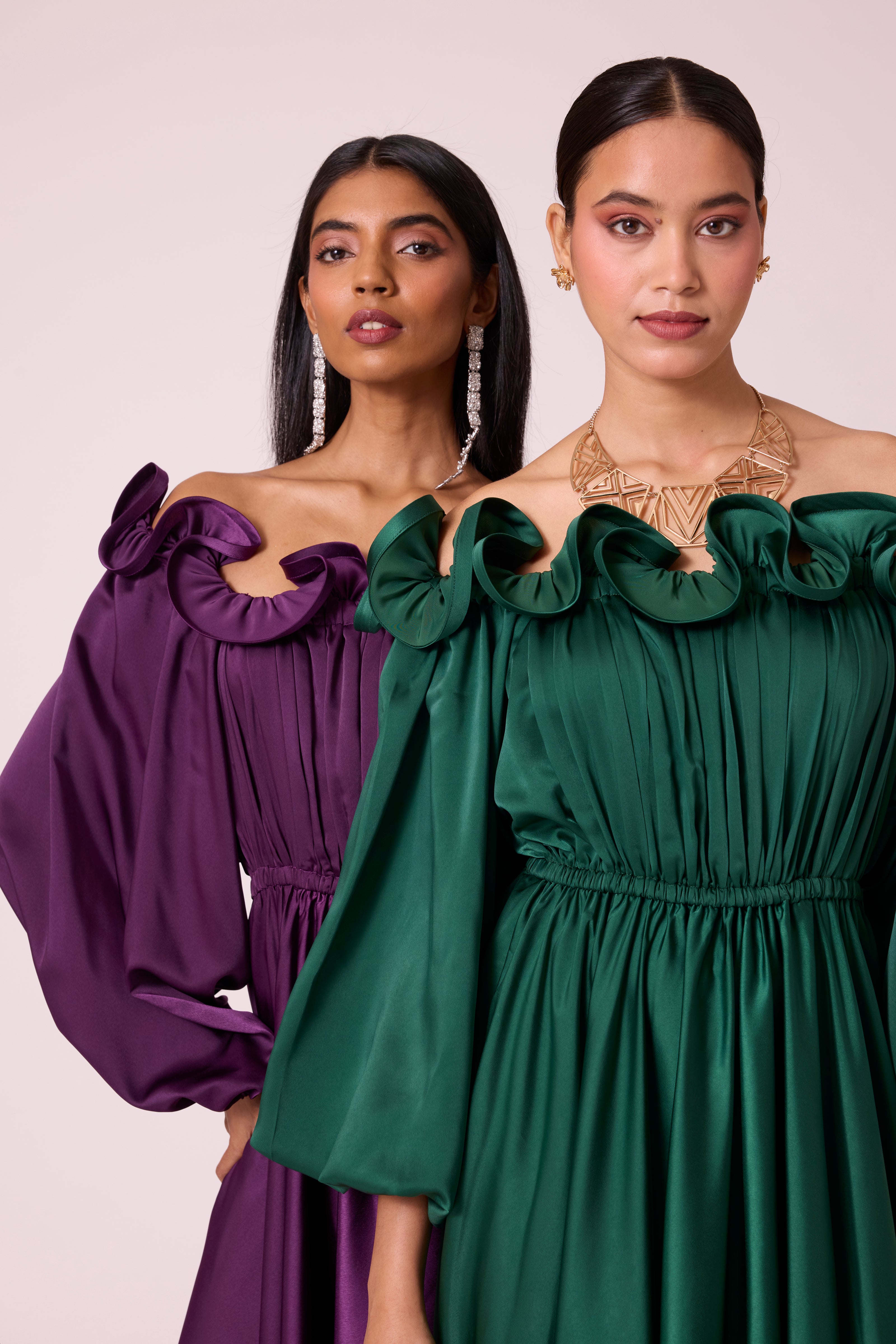 A statement full skirted satin maxi dress featuring structured ruffled off shoulder detailing over a naturally pleated elasticated bodice.