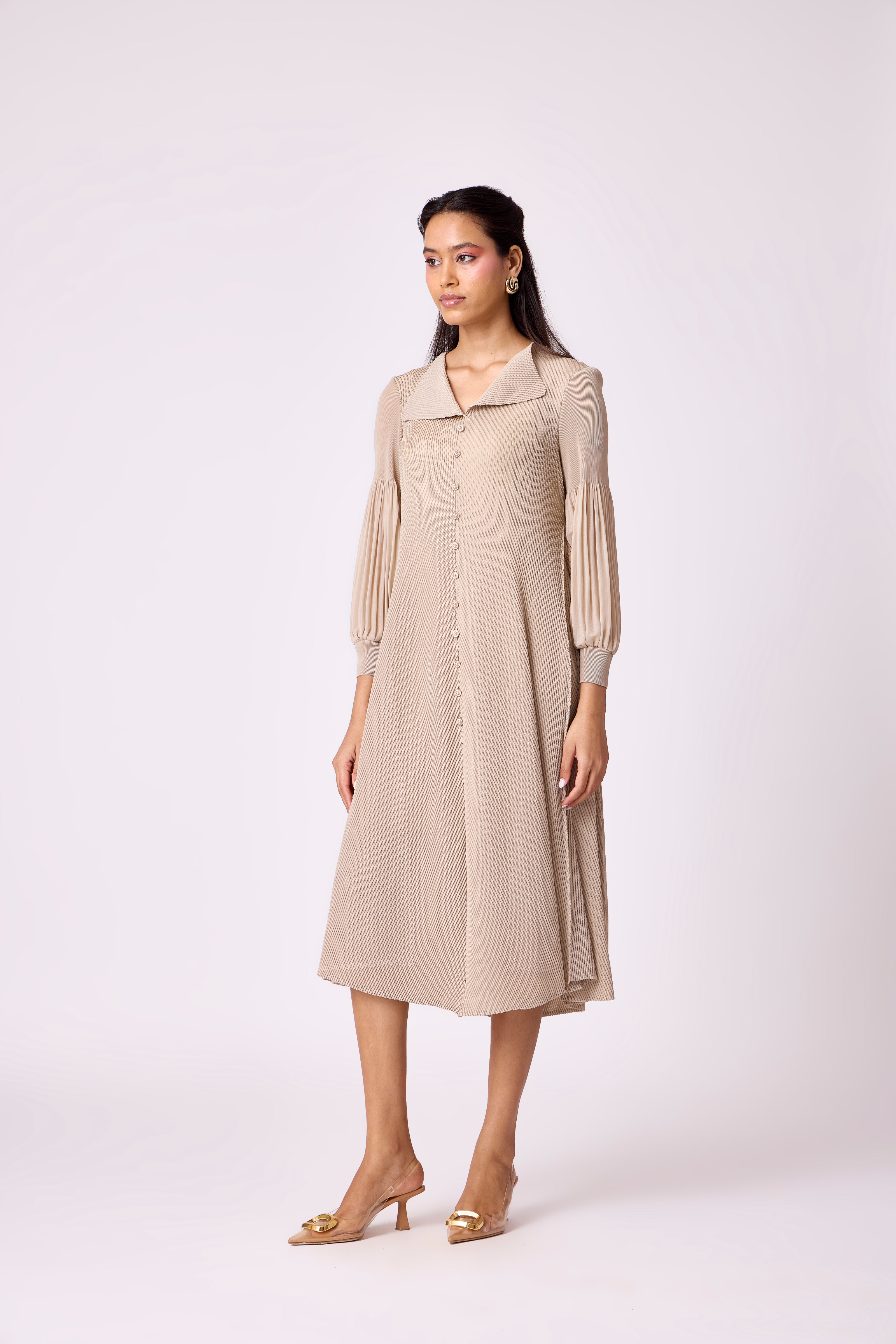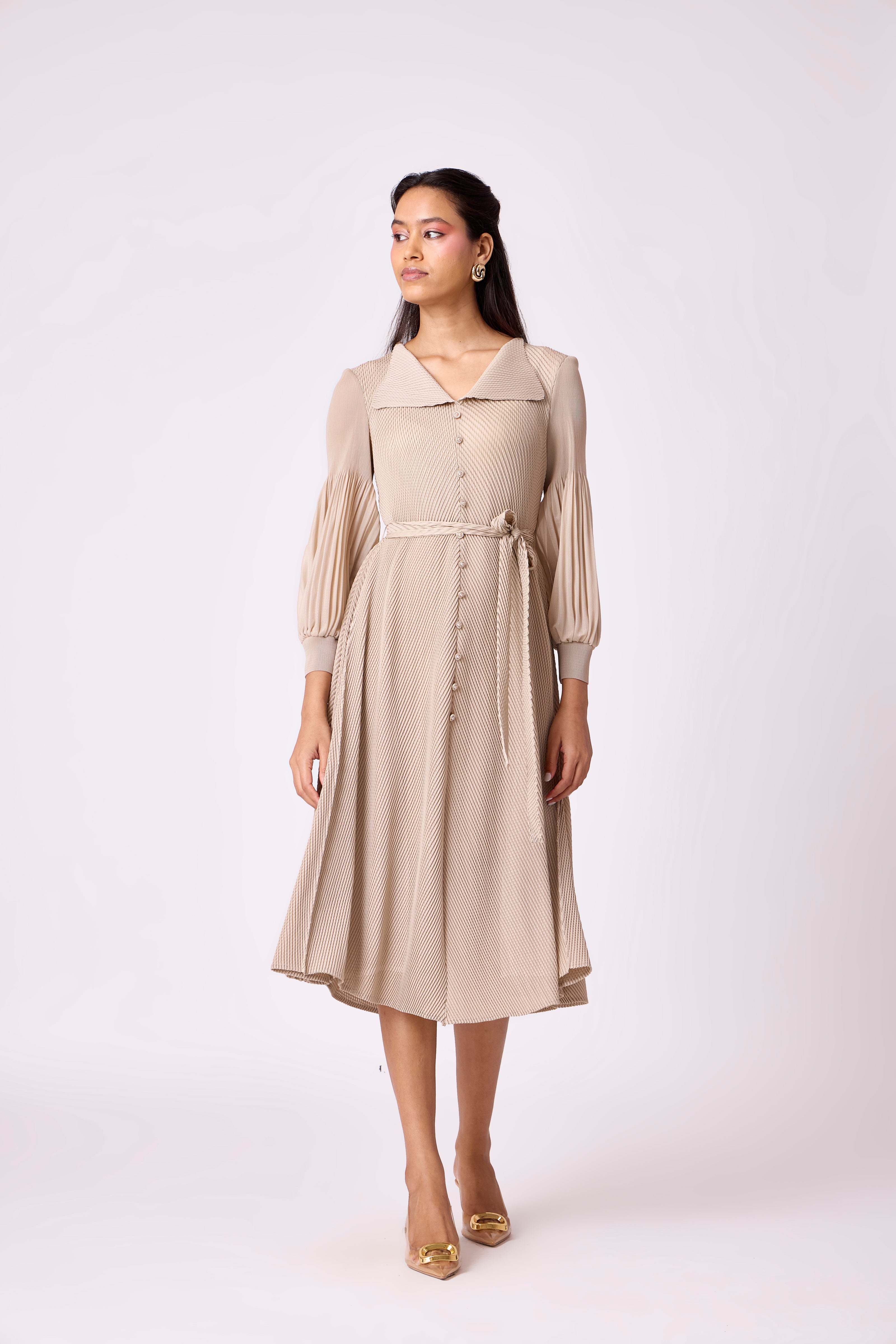 A classic midi dress with a wide open collar, soft gathered sleeves, and decorative front buttons. Comes with Self fabric tie belt for those who prefer a cinched waist.