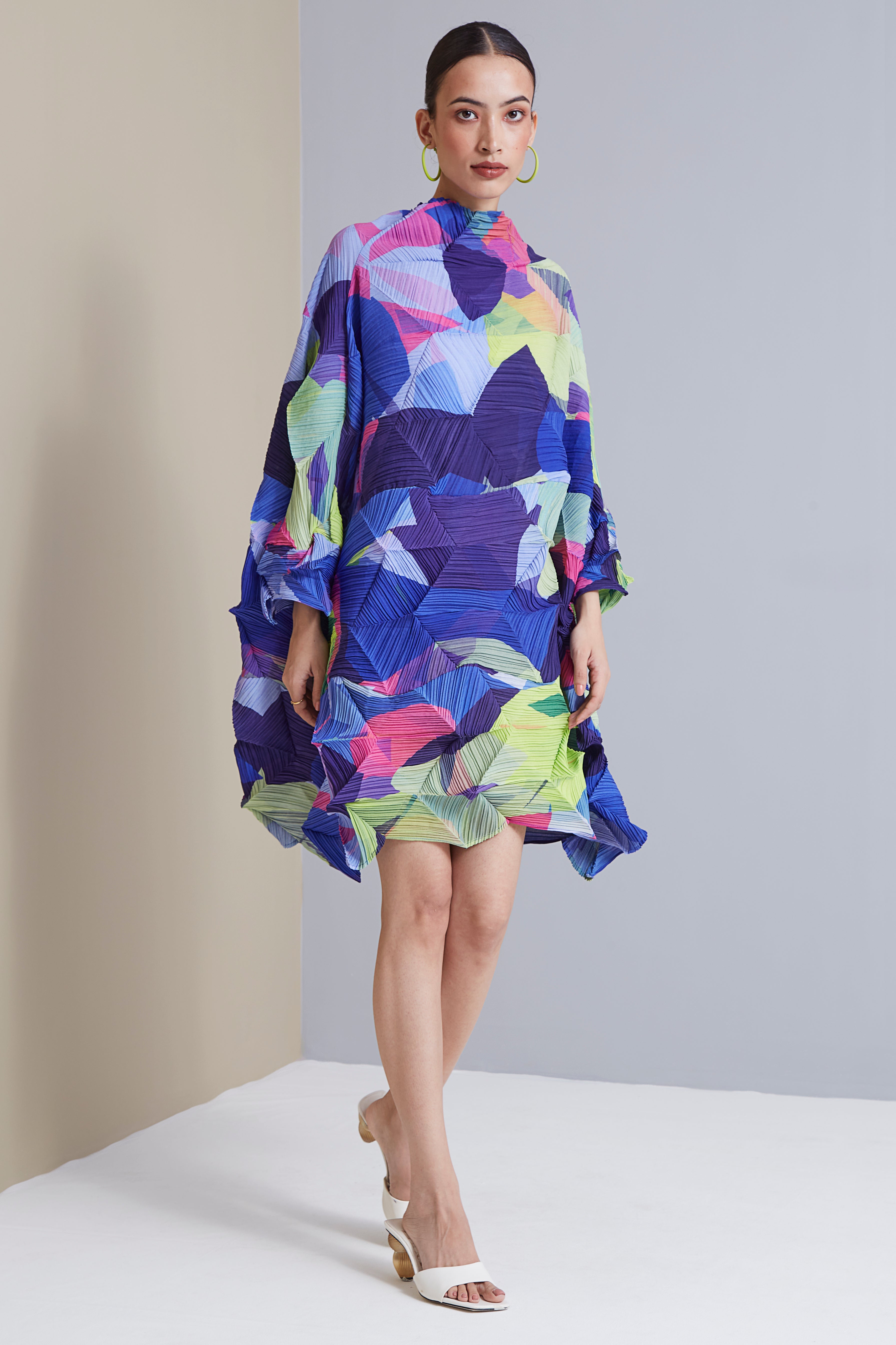 An Innovative 3D pleating technique on a lightweight fabric makes this a statement top in a multi-colored abstract print, which can be styled with a belt or your go-to denim.