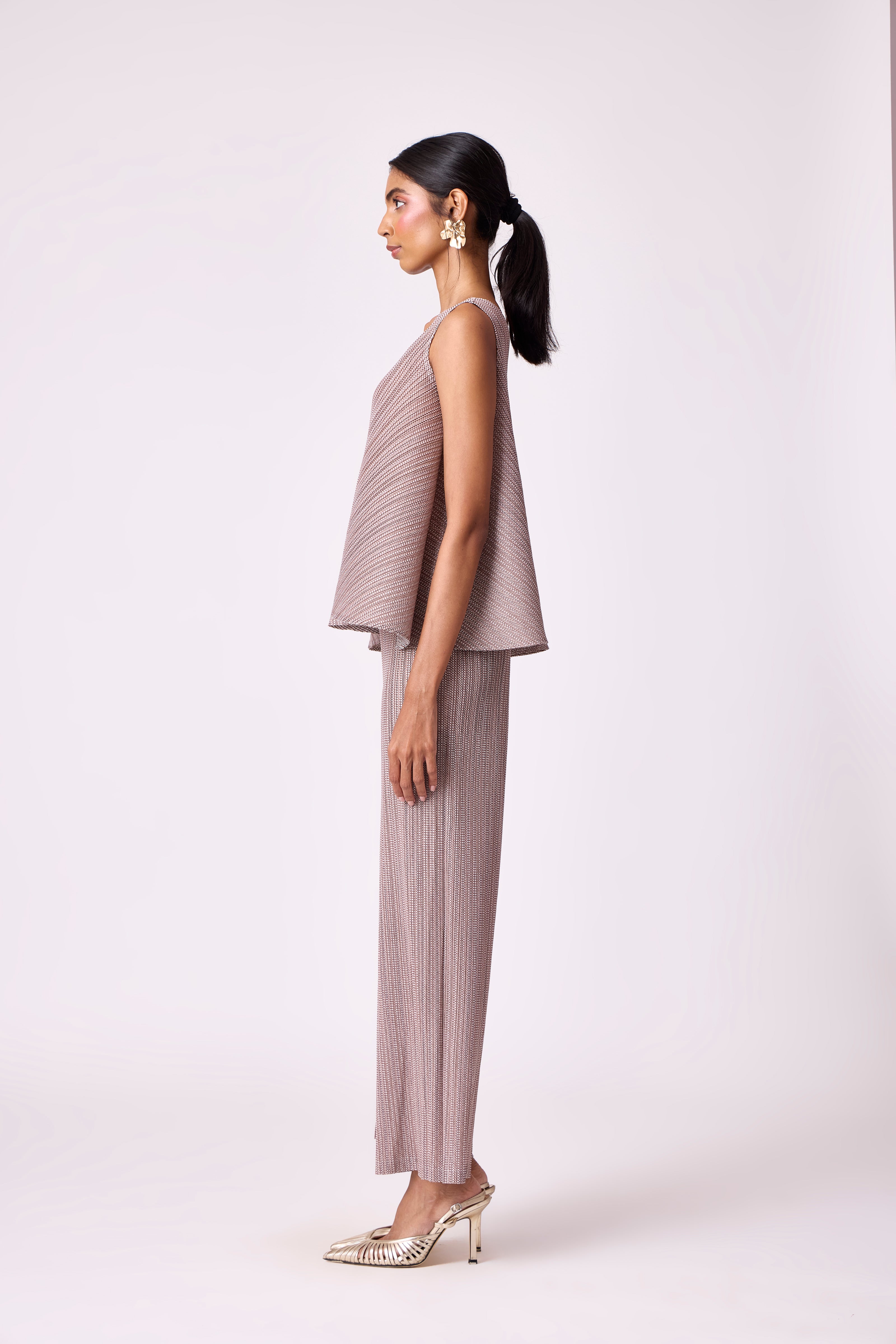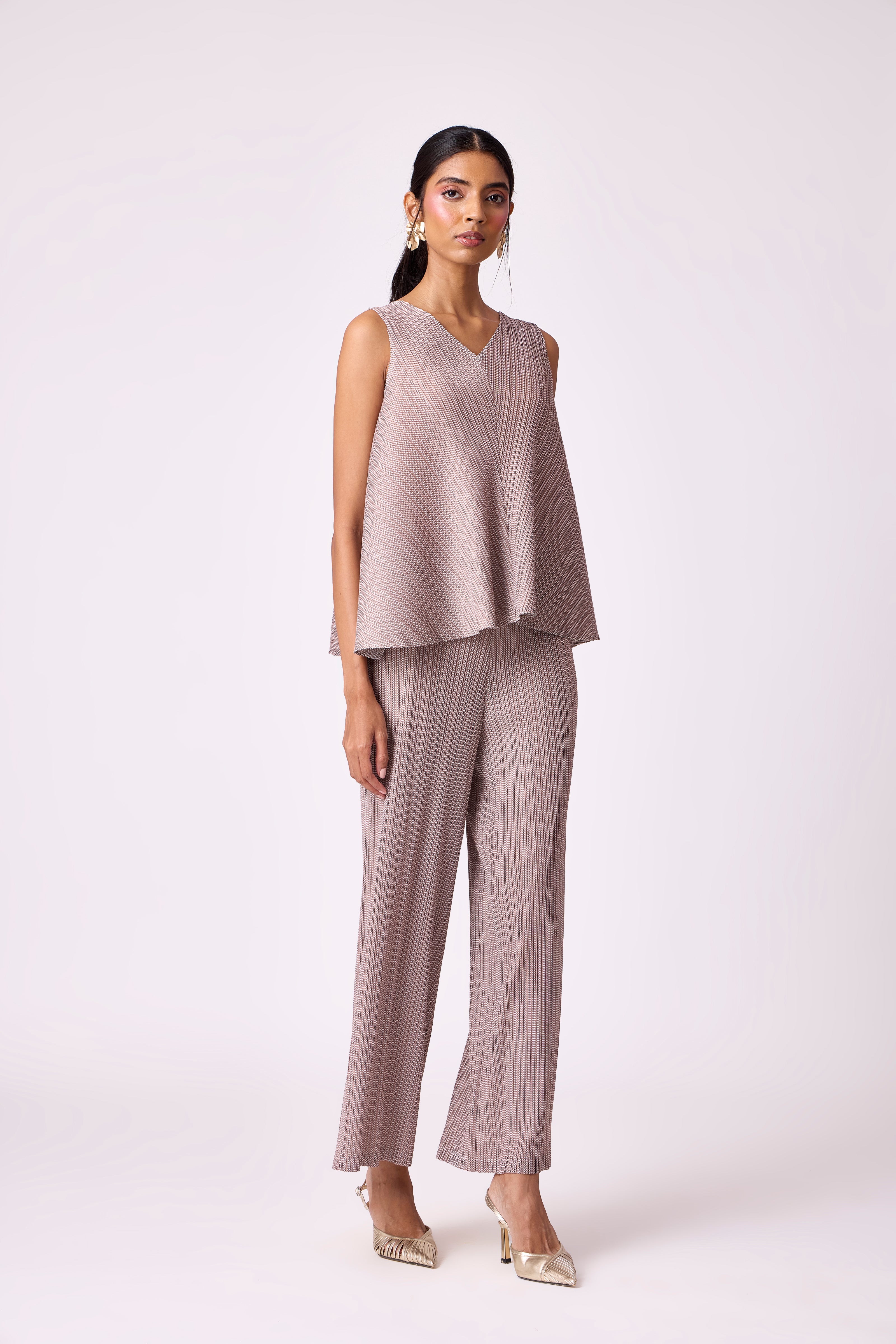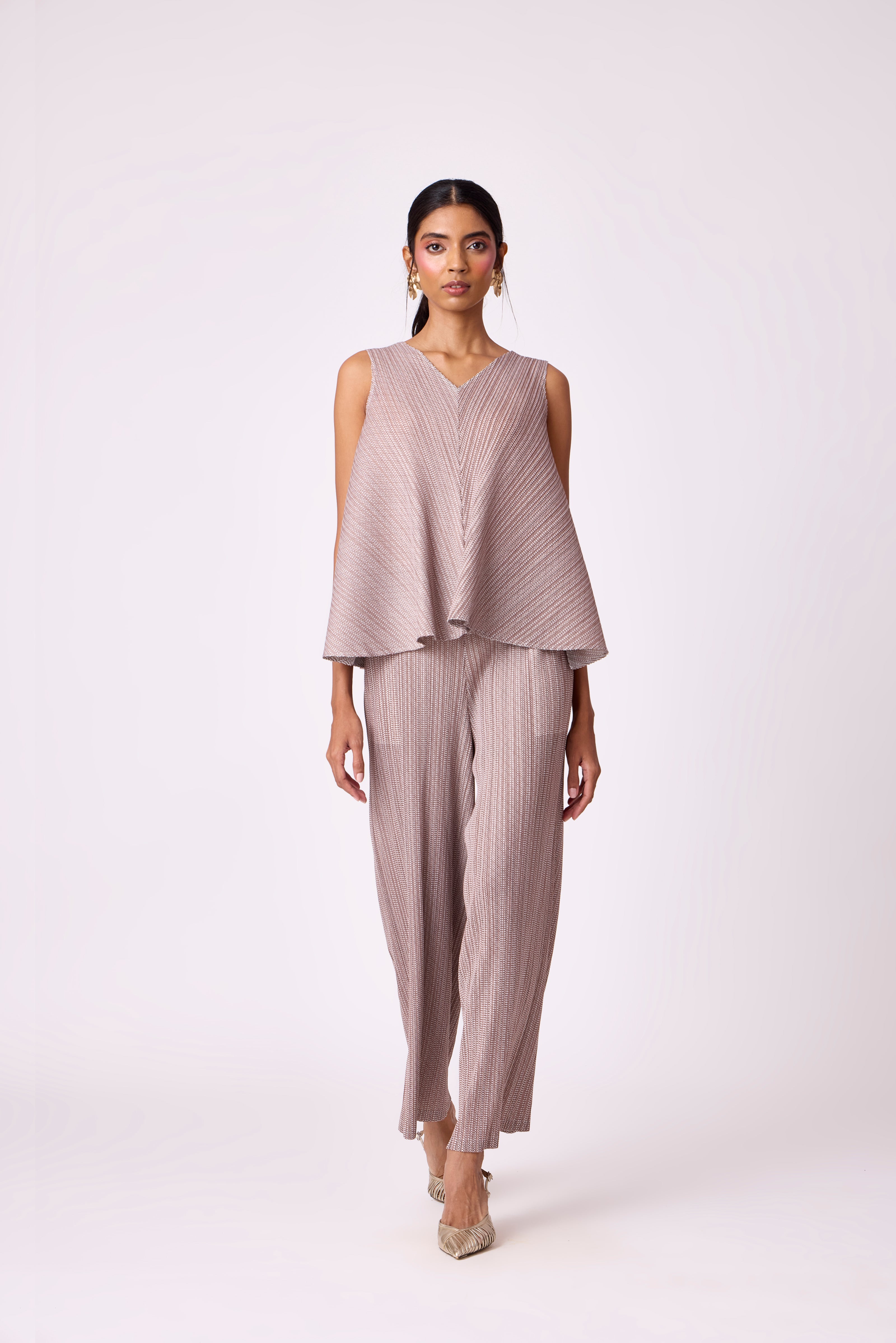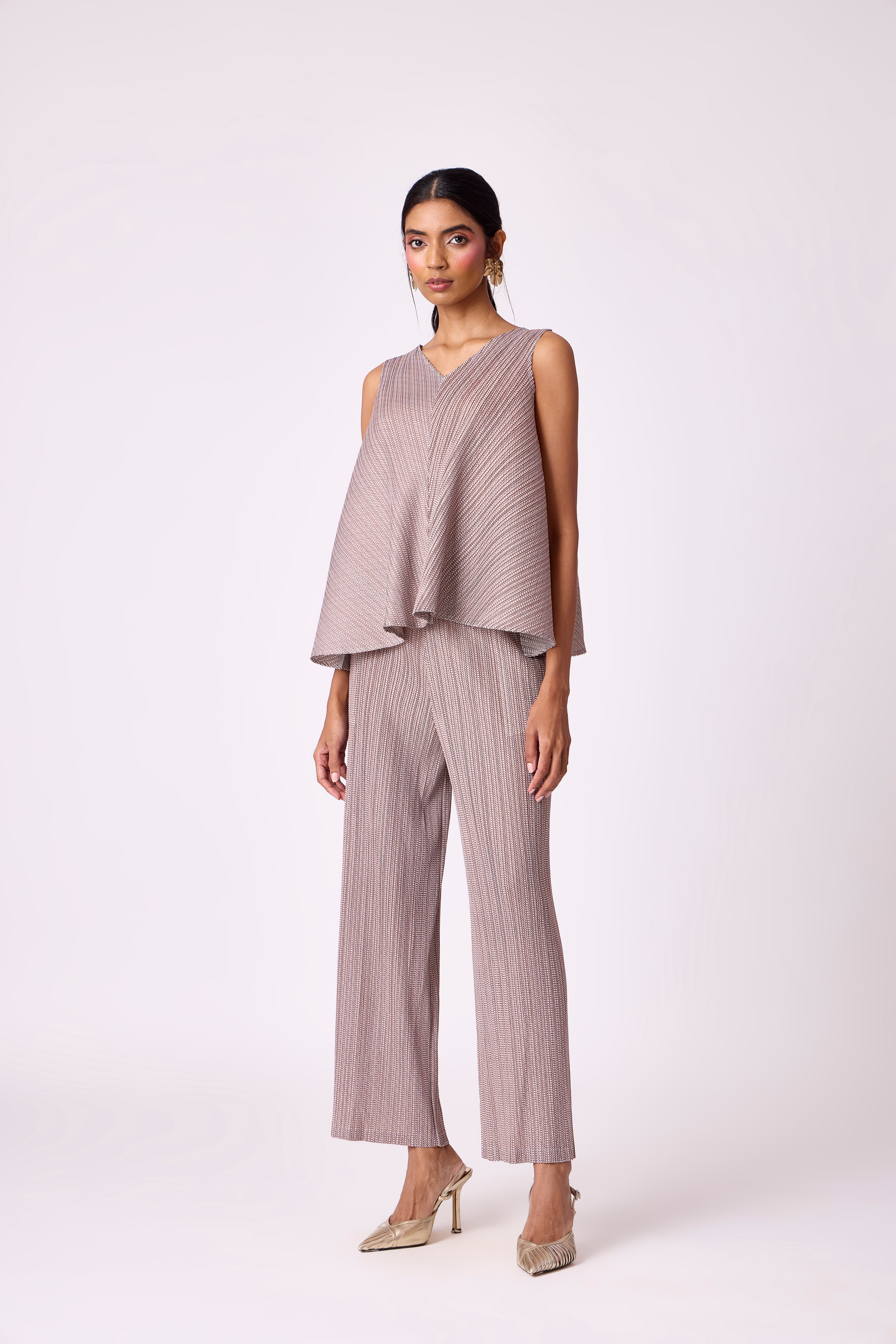 A breezy V neck top and straight leg pant in soft light pleated fabric. ...