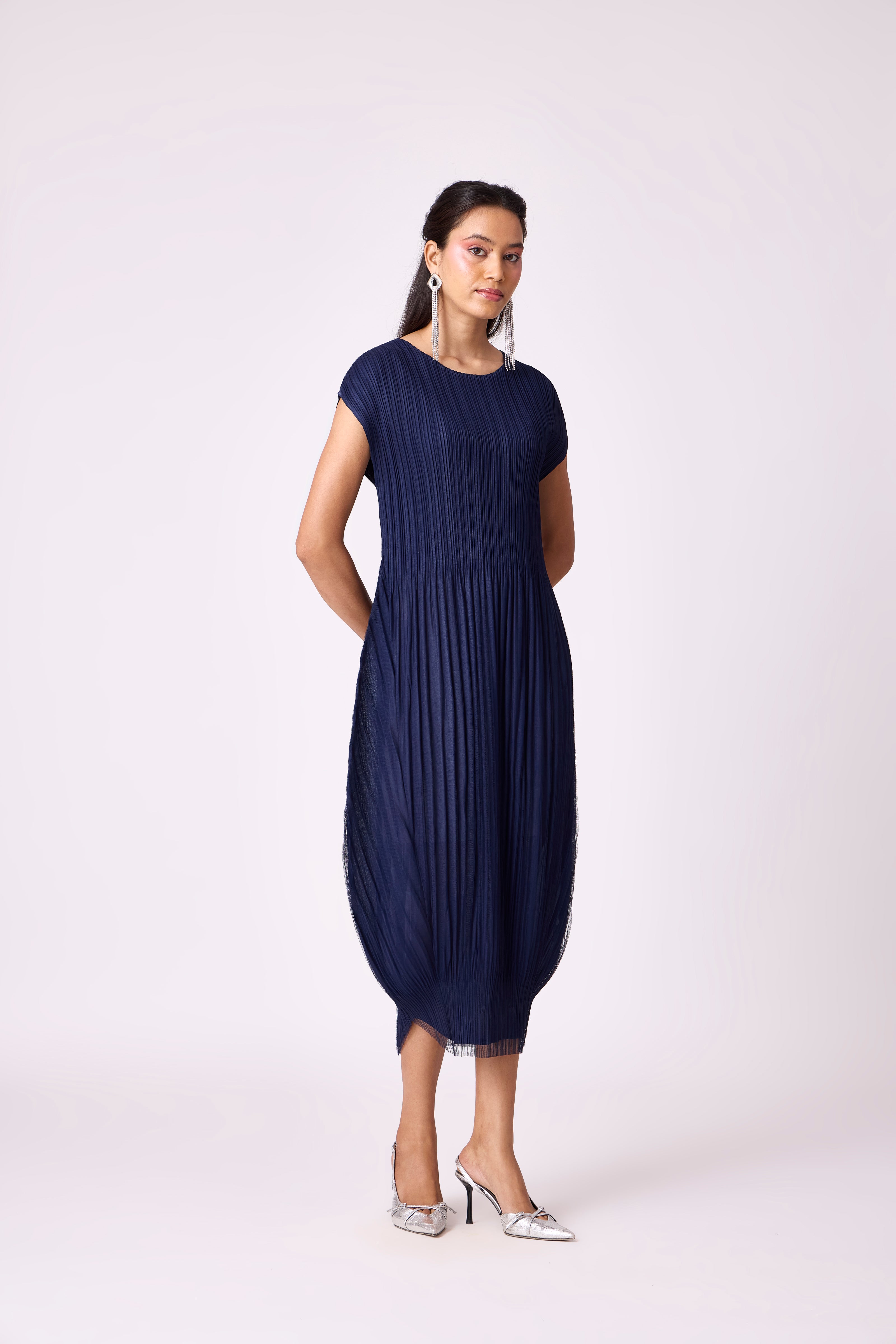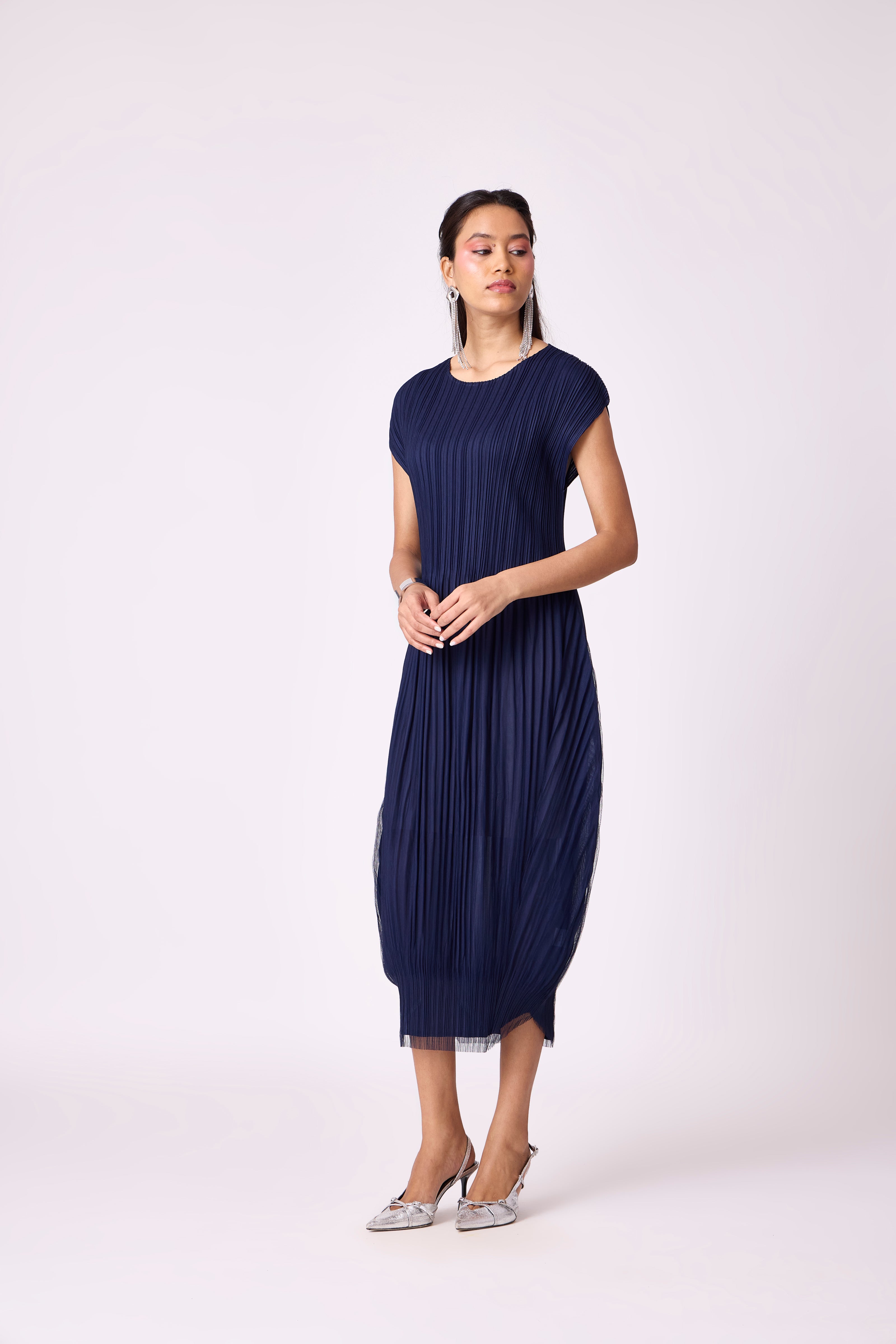 A modern barrel shift silhoutte softened with a layer of tulle over micro-pleats.