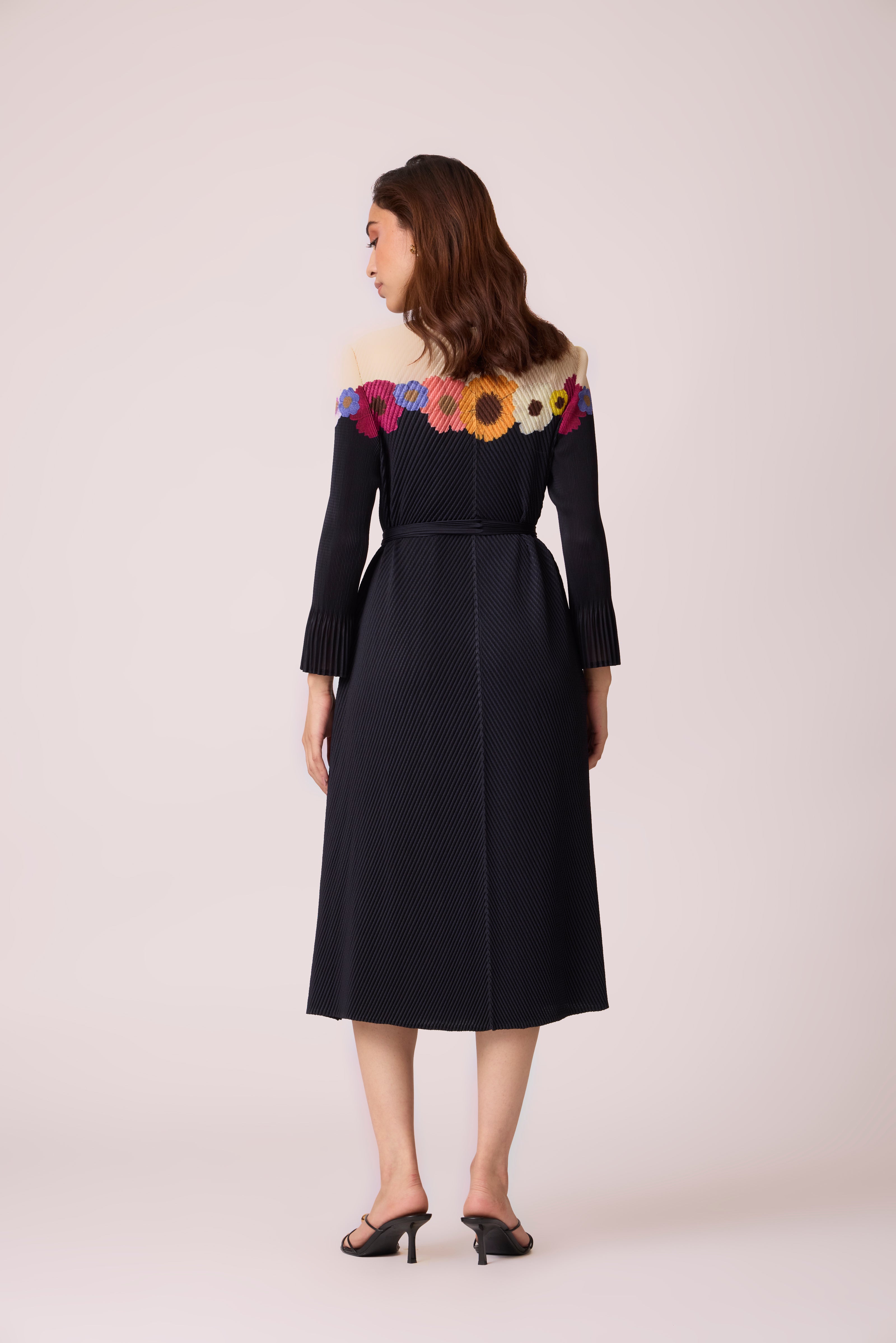 A charming pleated floral colour block printed A line dress. Comes with a same fabric belt for those who want a more fitted look.