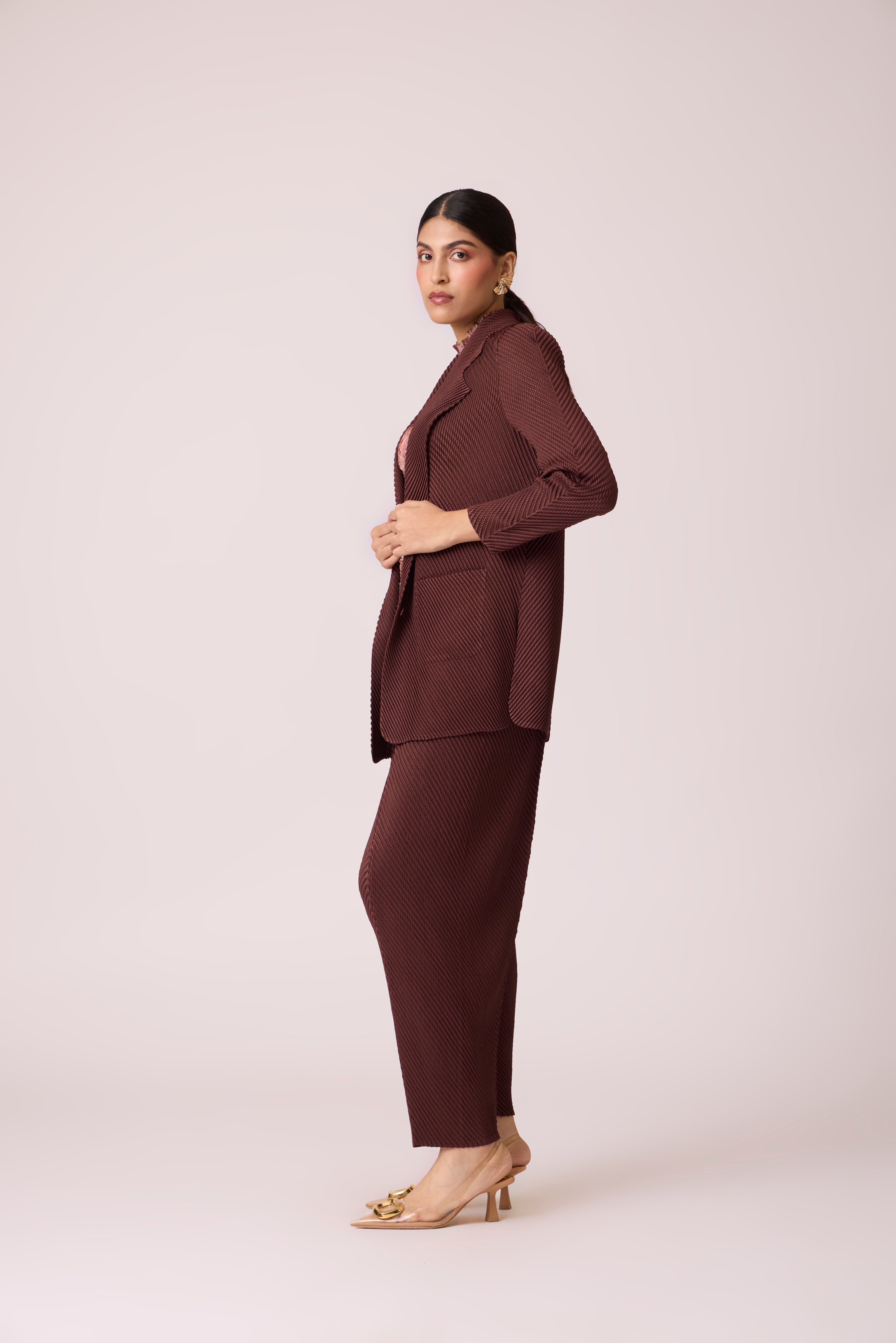 A lightweight blazer set in the new novel scaled pleating technique. Pair it with fitted, textured or fitted tank top for an elevated formal look.