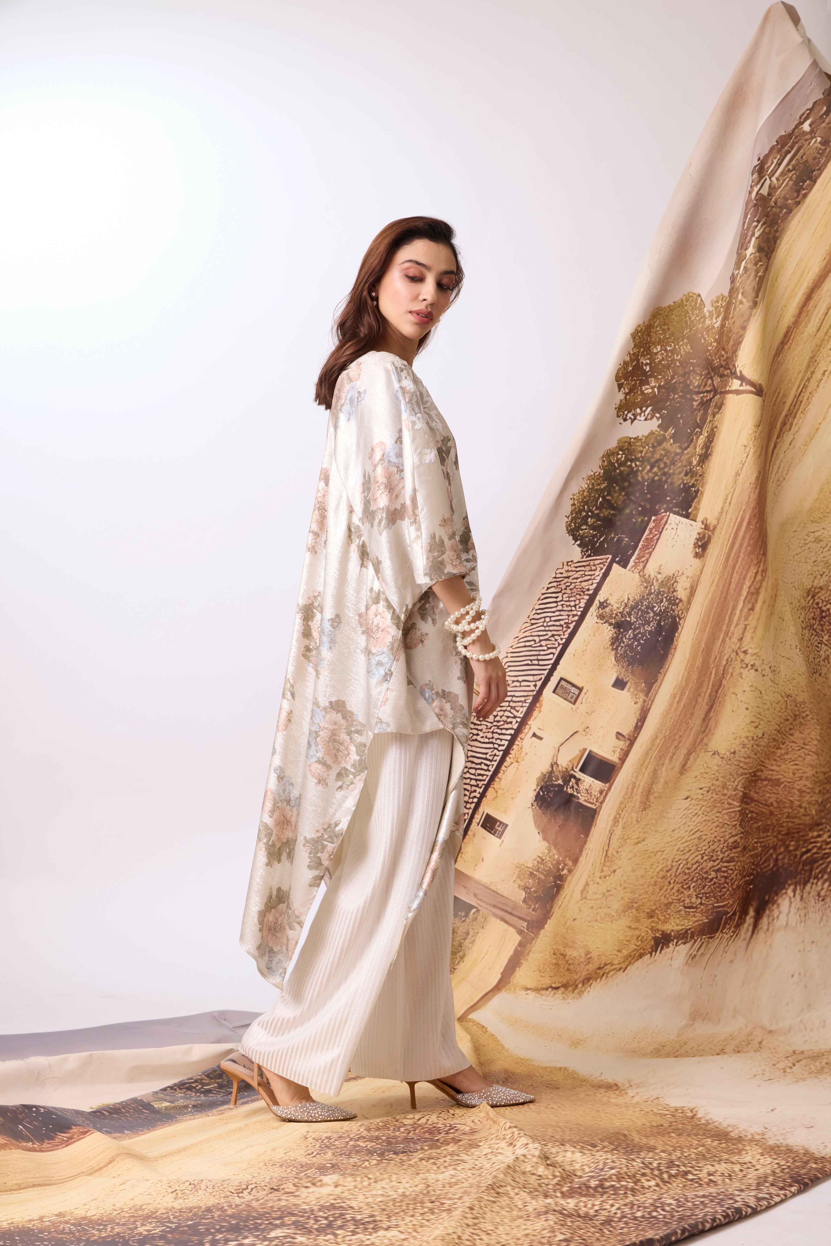 An elegant asymmetric paneled tunic with dolman sleeves, short on one side, long draped cowl on the other and highlighted with sequined hand embroidery. Paired with our wide leg classic comfortable knit pants.