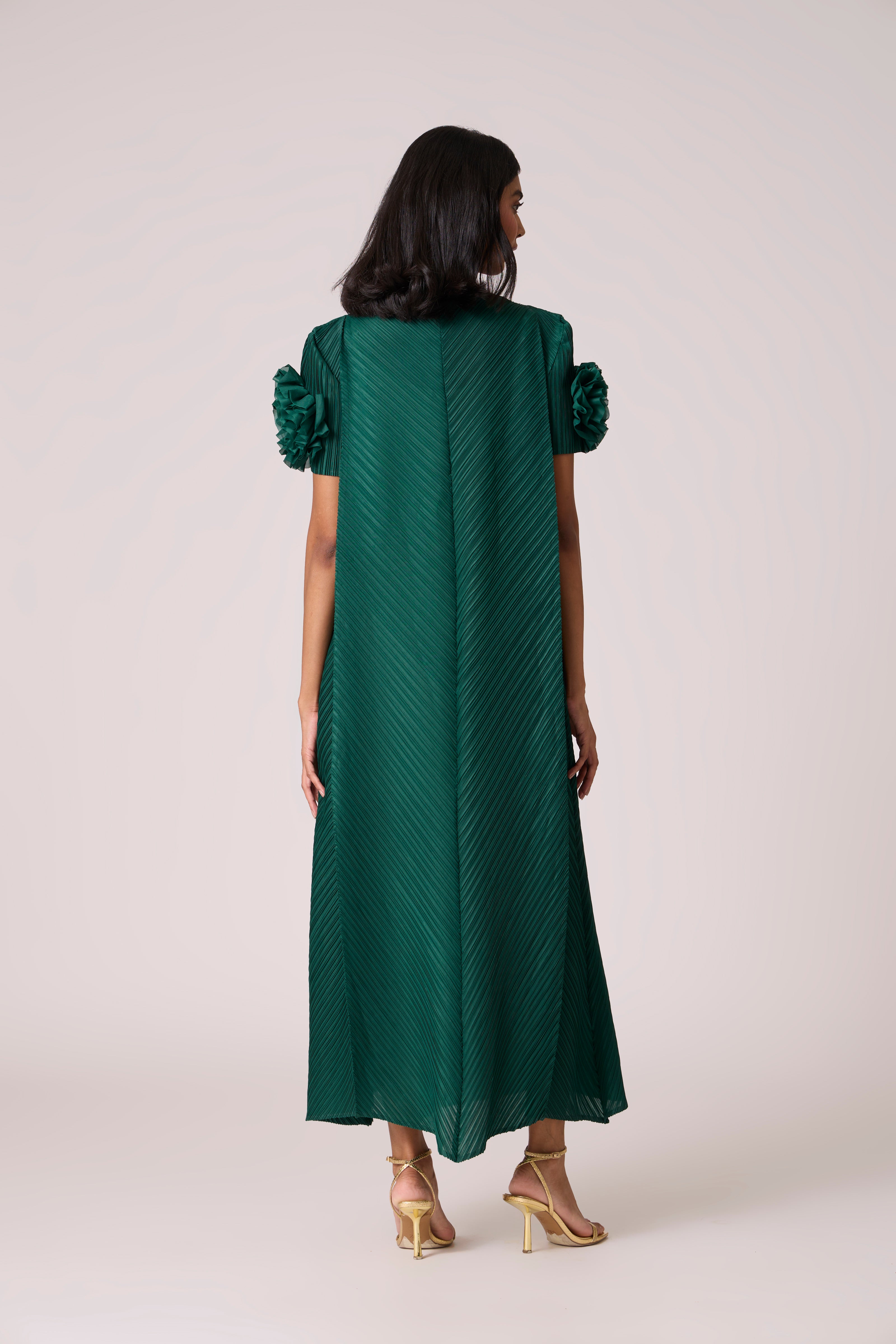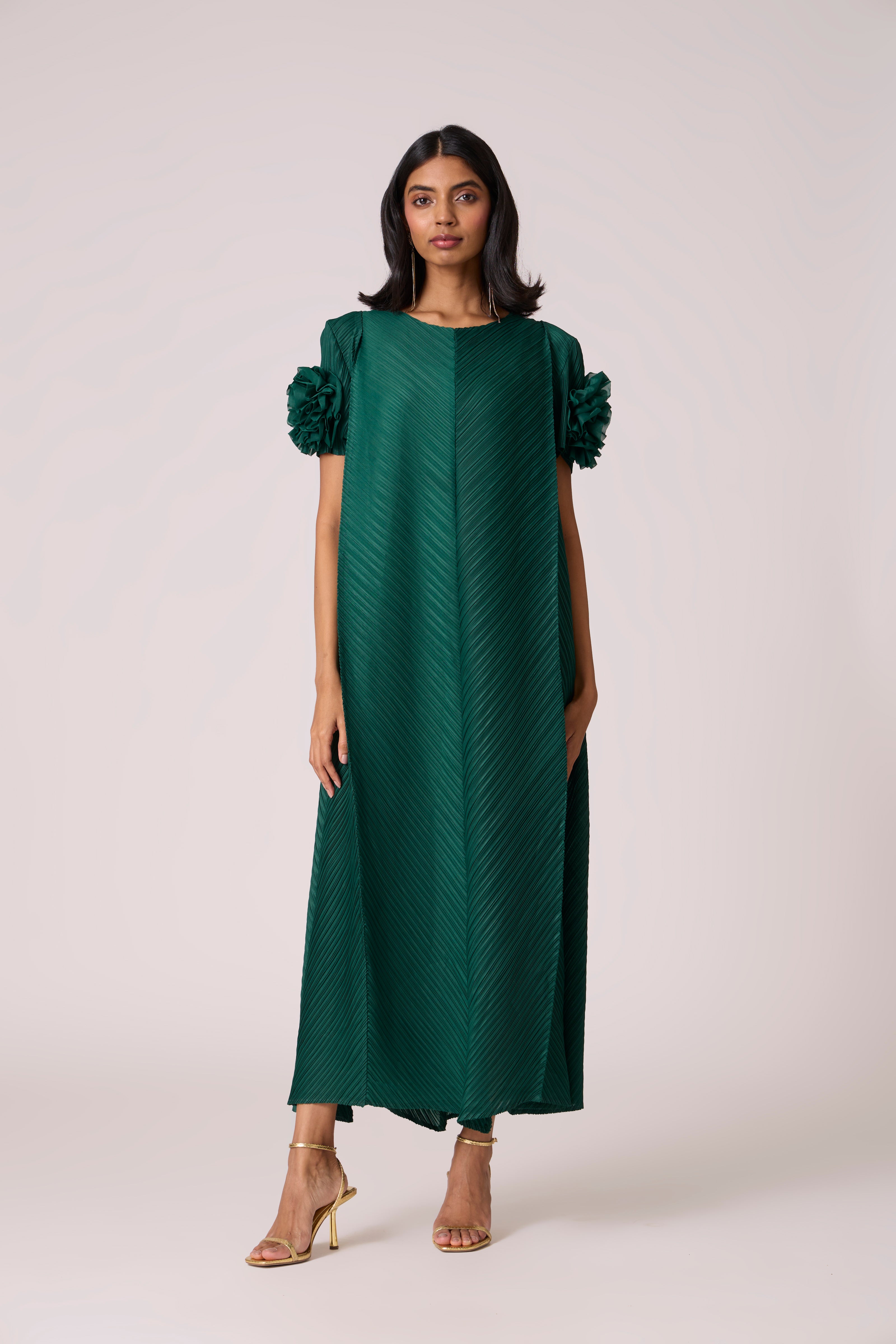 A statement a-line dress cut in panels with detailed rouched fabrics trim at the end of the sleeves to give a 3D look.
