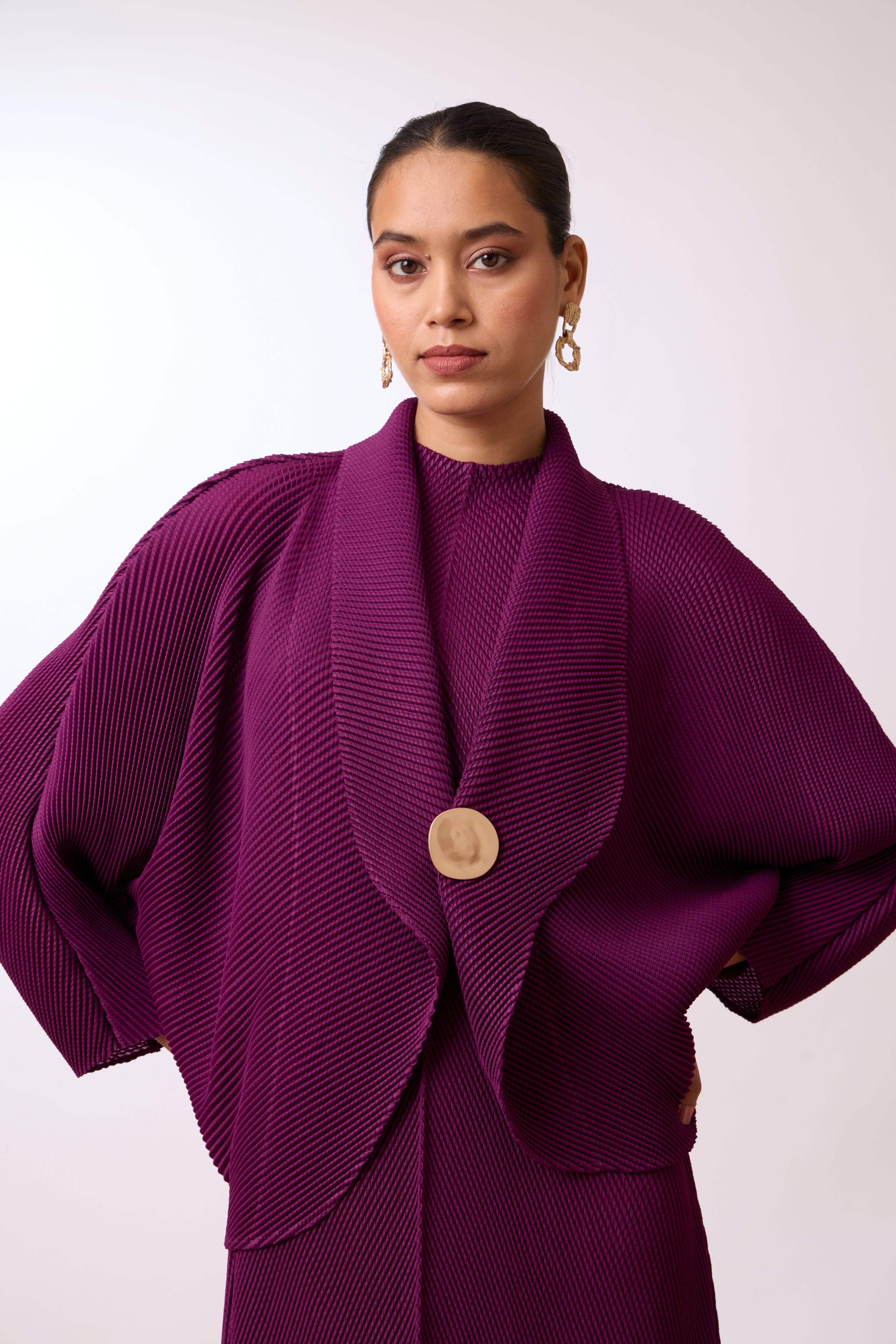 A sleeveless fit and flare dress with a matching batwing cape overlay with a striking matte gold button closure.