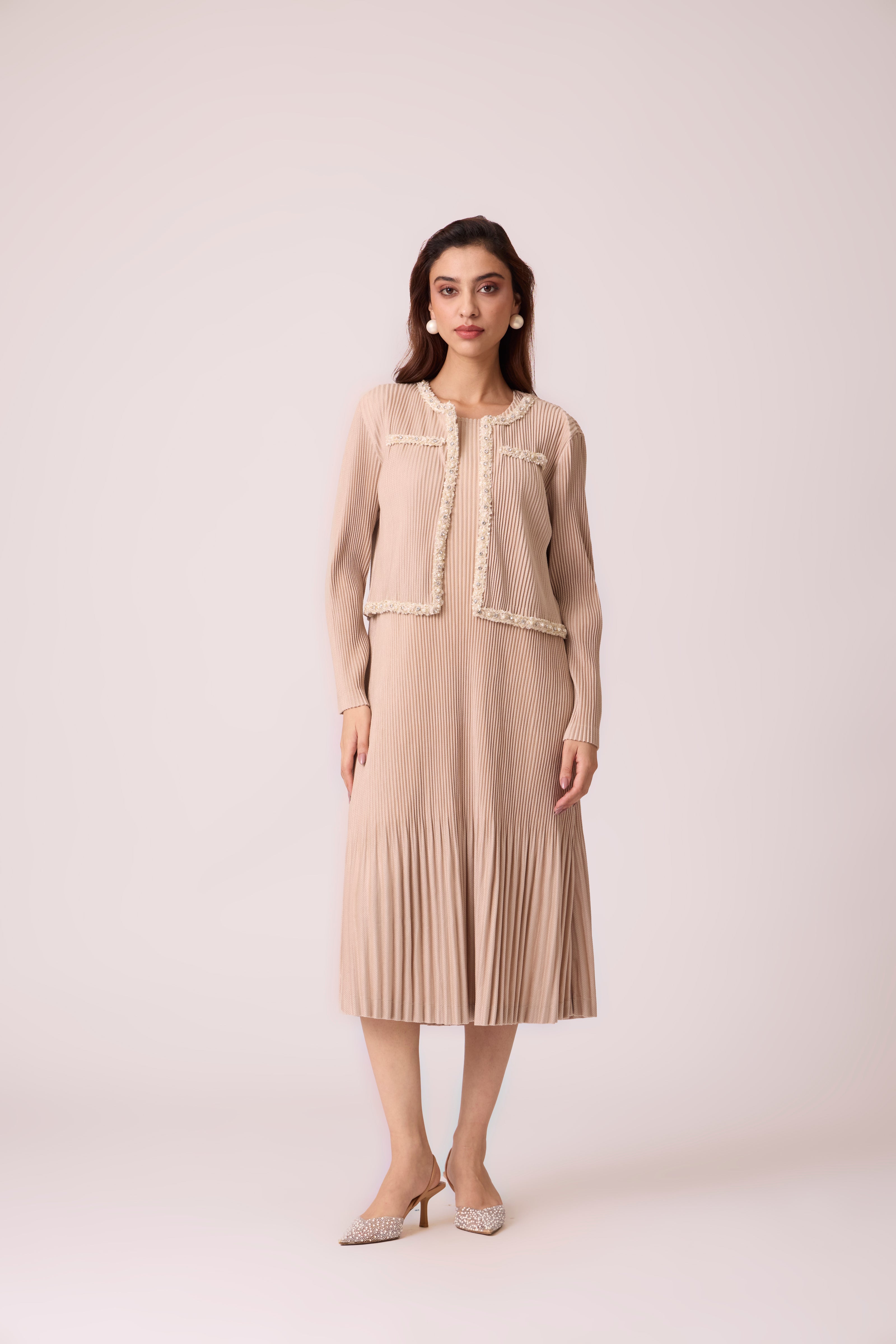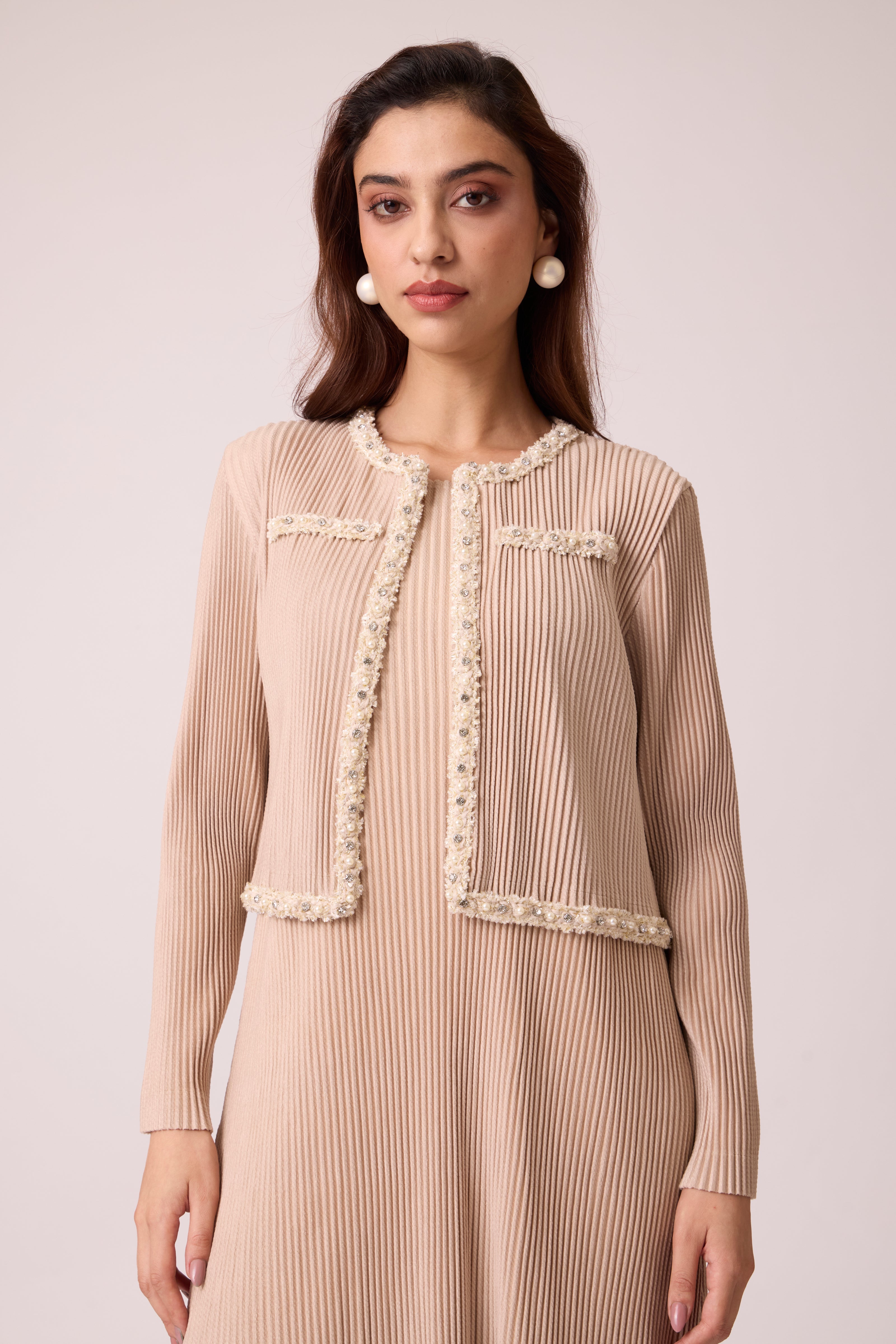 Continuing to draw on the Chanel-esque vibe with this knit pleated sleeveless A line dress paired with an open jacket with peal and diamanté studded lace detail.