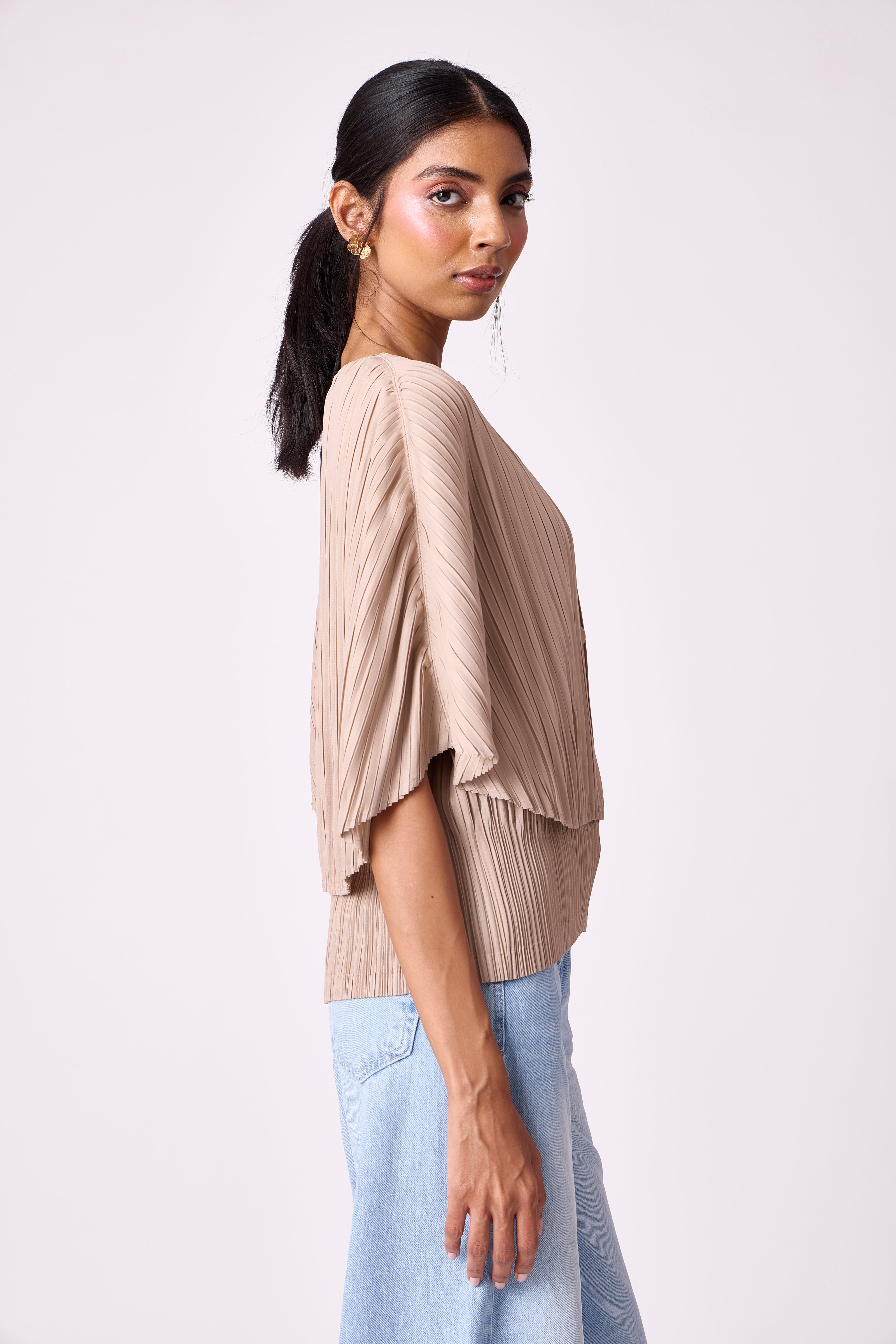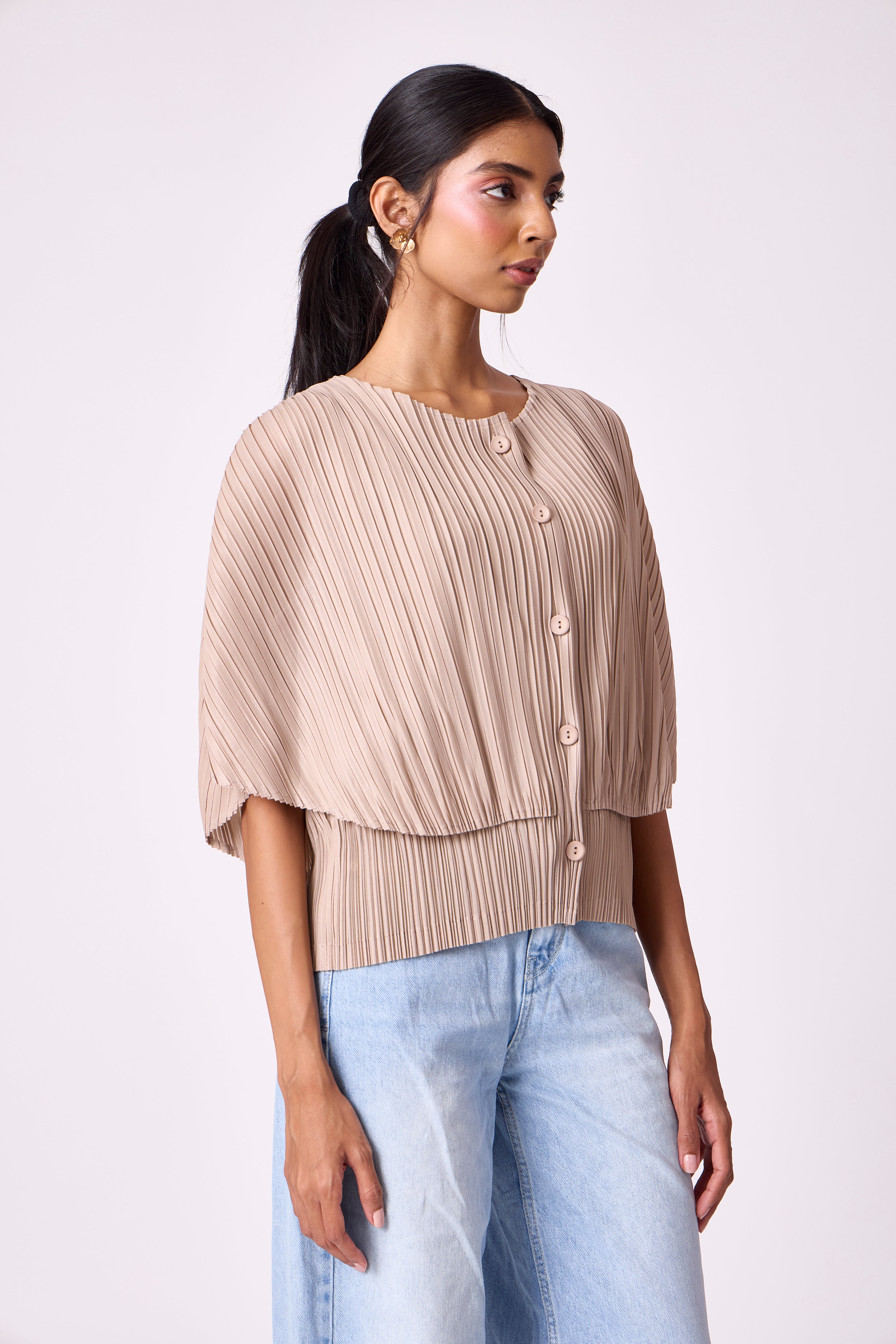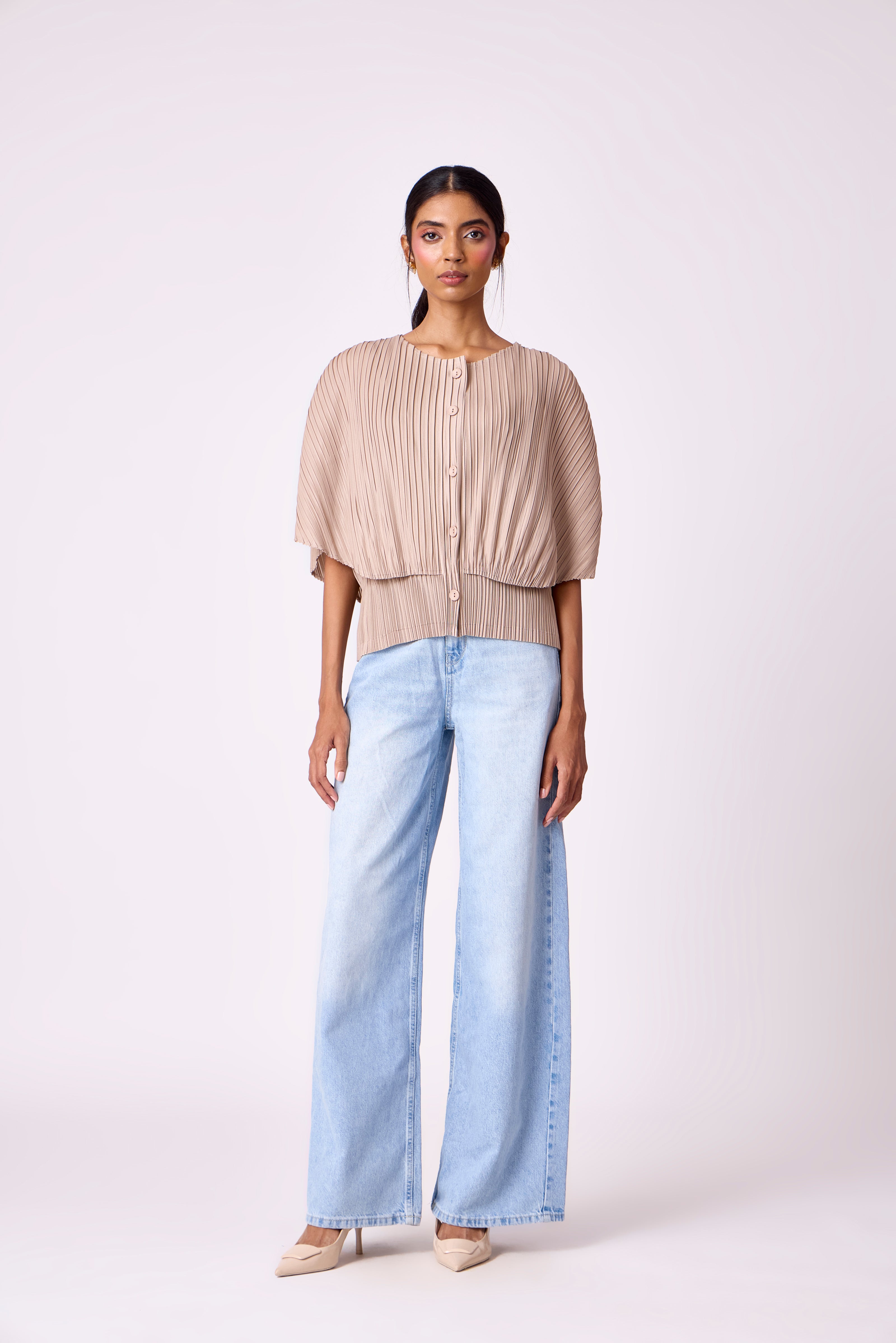 A relaxed pleated top with a front button closure, rounded neckline, and fluid sleeves. ...